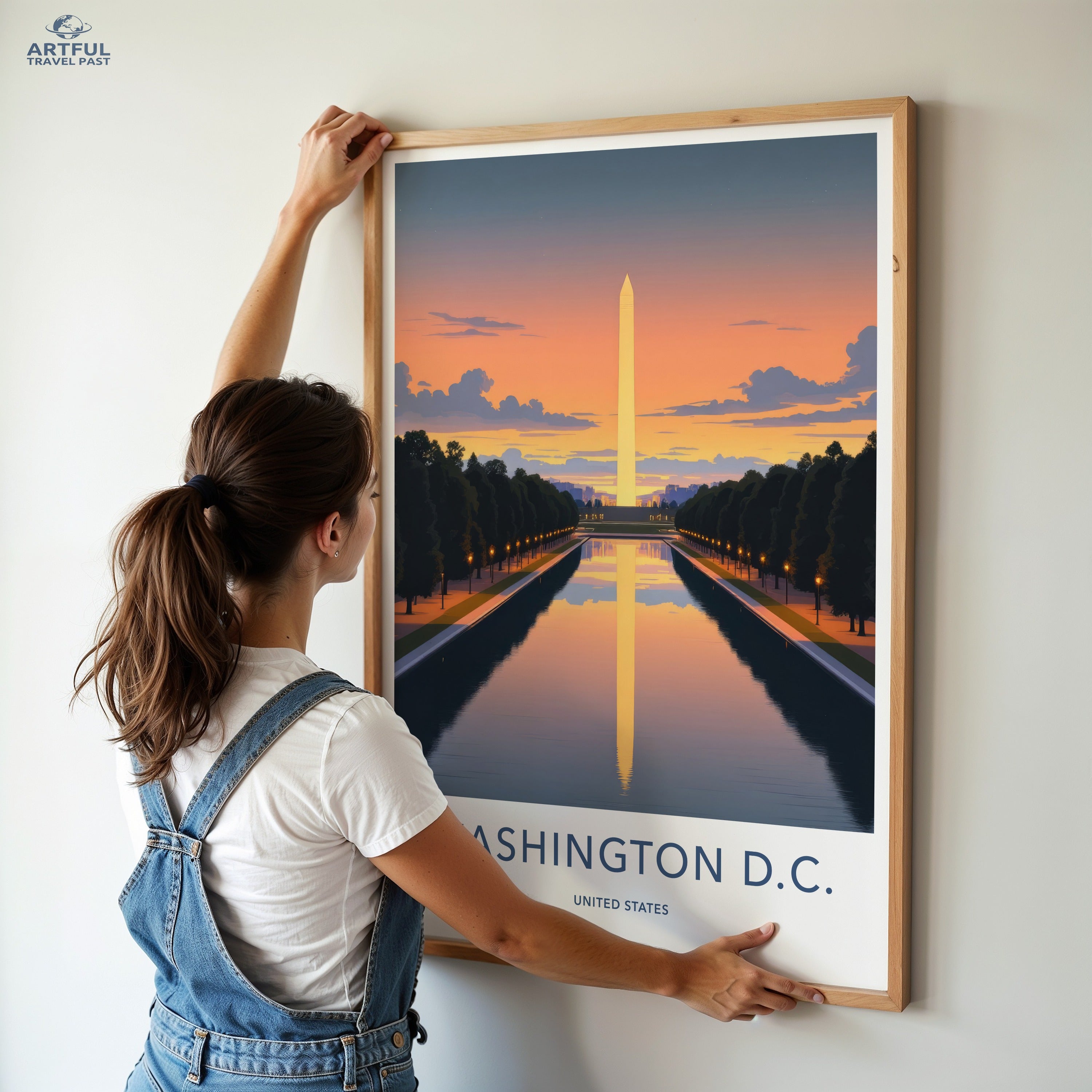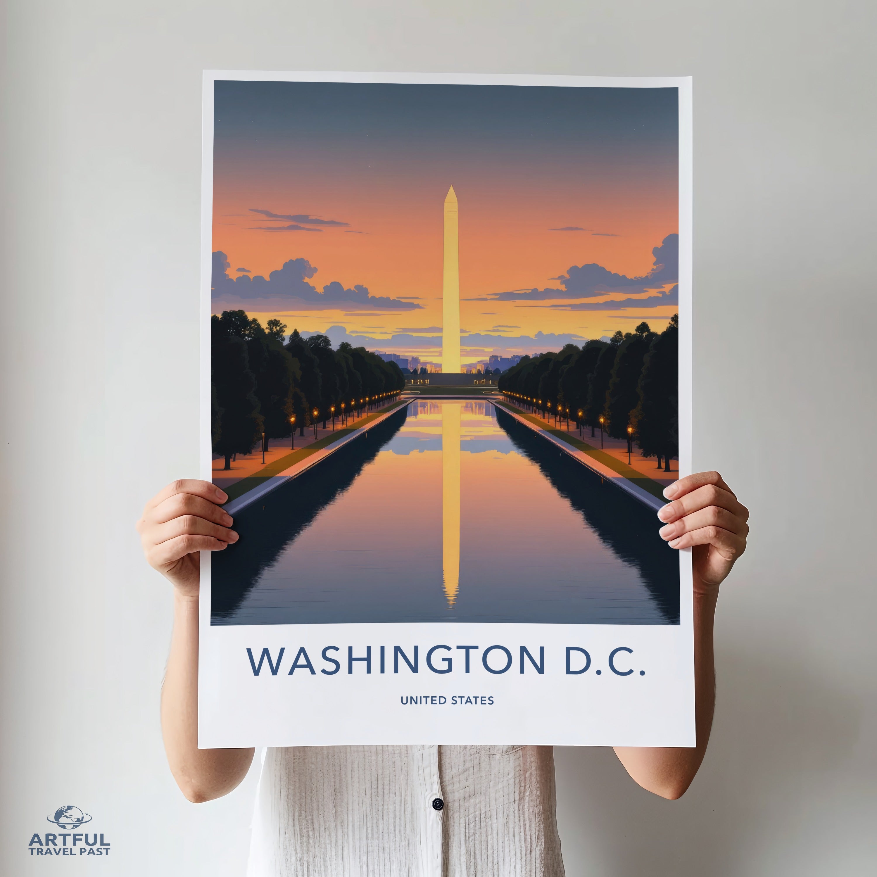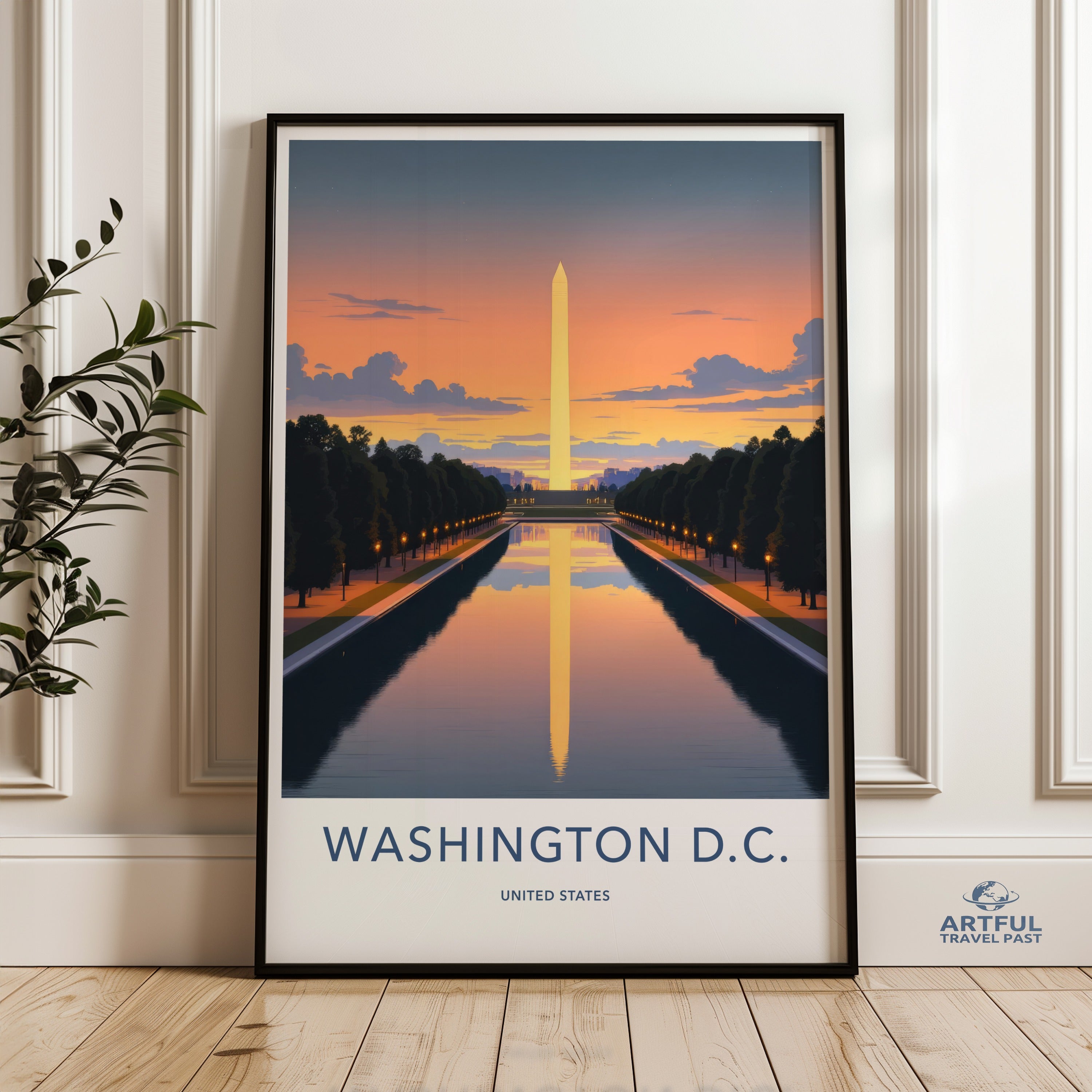 This stunning wall art of Washington D.C. captures the serene reflection of the Washington Monument at sunset, set against a backdrop of a glowing sky. Washington D.C., the capital of the United States, is rich in history and brimming with iconic landmarks. The Washington Monument, a timeless symbol of the nation's heritage, stands majestically by the Reflecting Pool, offering a breathtaking view that embodies both beauty and power.