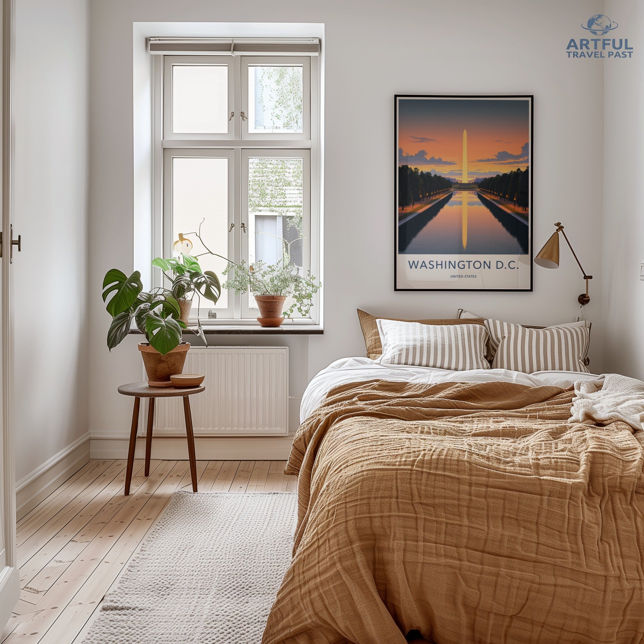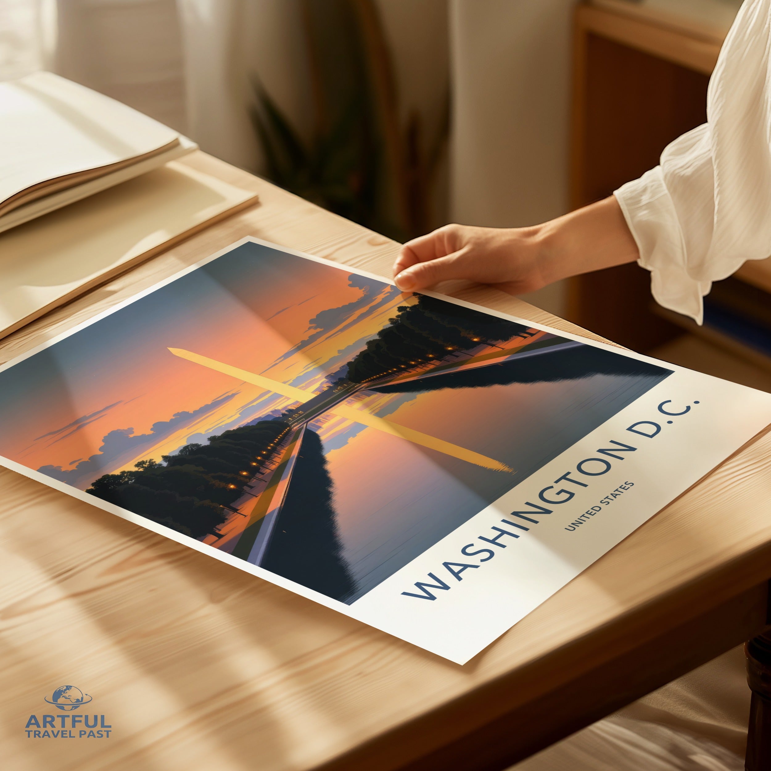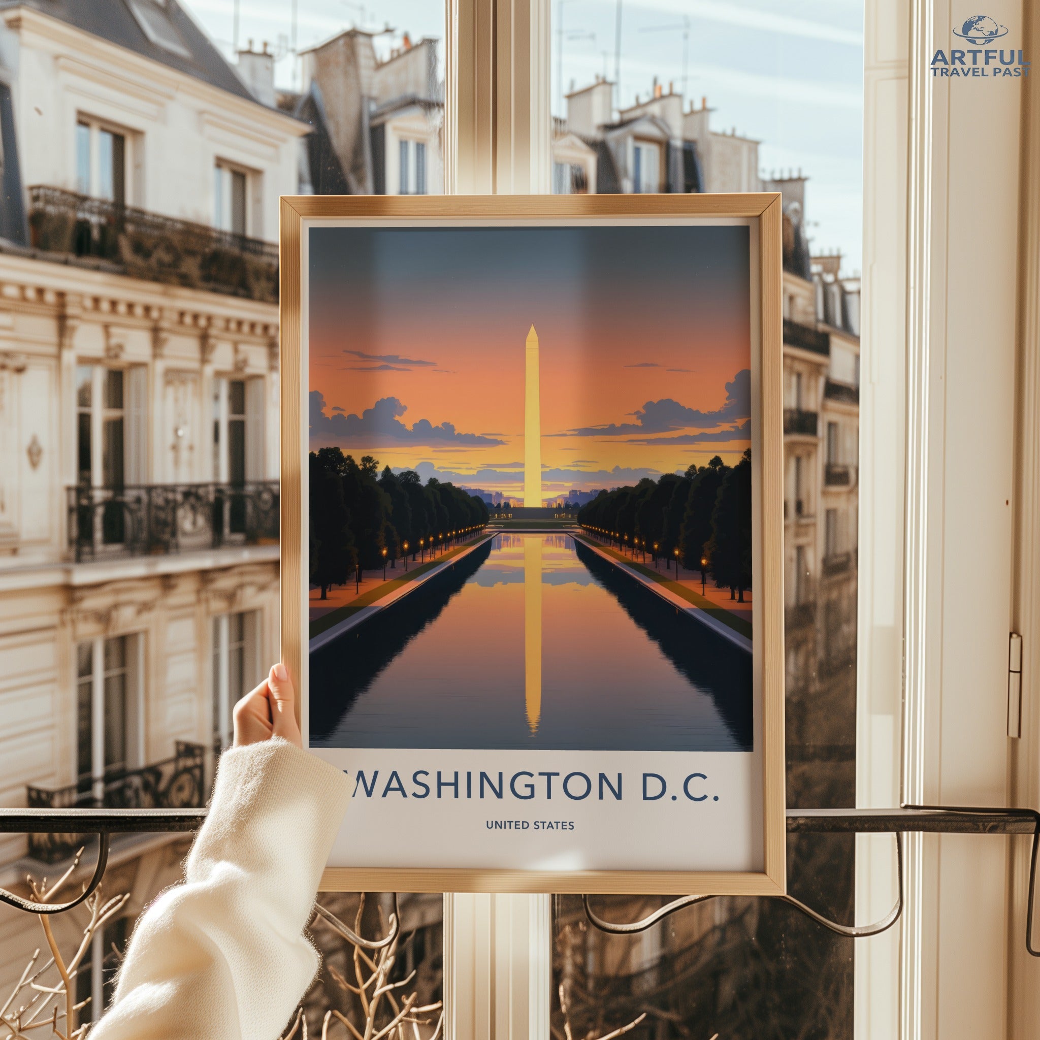 This stunning wall art of Washington D.C. captures the serene reflection of the Washington Monument at sunset, set against a backdrop of a glowing sky. Washington D.C., the capital of the United States, is rich in history and brimming with iconic landmarks. The Washington Monument, a timeless symbol of the nation's heritage, stands majestically by the Reflecting Pool, offering a breathtaking view that embodies both beauty and power.