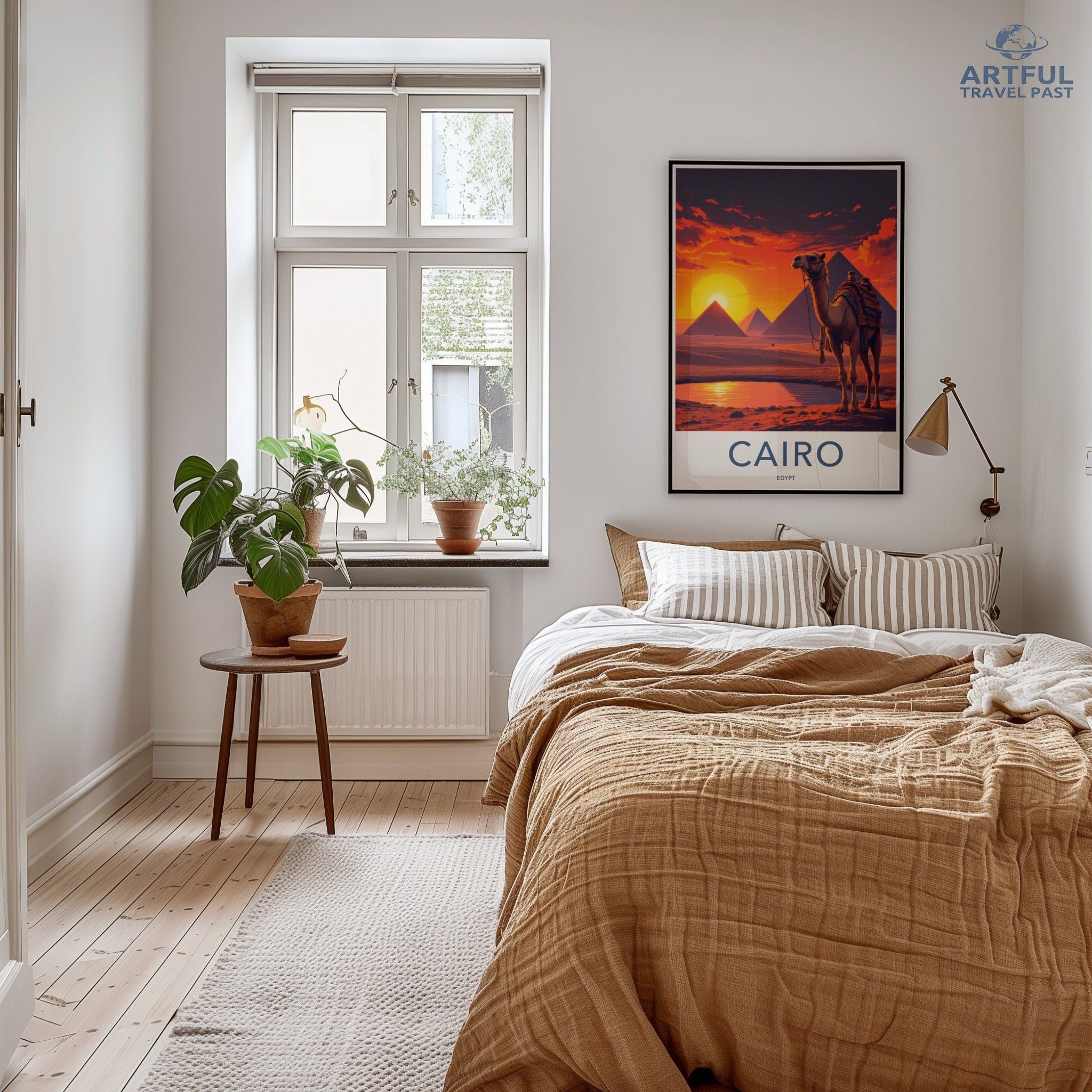 Capture the breathtaking allure of Cairo with this stunning wall art depicting a camel overlooking the pyramids during a vibrant sunset. Cairo, the largest city in the Arab world, boasts a rich history dating back to the Pharaonic era. Marvel at the iconic Pyramids of Giza, ancient wonders and architectural feats that continue to intrigue and inspire. Add this piece to your collection and bring a touch of Egyptian splendor to your space.