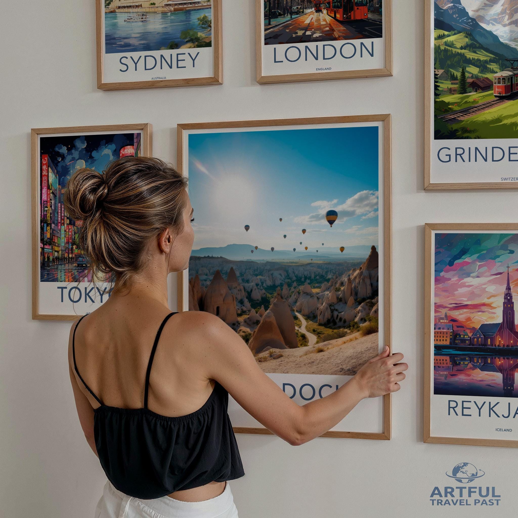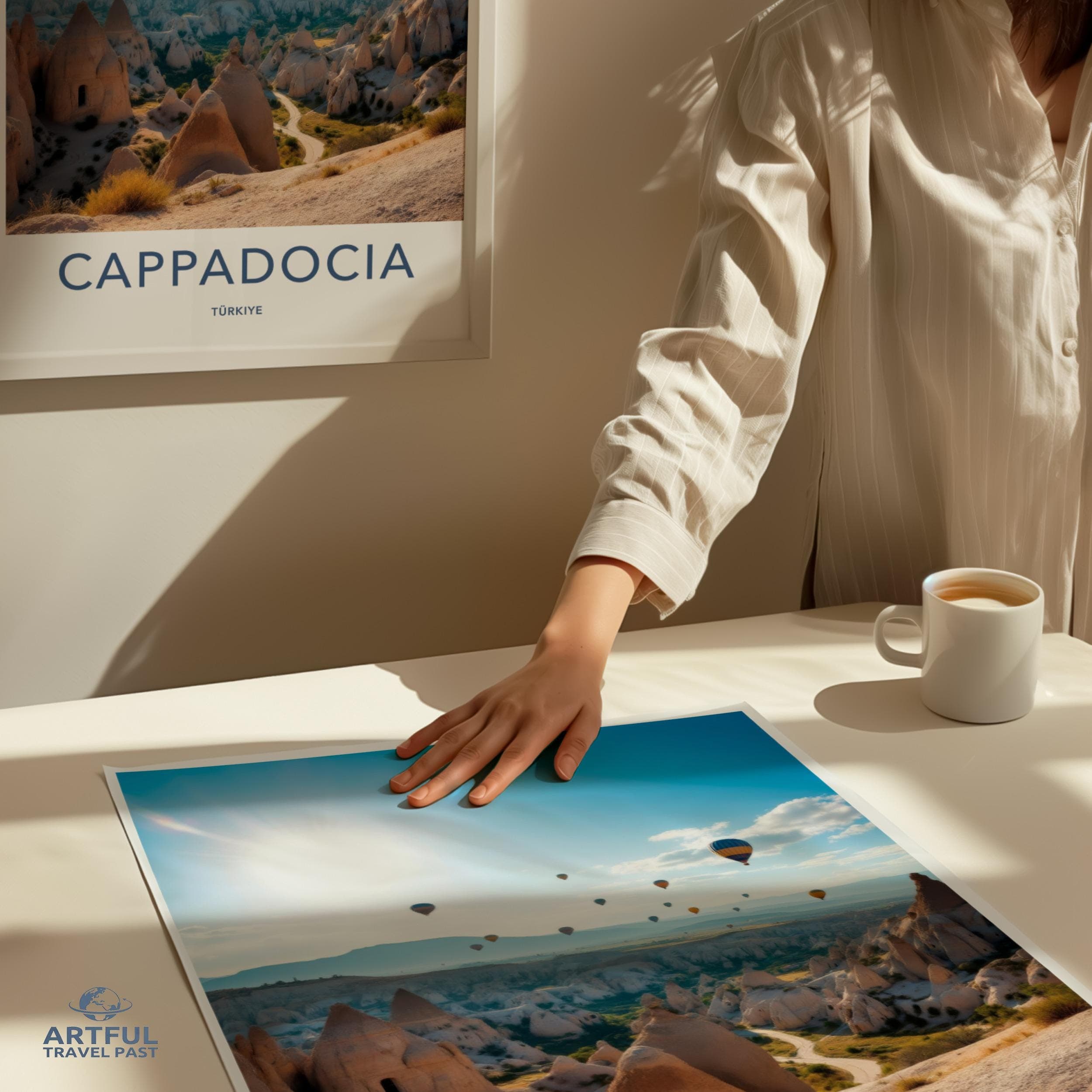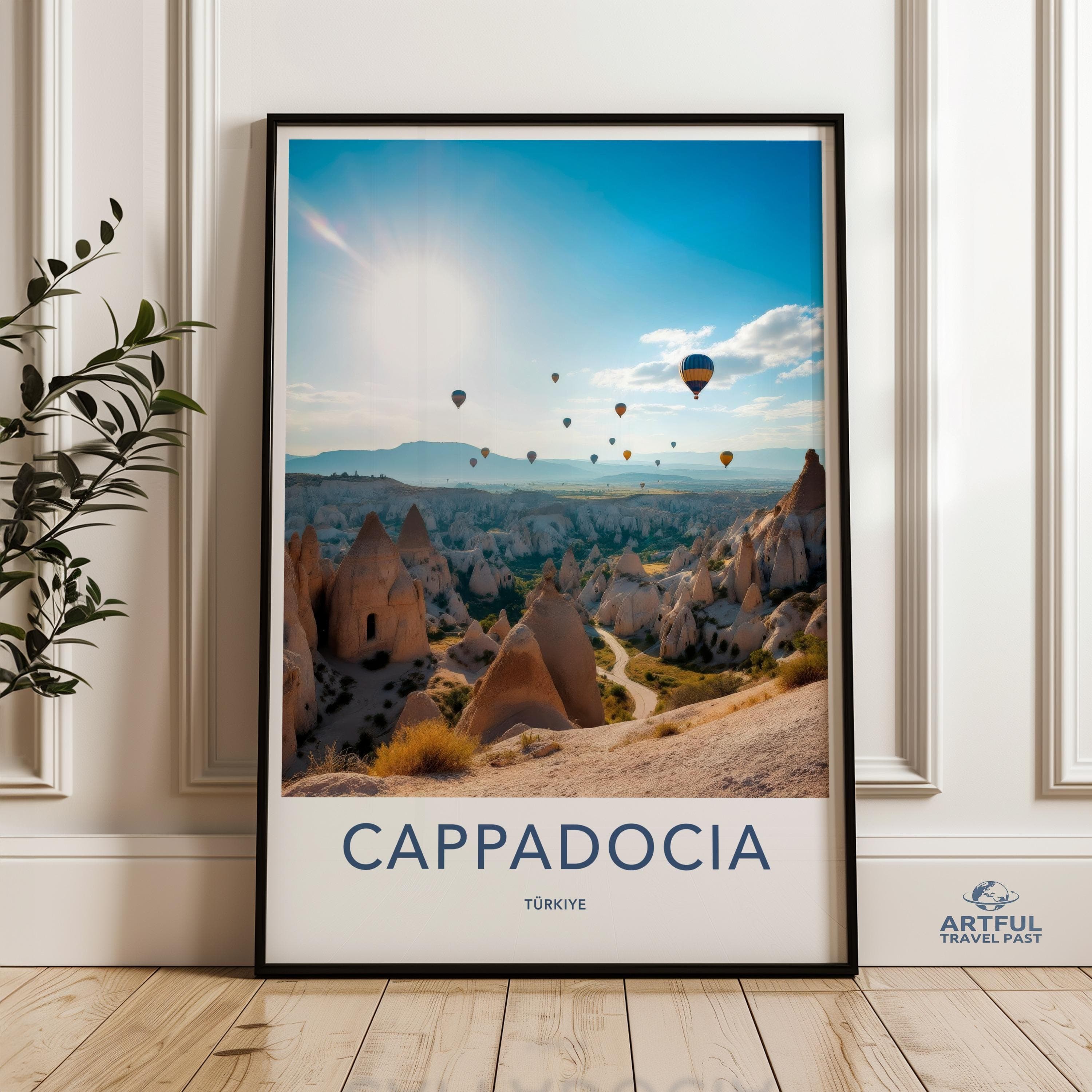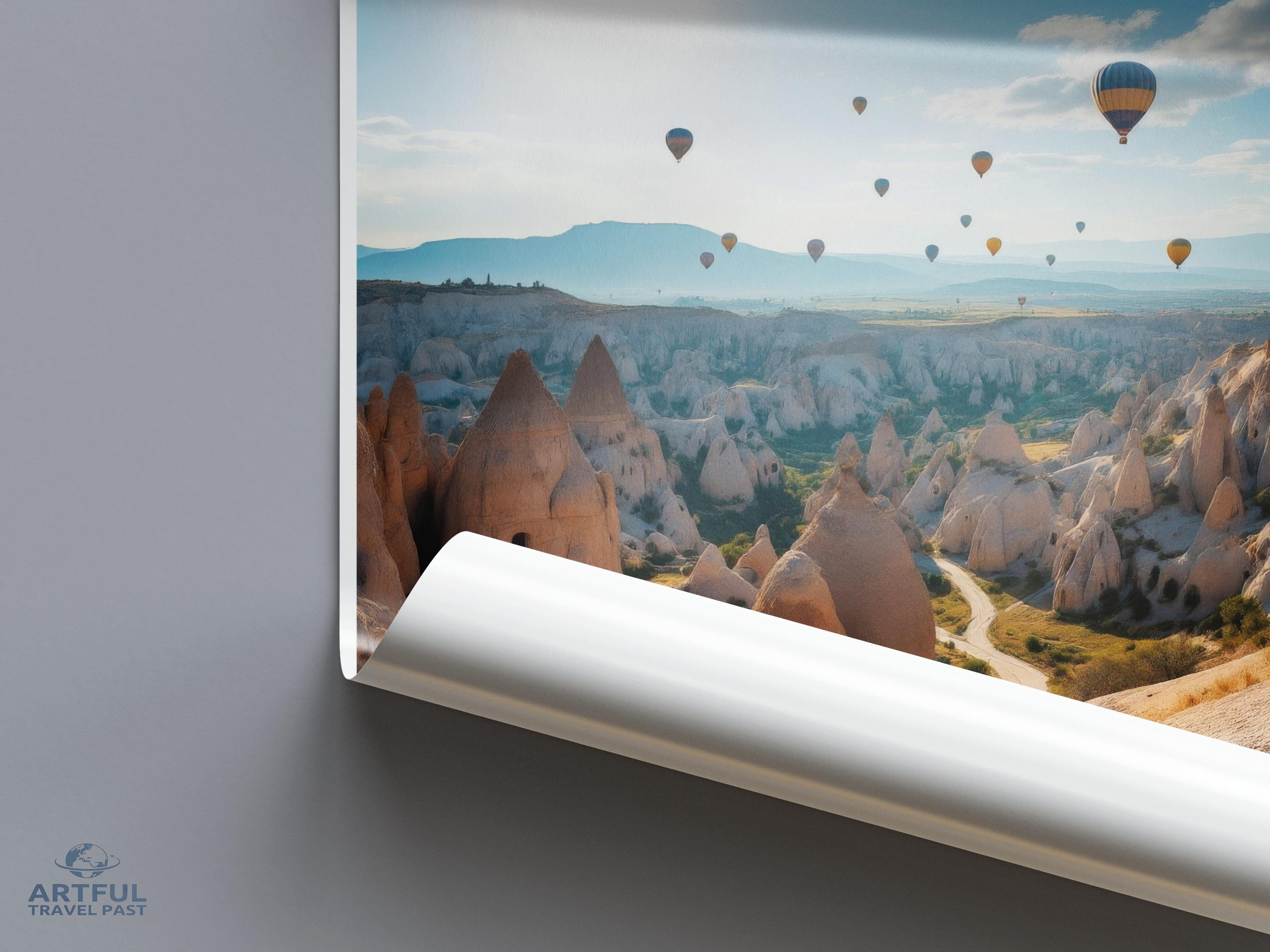 Elevate your space with this stunning wall art of Cappadocia, Türkiye, capturing the enchanting landscape known for its unique rock formations and fairy chimneys. This breathtaking destination has a rich history of ancient cave dwellings and churches carved into the soft volcanic rock. The sight of hot air balloons floating over this surreal terrain at sunrise makes Cappadocia one of the most awe-inspiring places on Earth.