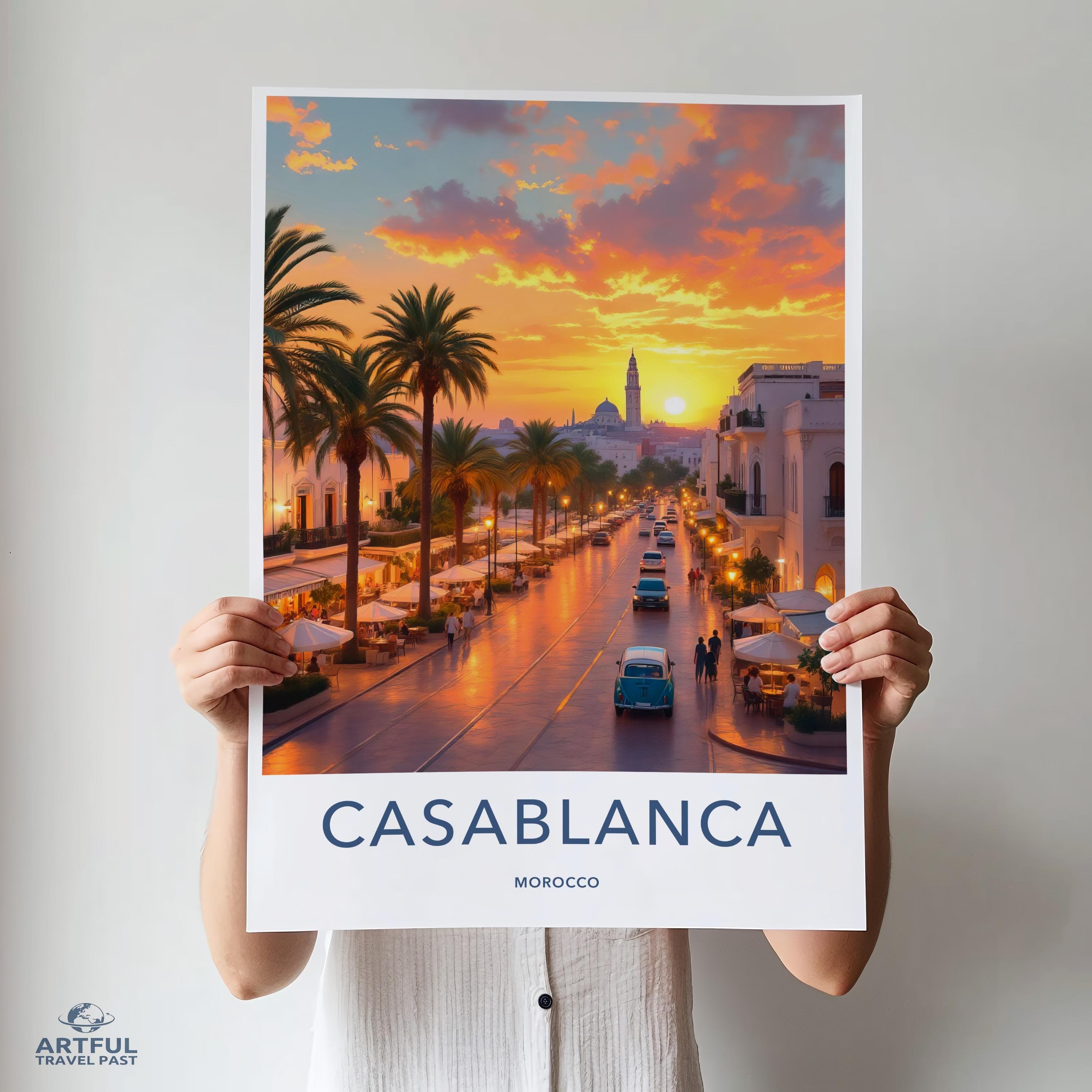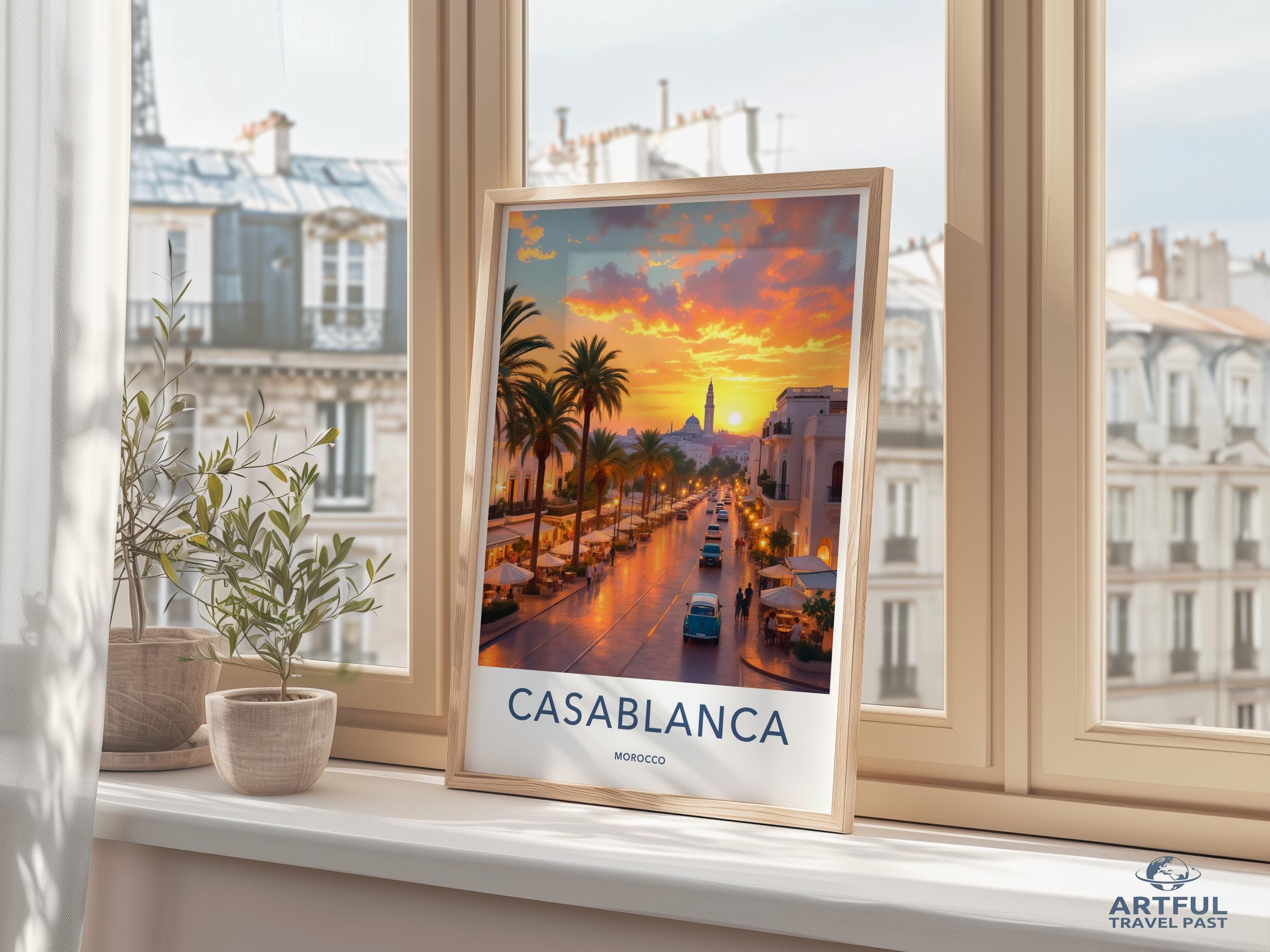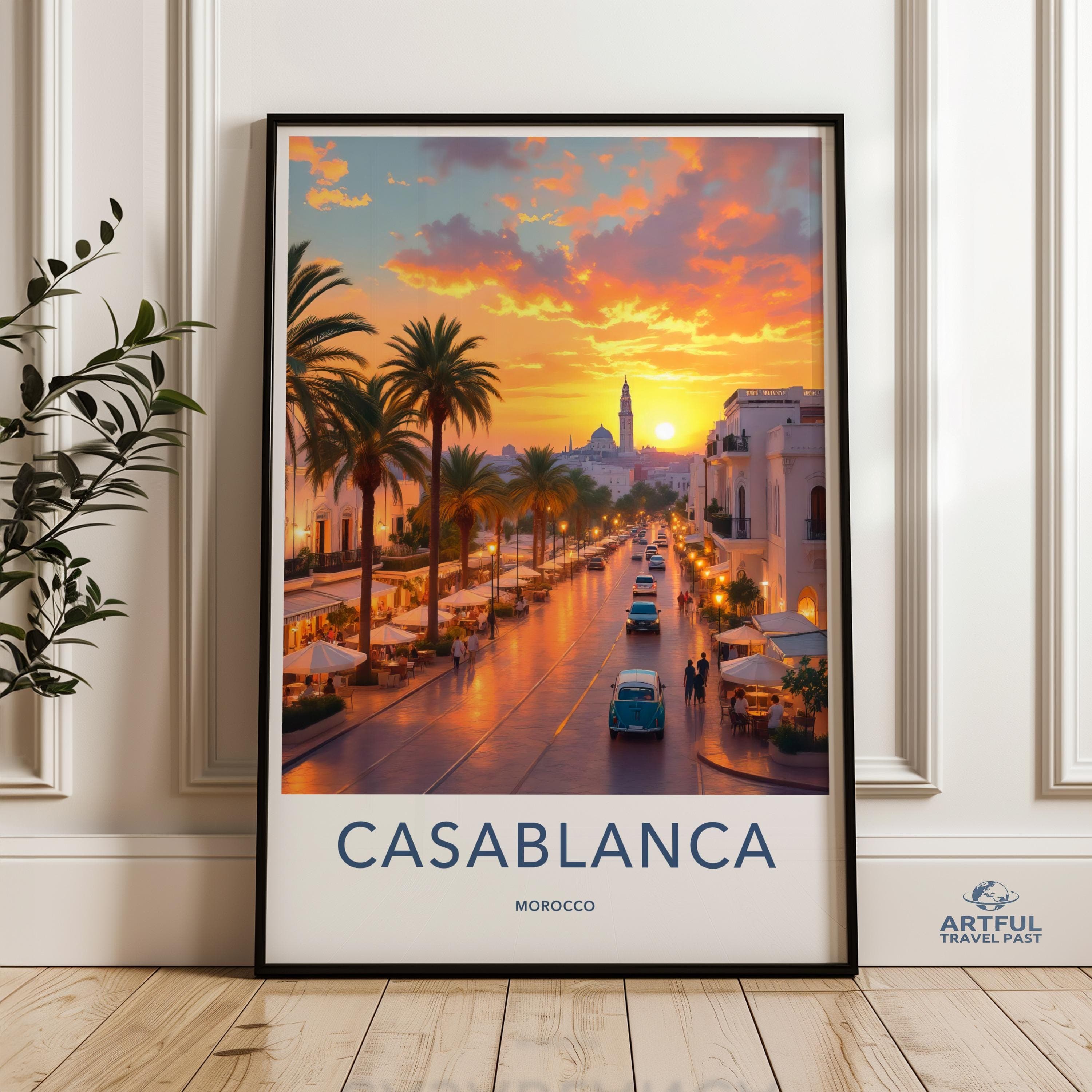 Transport yourself to the stunning city of Casablanca, Morocco with this vibrant wall art. Known for its captivating blend of French colonial architecture and traditional Moroccan charm, Casablanca offers a breathtaking sunset over palm-lined boulevards and bustling street cafes. The iconic Hassan II Mosque stands tall in the distance, adding a touch of cultural splendor to this coastal city's rich history and enchanting atmosphere.