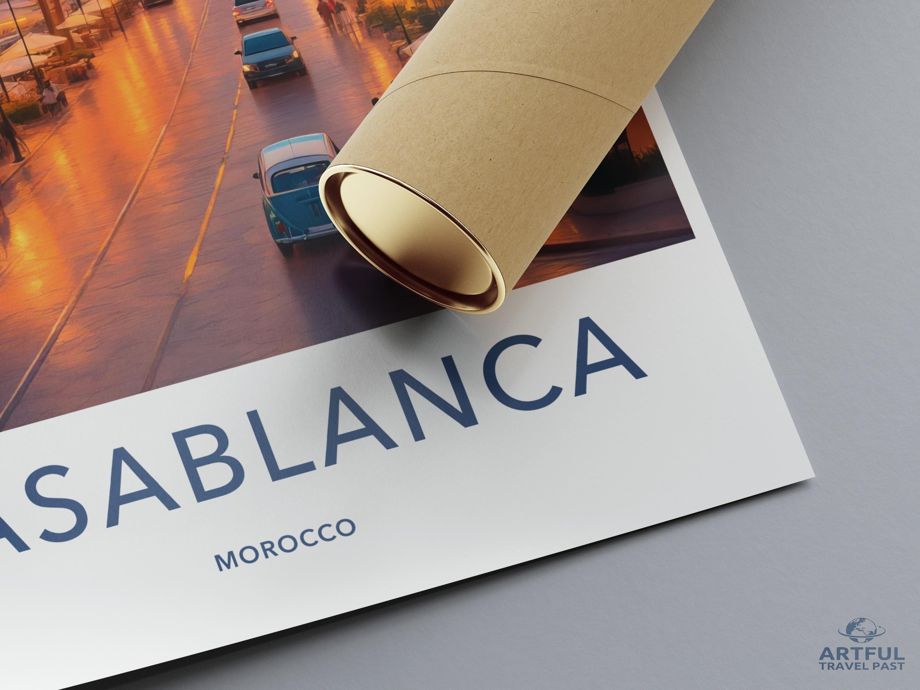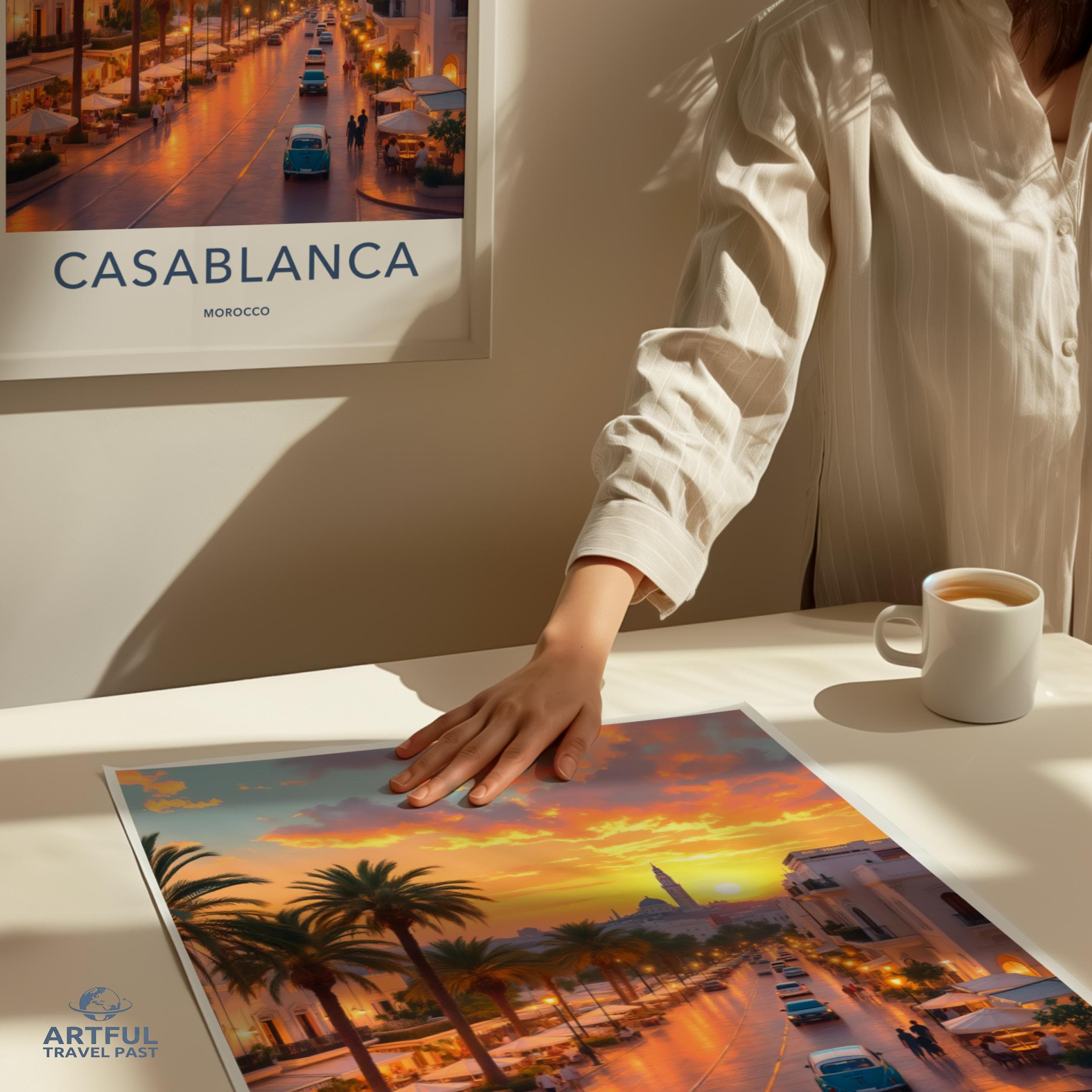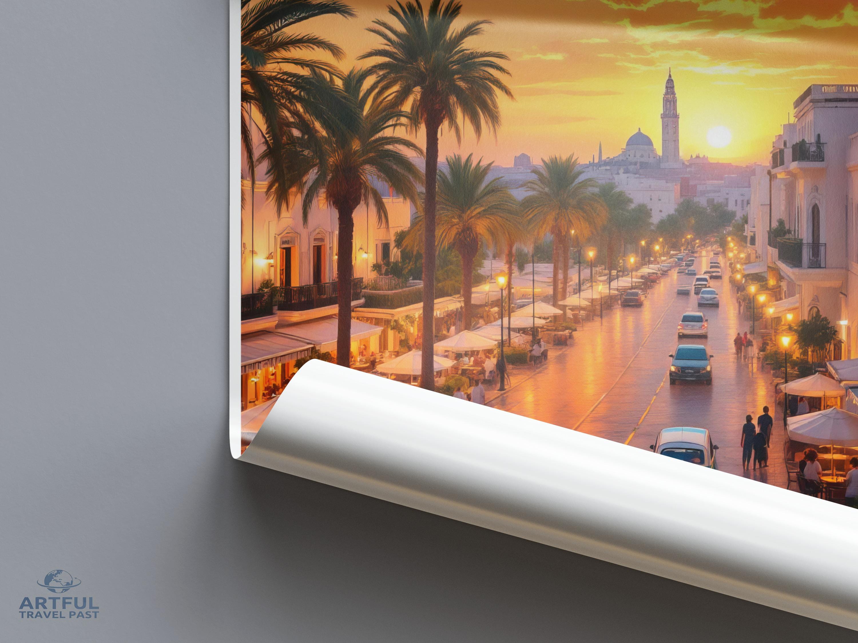 Transport yourself to the stunning city of Casablanca, Morocco with this vibrant wall art. Known for its captivating blend of French colonial architecture and traditional Moroccan charm, Casablanca offers a breathtaking sunset over palm-lined boulevards and bustling street cafes. The iconic Hassan II Mosque stands tall in the distance, adding a touch of cultural splendor to this coastal city's rich history and enchanting atmosphere.