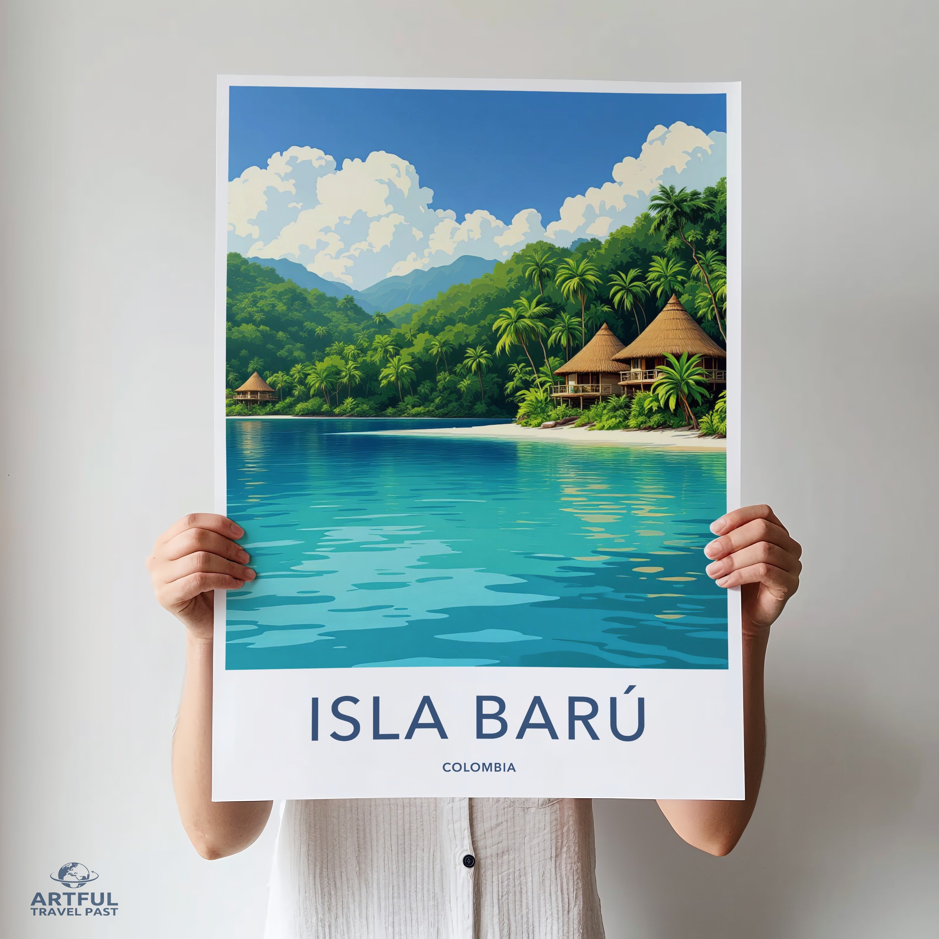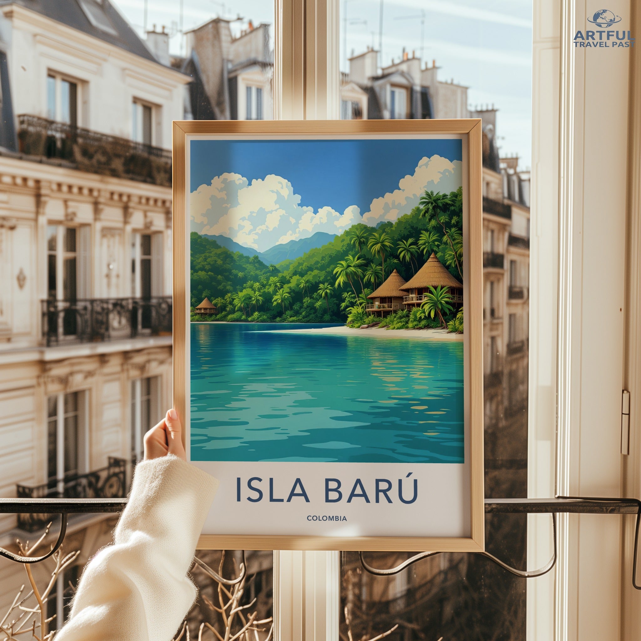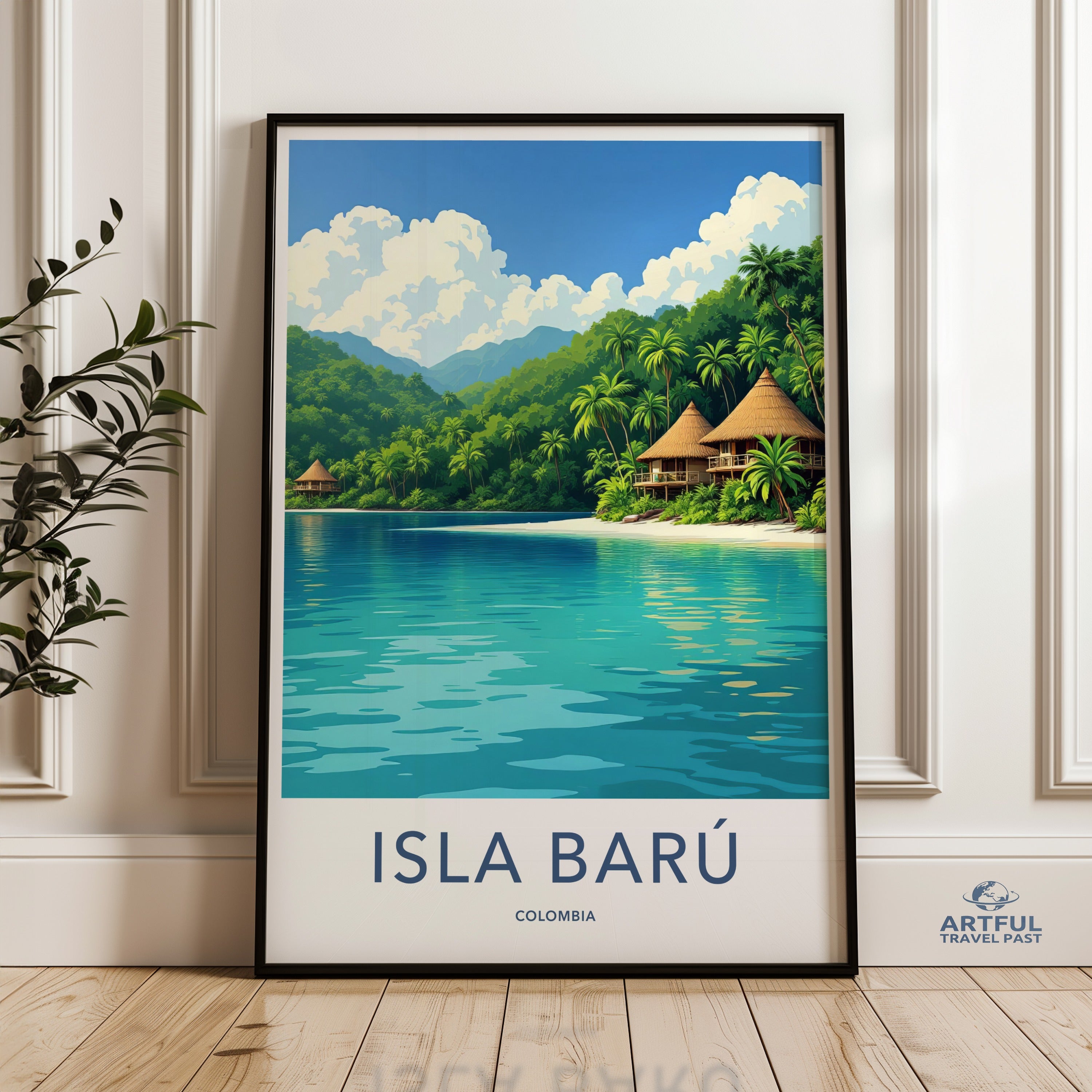 Isla Barú, a gem off Colombia's coast, boasts pristine turquoise waters and lush tropical forests. Known for its beachfront bungalows and crystal-clear waters, it offers a perfect escape with a touch of history. Once a strategic Spanish port, now a serene paradise, it's a favorite for water activities and nature lovers alike. Experience its beauty and tranquility through this vibrant wall art.