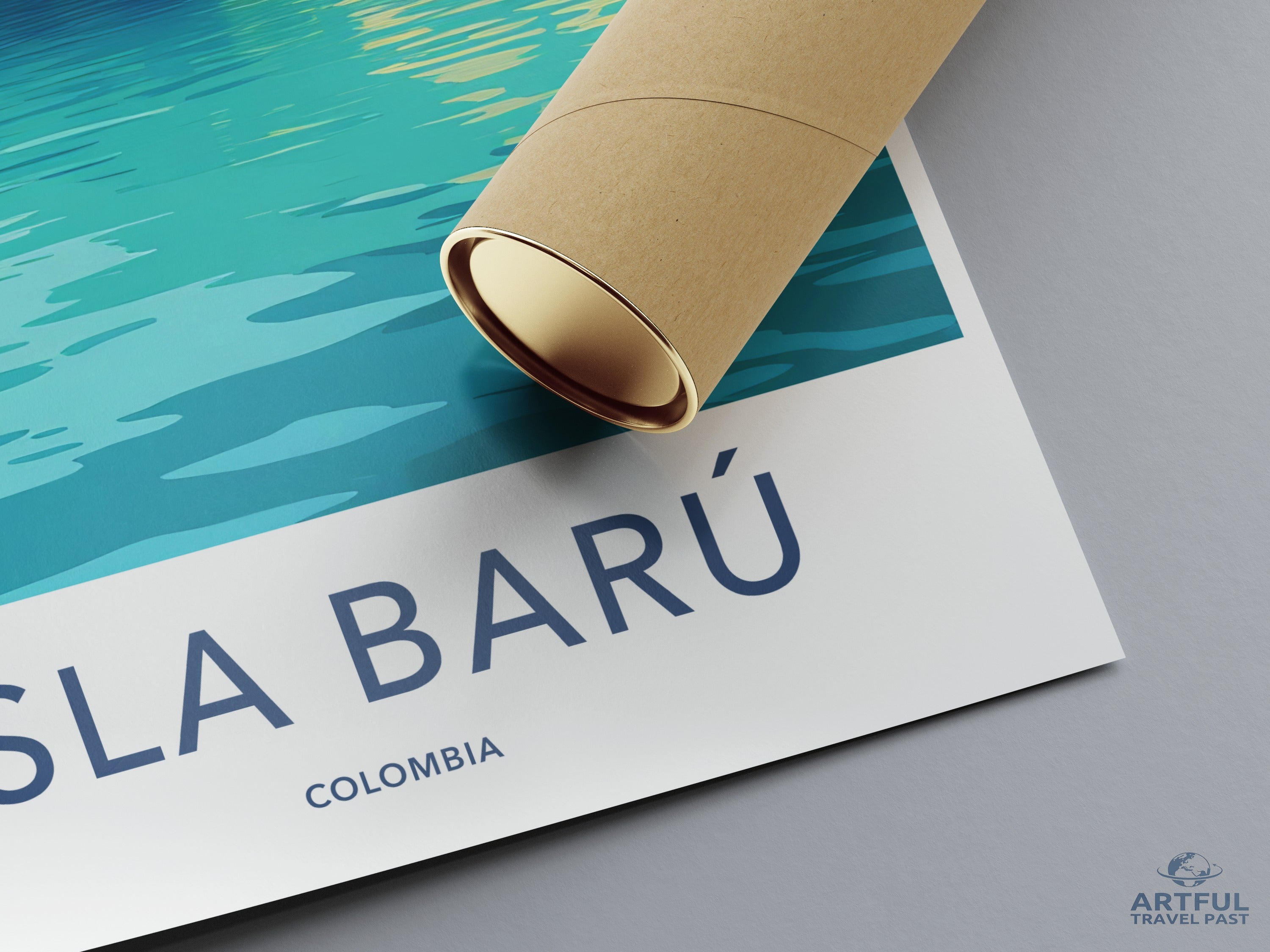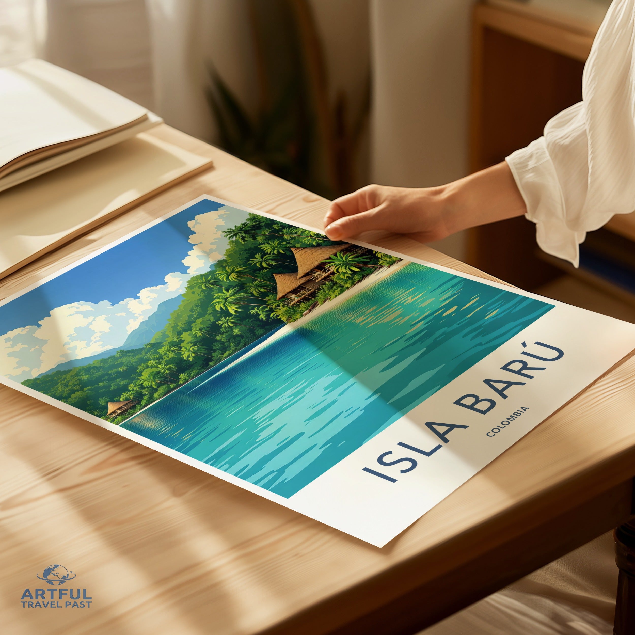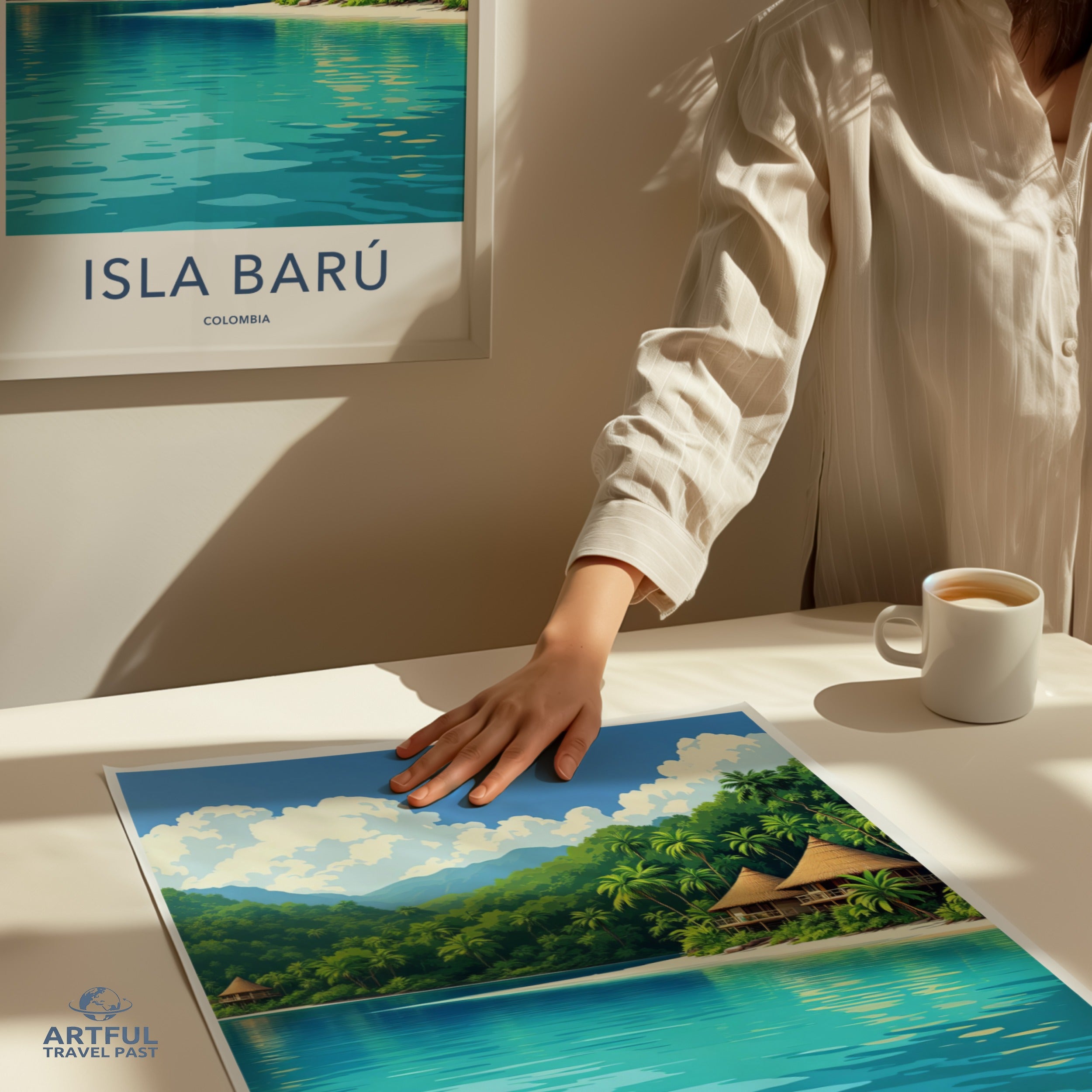 Isla Barú, a gem off Colombia's coast, boasts pristine turquoise waters and lush tropical forests. Known for its beachfront bungalows and crystal-clear waters, it offers a perfect escape with a touch of history. Once a strategic Spanish port, now a serene paradise, it's a favorite for water activities and nature lovers alike. Experience its beauty and tranquility through this vibrant wall art.
