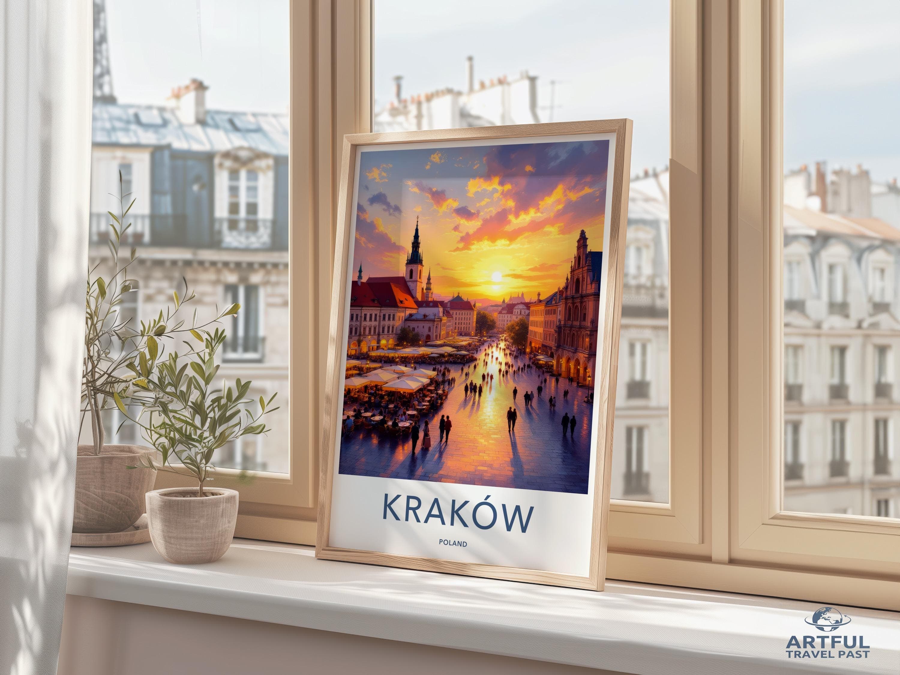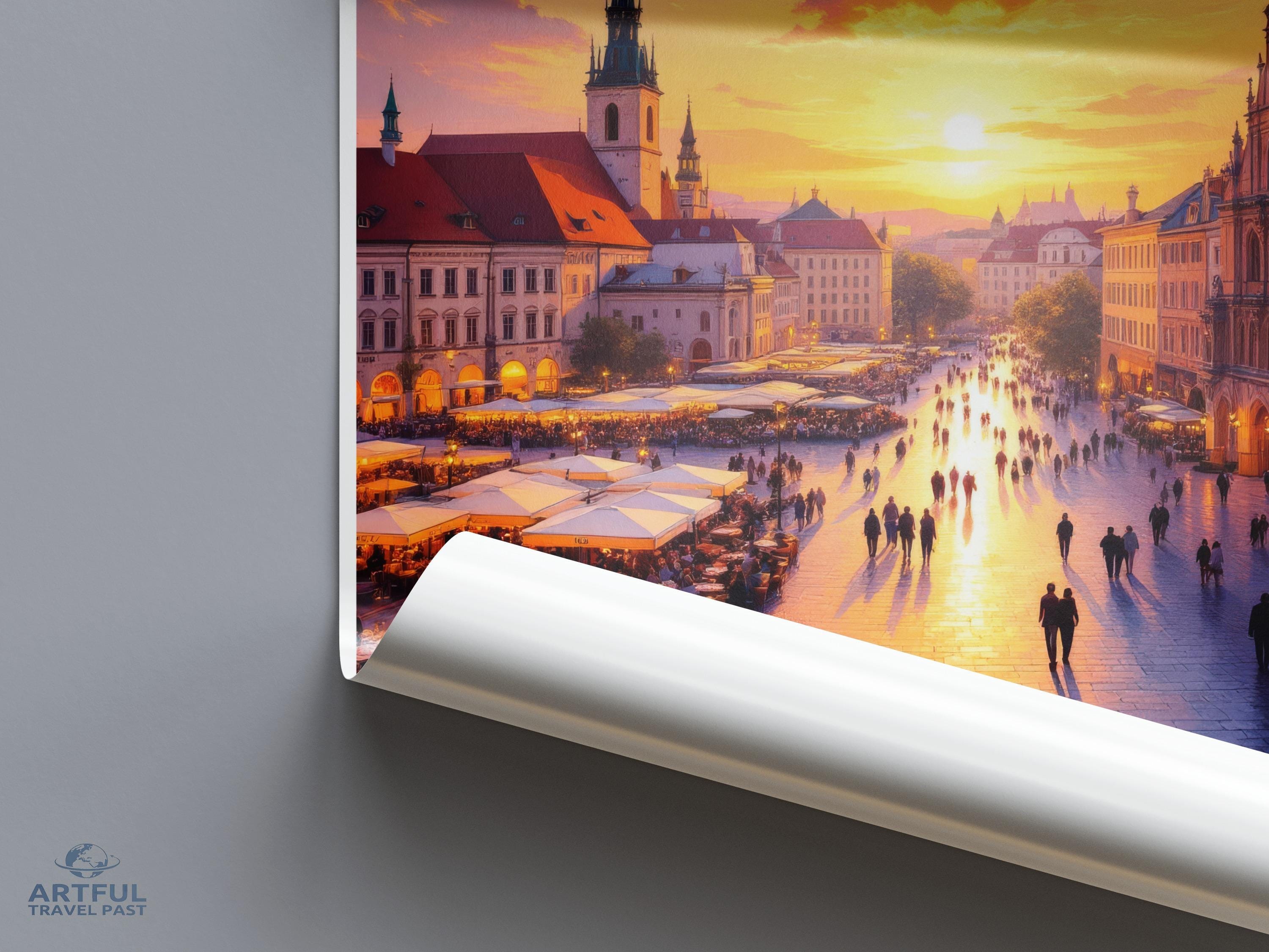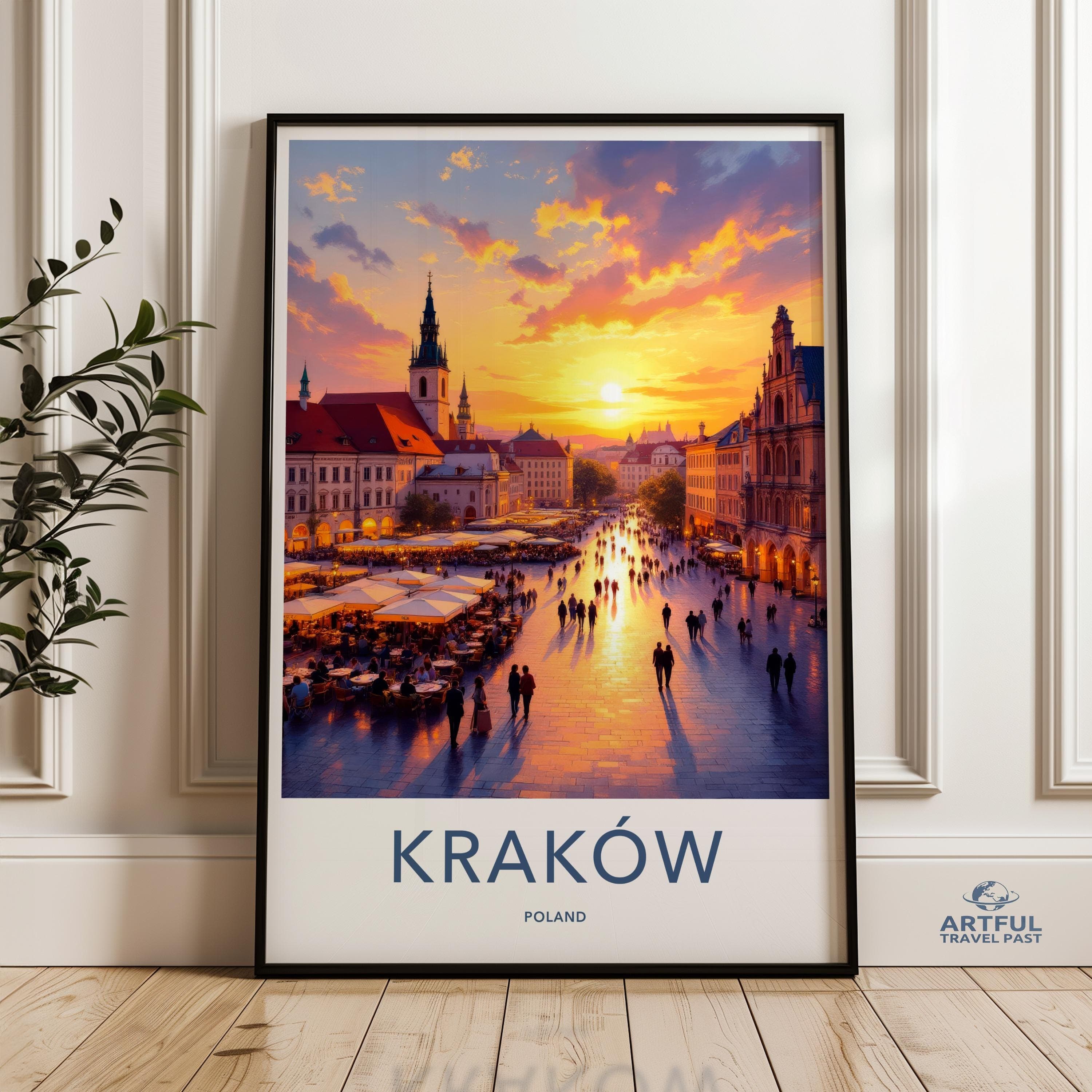 Capture the enchanting allure of Kraków, Poland, with this stunning wall art showcasing the city's historic charm. The vibrant sunset casts a golden glow over the iconic Market Square, a hub of activity since the 13th century, surrounded by charming medieval architecture. St. Mary's Basilica stands tall, adding a touch of Gothic splendor. This piece embodies the timeless beauty and cultural richness of one of Europe's most captivating cities.