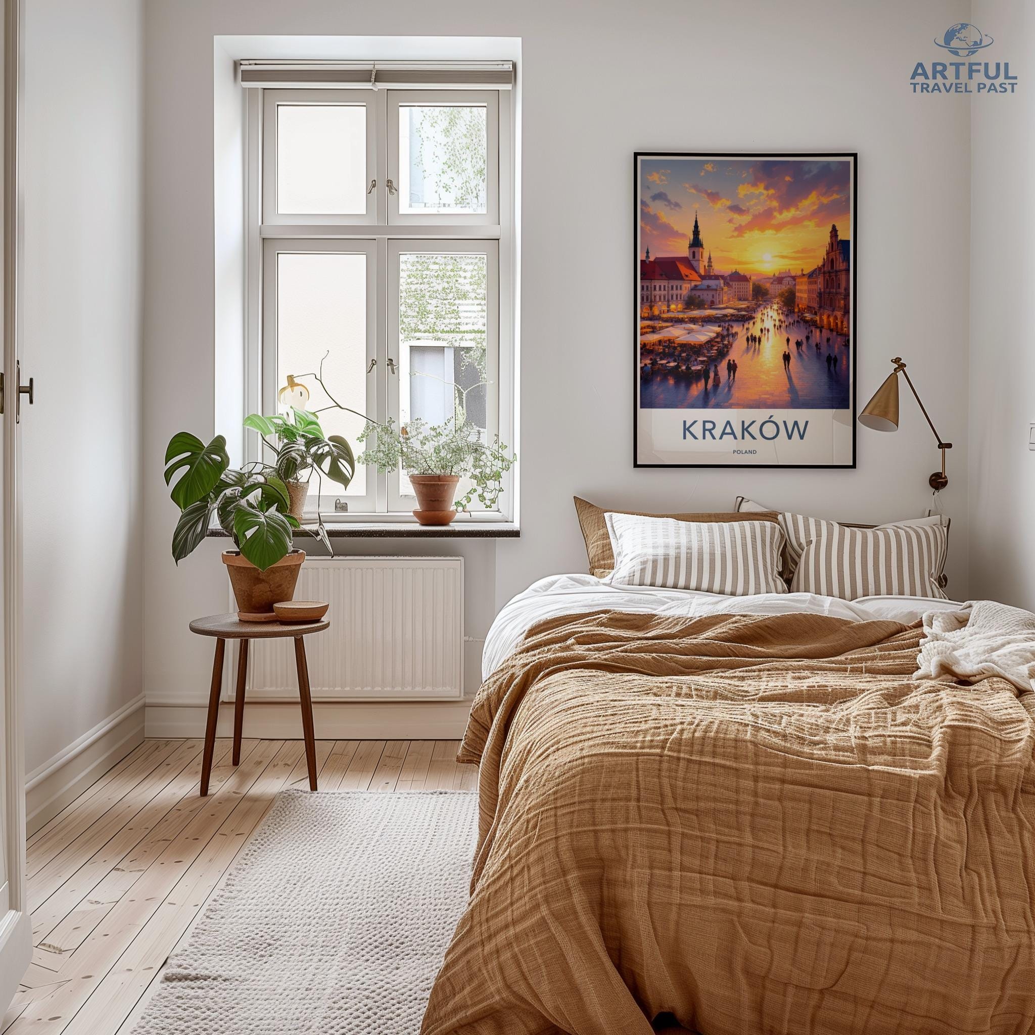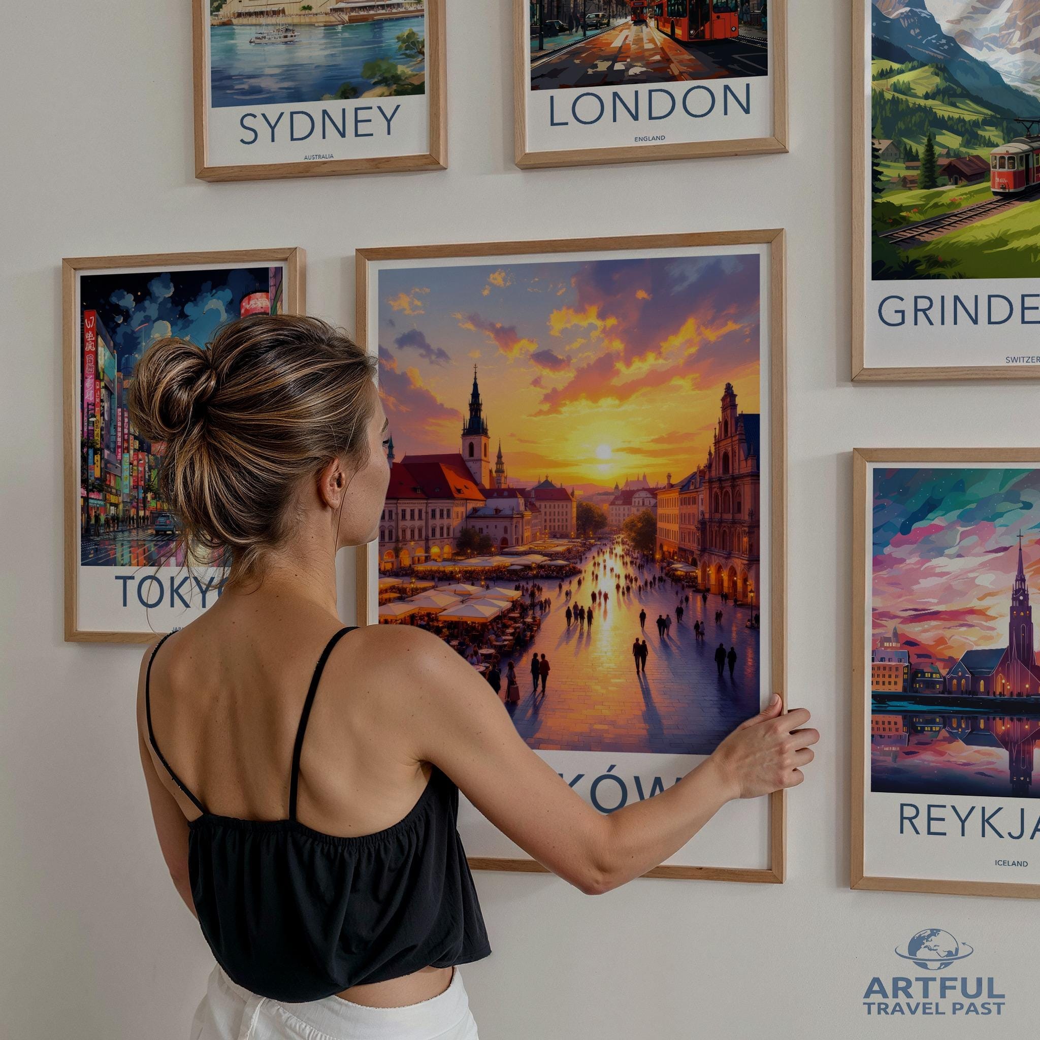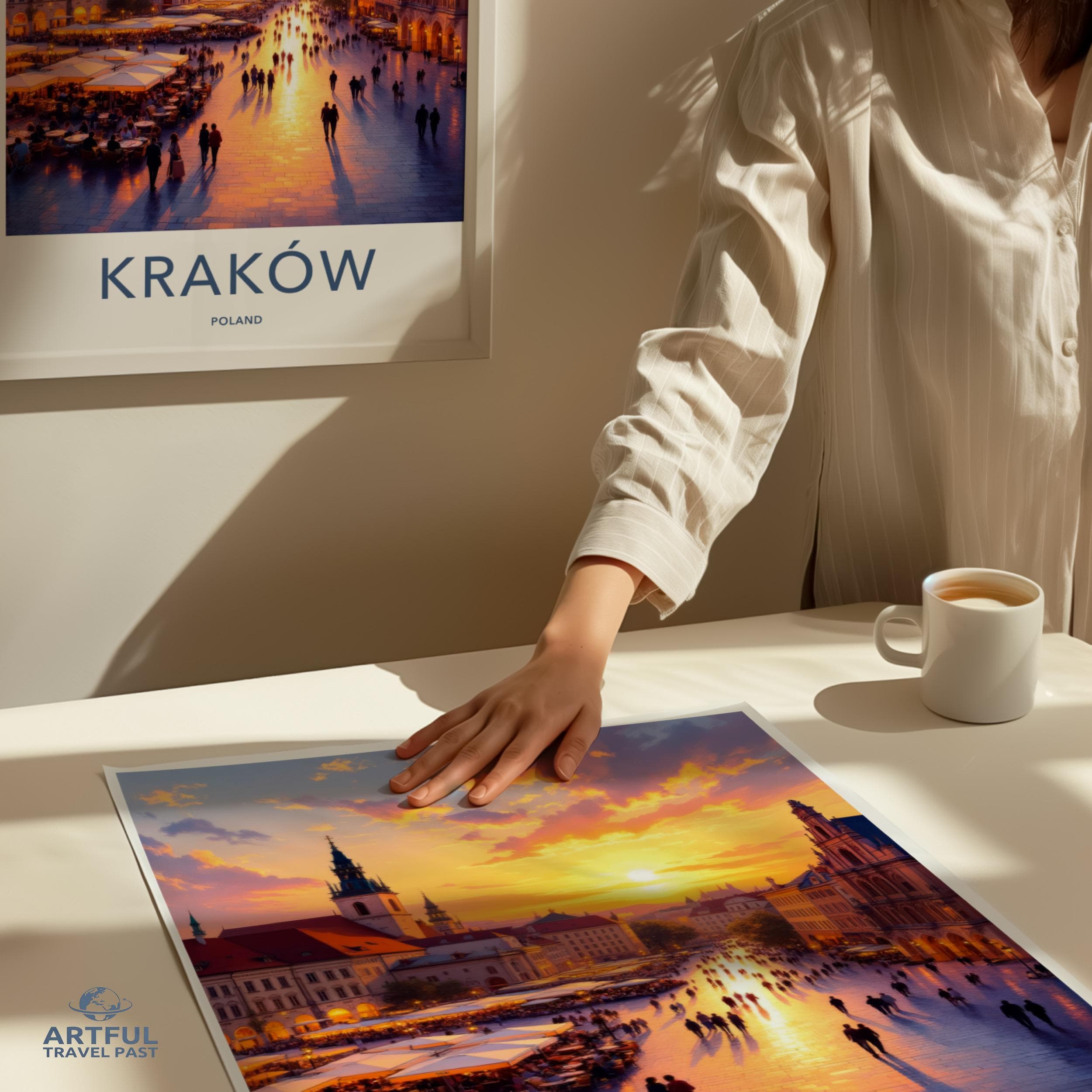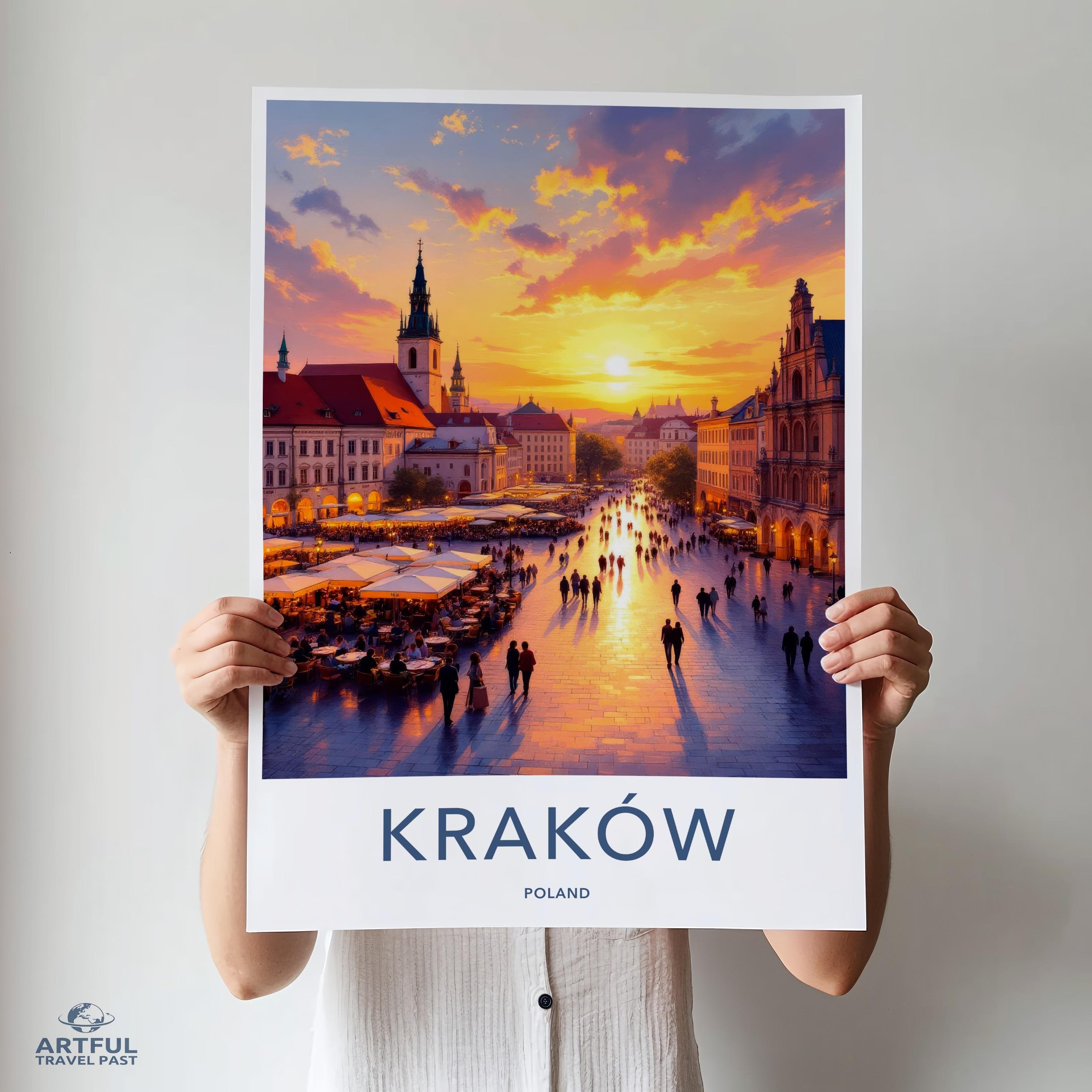 Capture the enchanting allure of Kraków, Poland, with this stunning wall art showcasing the city's historic charm. The vibrant sunset casts a golden glow over the iconic Market Square, a hub of activity since the 13th century, surrounded by charming medieval architecture. St. Mary's Basilica stands tall, adding a touch of Gothic splendor. This piece embodies the timeless beauty and cultural richness of one of Europe's most captivating cities.
