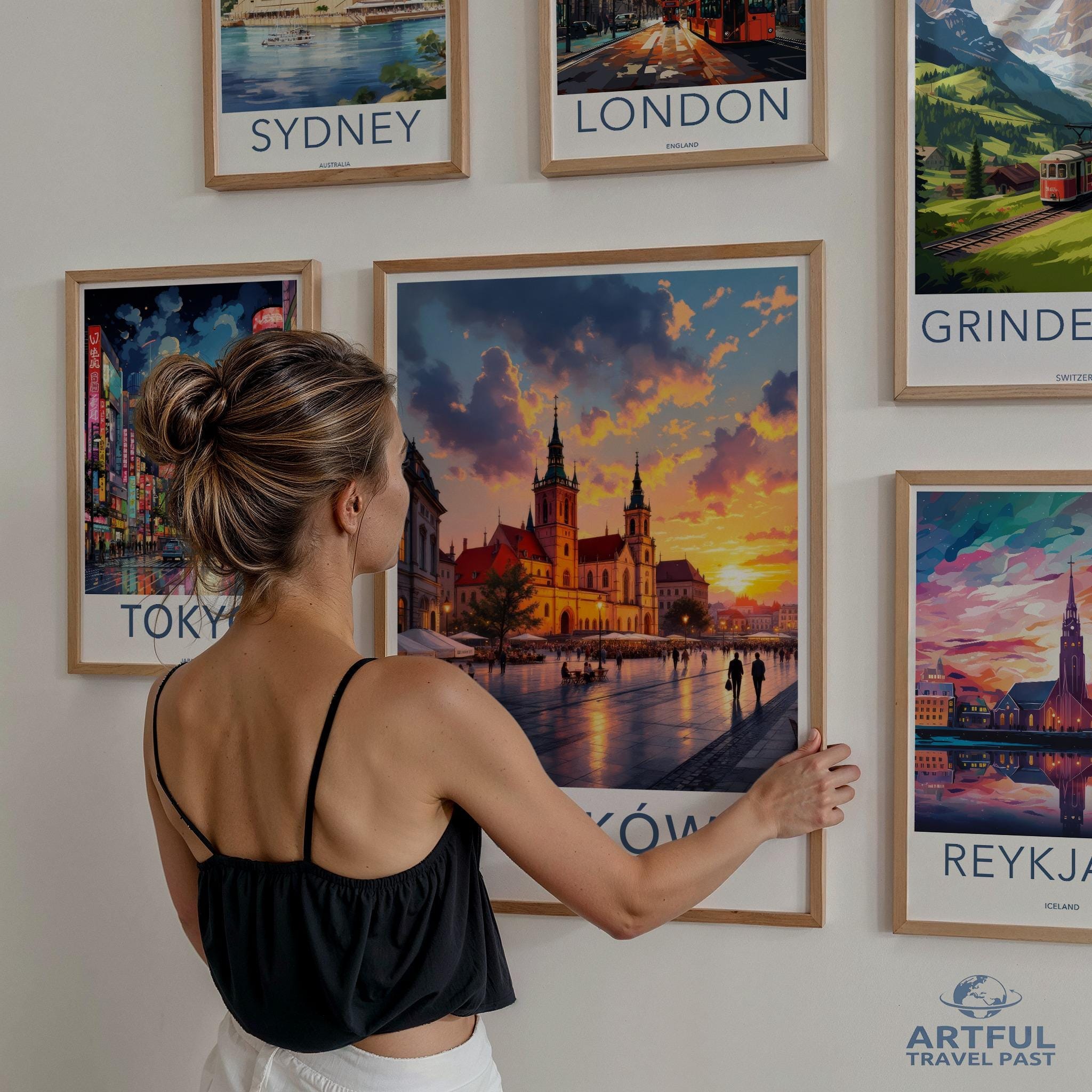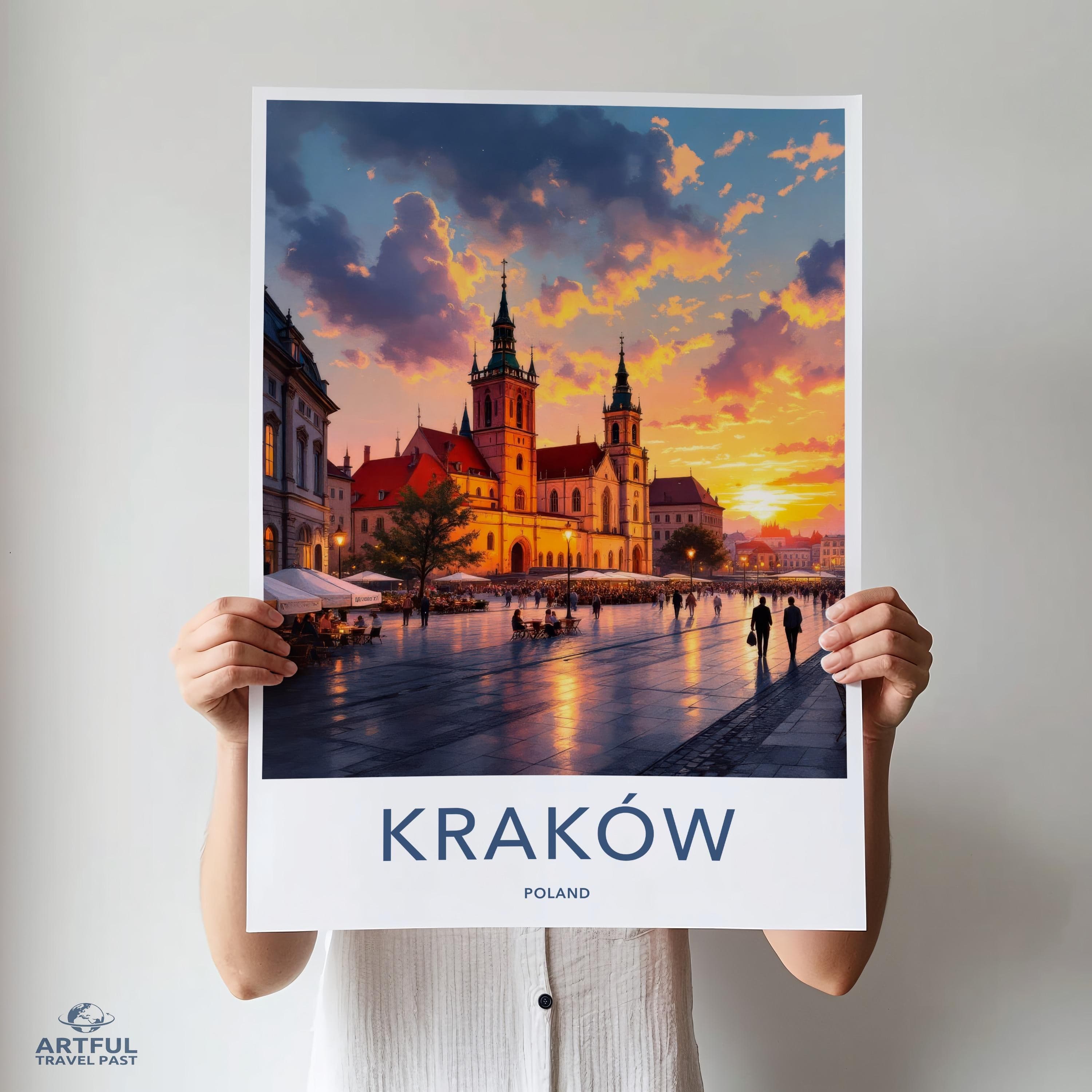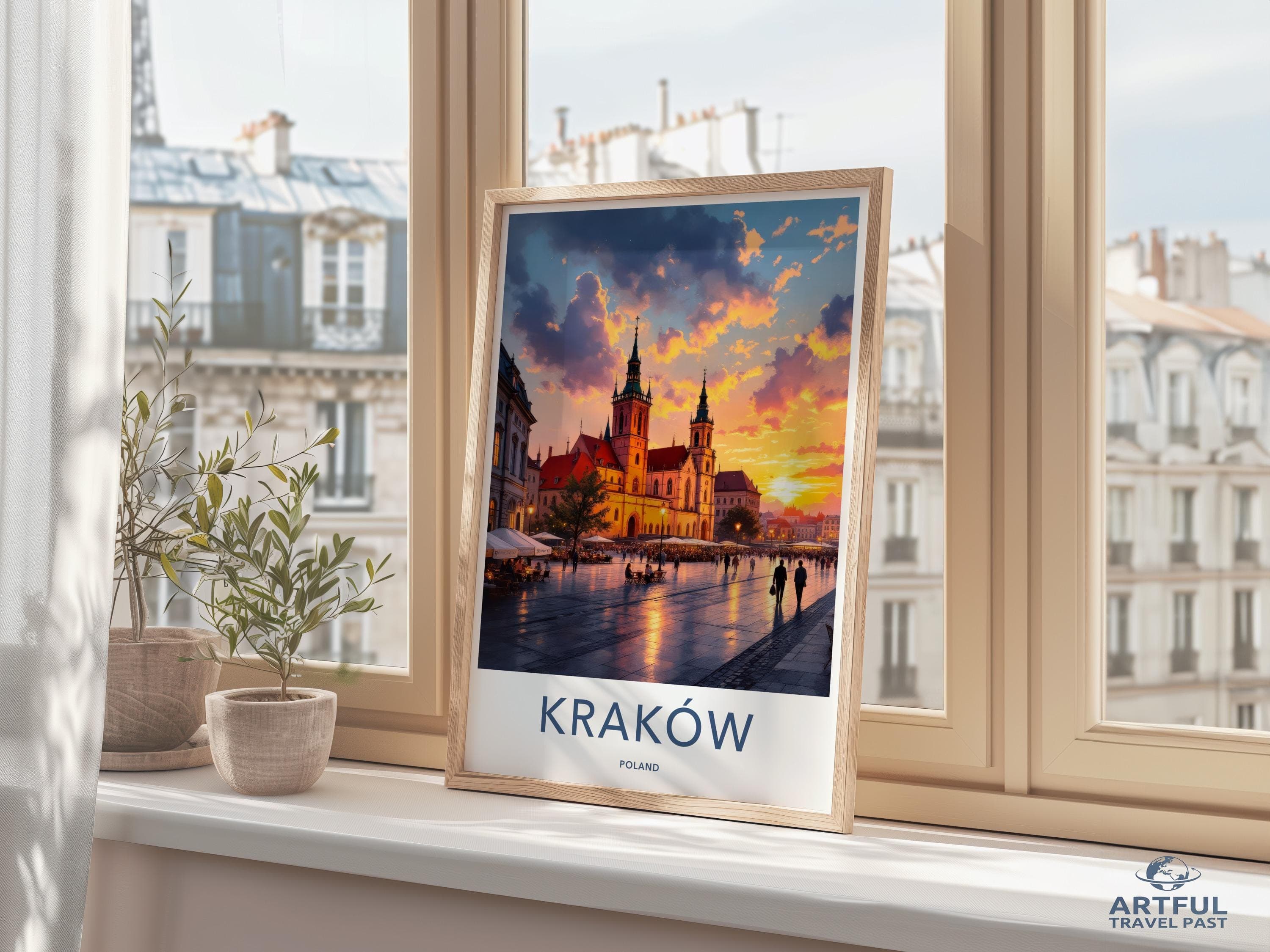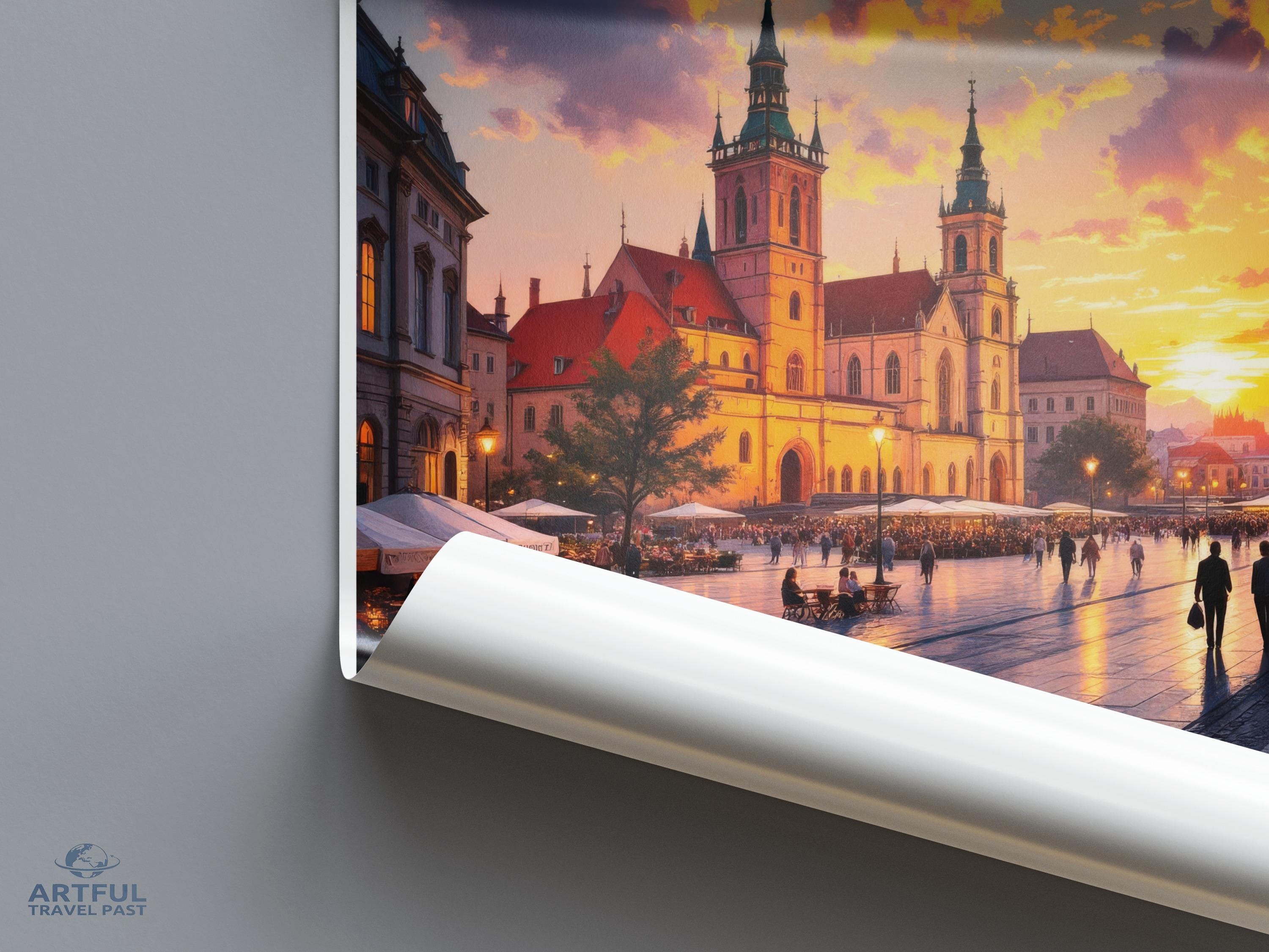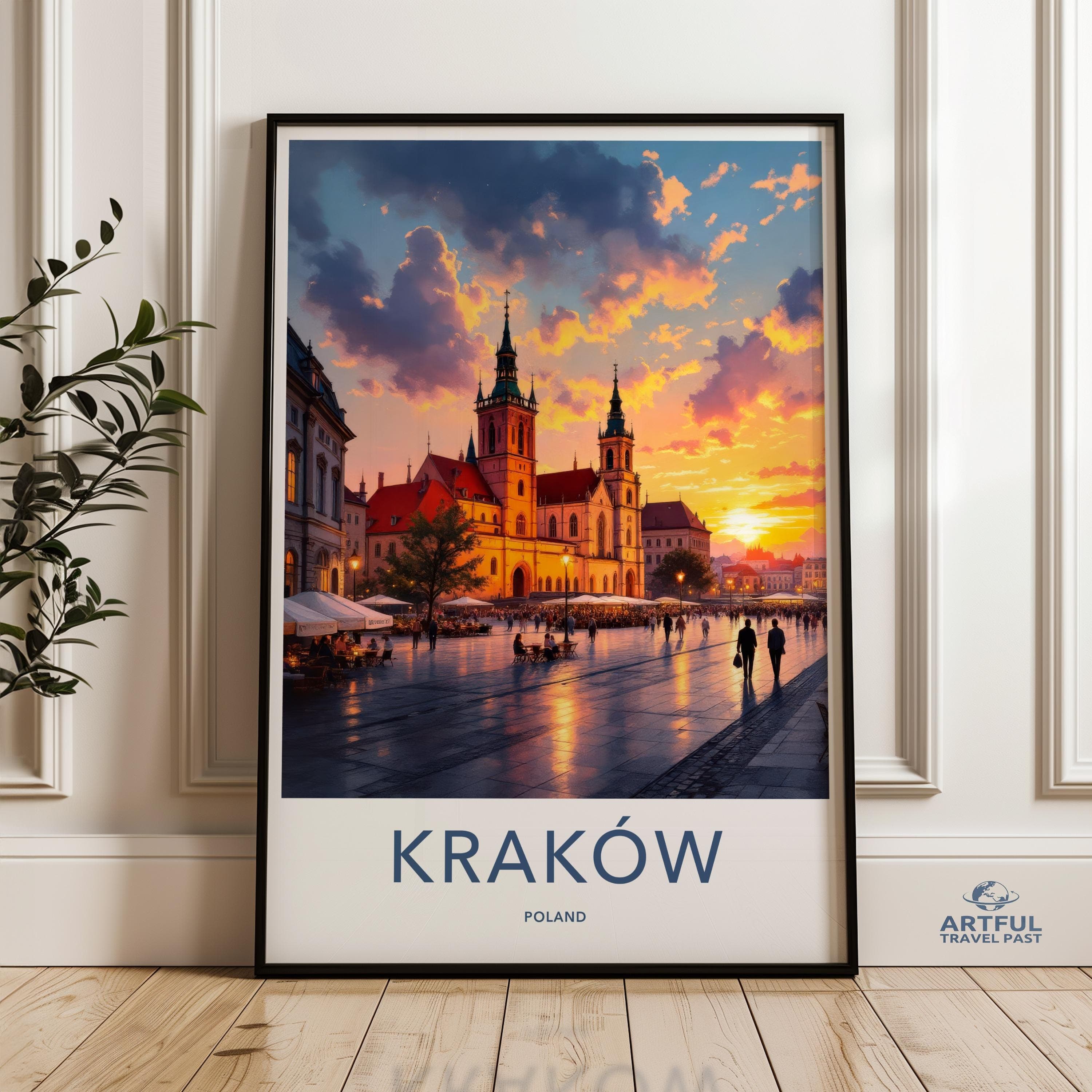 Experience the charm of Kraków, Poland, through this stunning wall art capturing a sunset over the historic Market Square. Known for its vibrant medieval architecture, cobblestone streets, and rich cultural heritage, Kraków is a city that blends history with modern vitality. The square, with its iconic St. Mary's Basilica and lively atmosphere, has been a central hub since the 13th century, making it a picturesque and captivating destination.