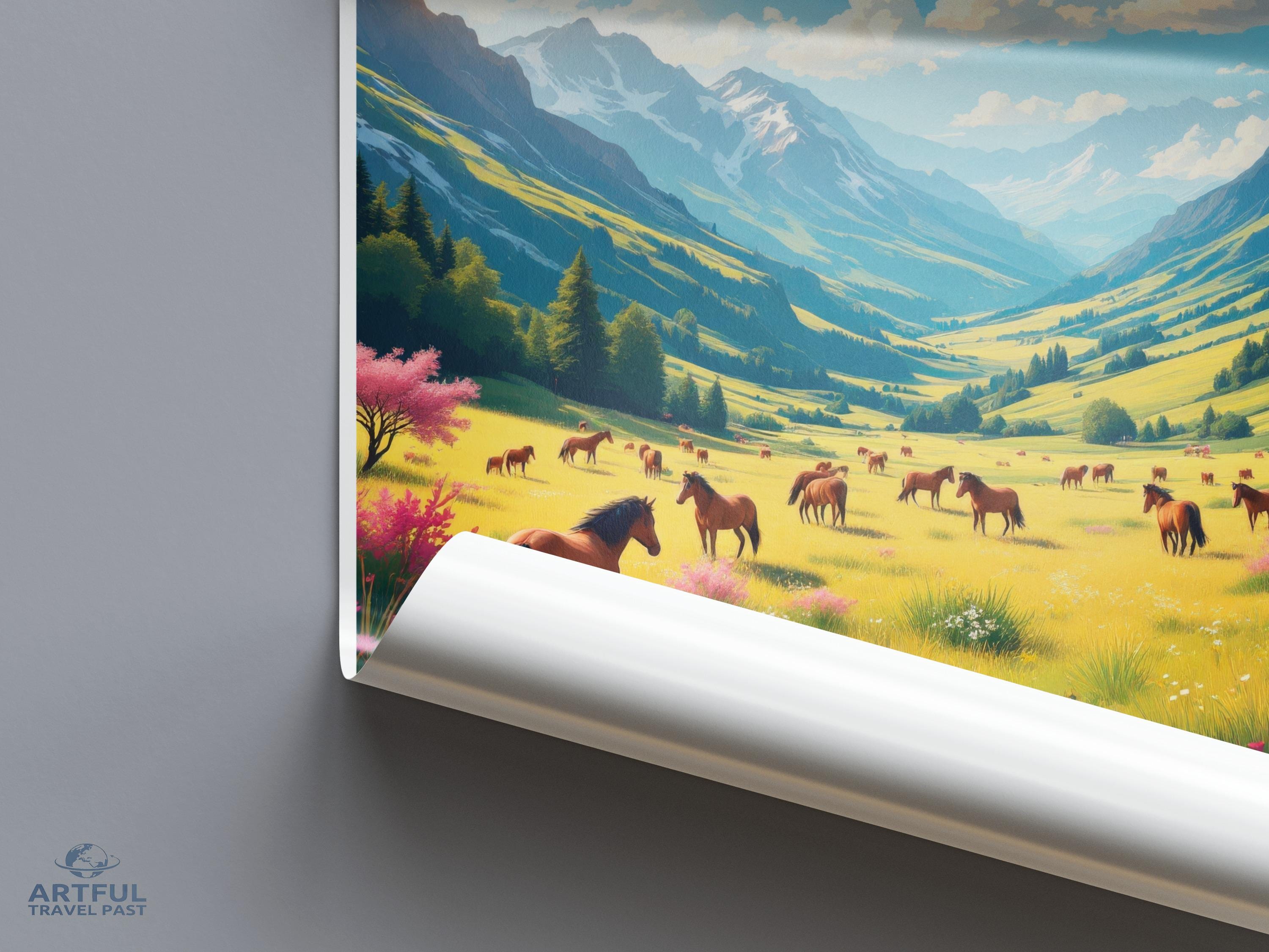 Immerse yourself in the serene beauty of Llogara National Park with this stunning wall art, capturing a verdant valley dotted with wild horses beneath the dramatic peaks of the Ceraunian Mountains. Located in southwestern Albania, this park is renowned for its lush forests, alpine meadows, and breathtaking vistas. Established in 1966, Llogara is a haven for nature enthusiasts, offering a picturesque blend of tranquility and adventure.