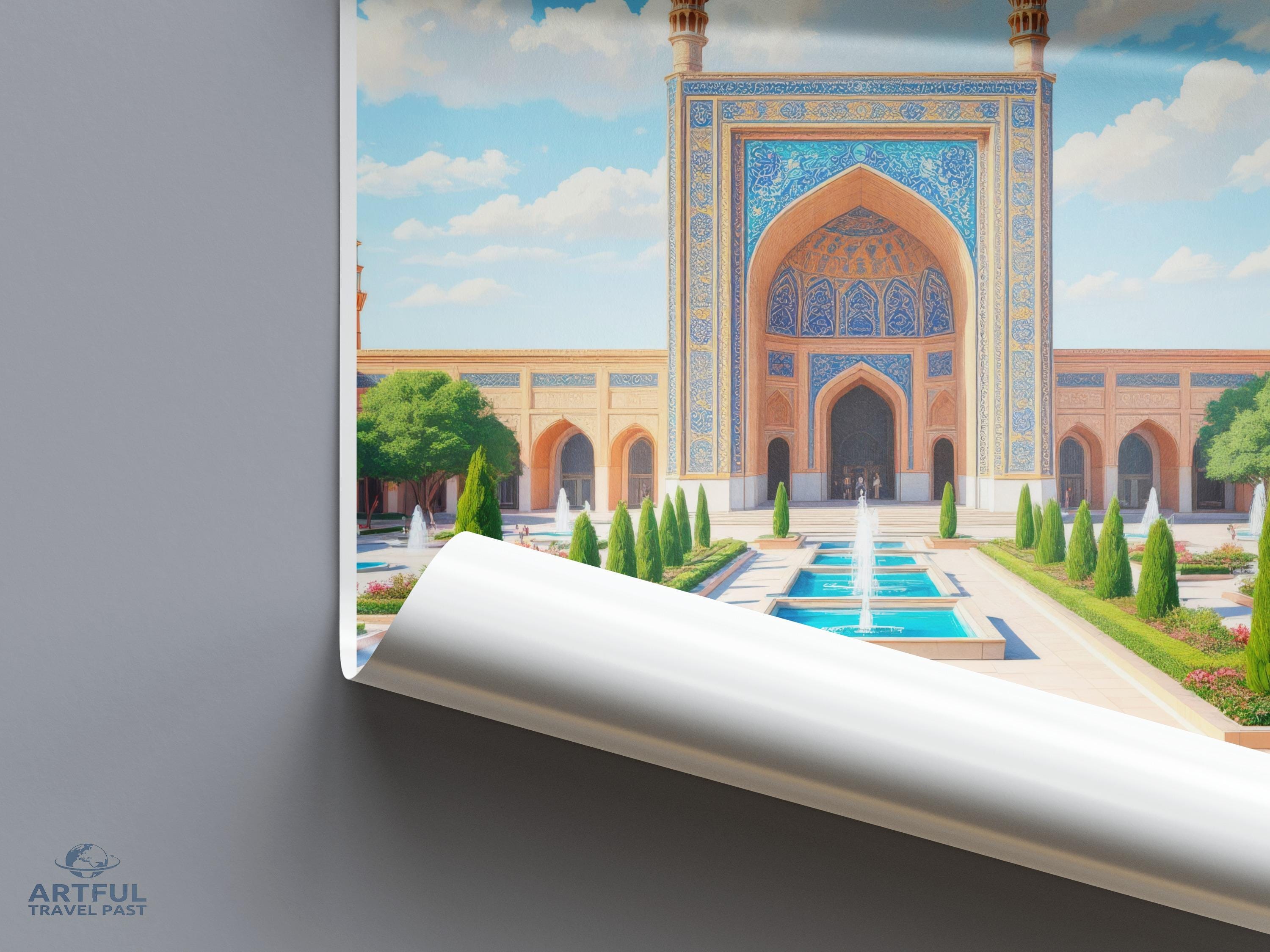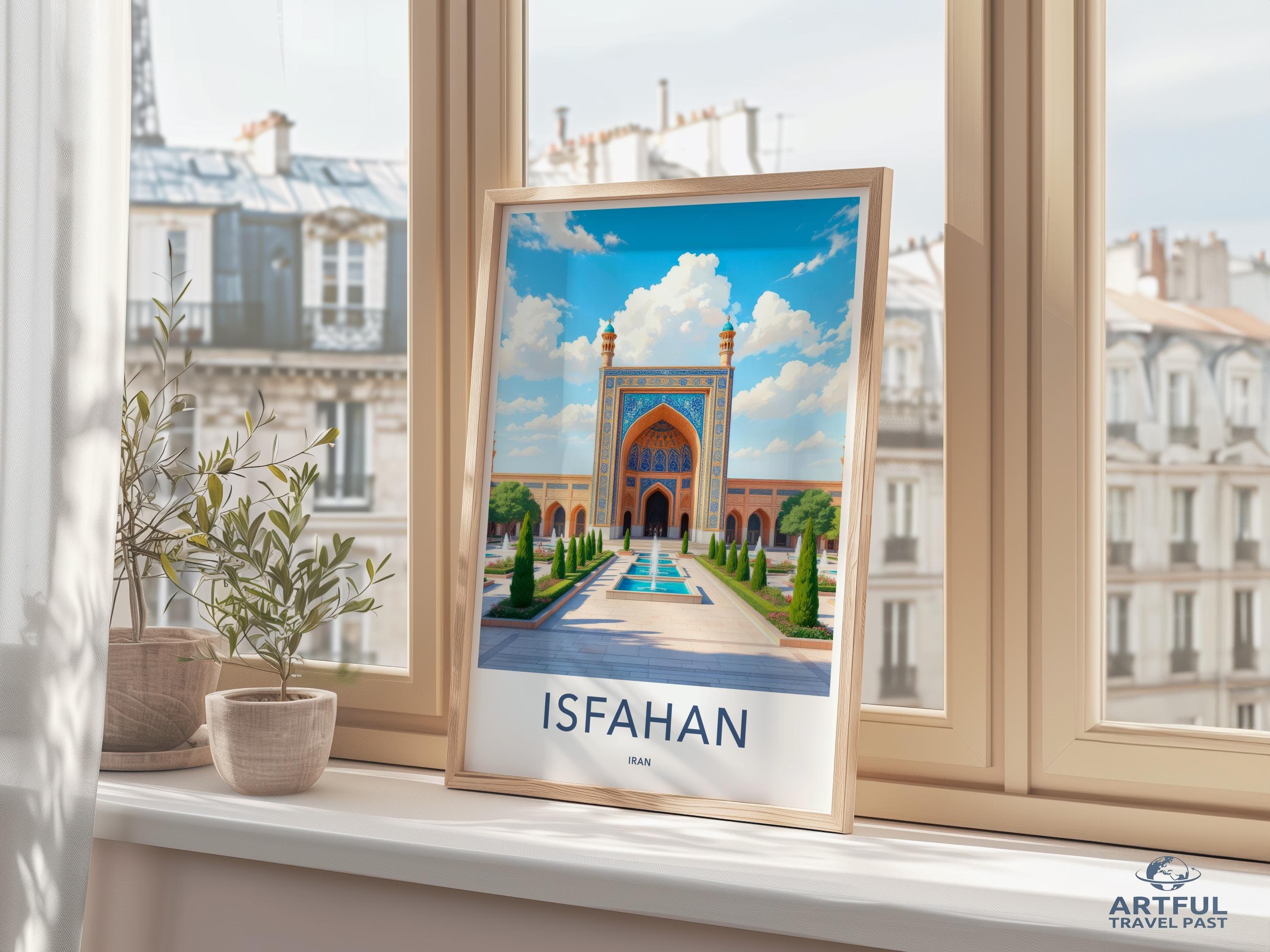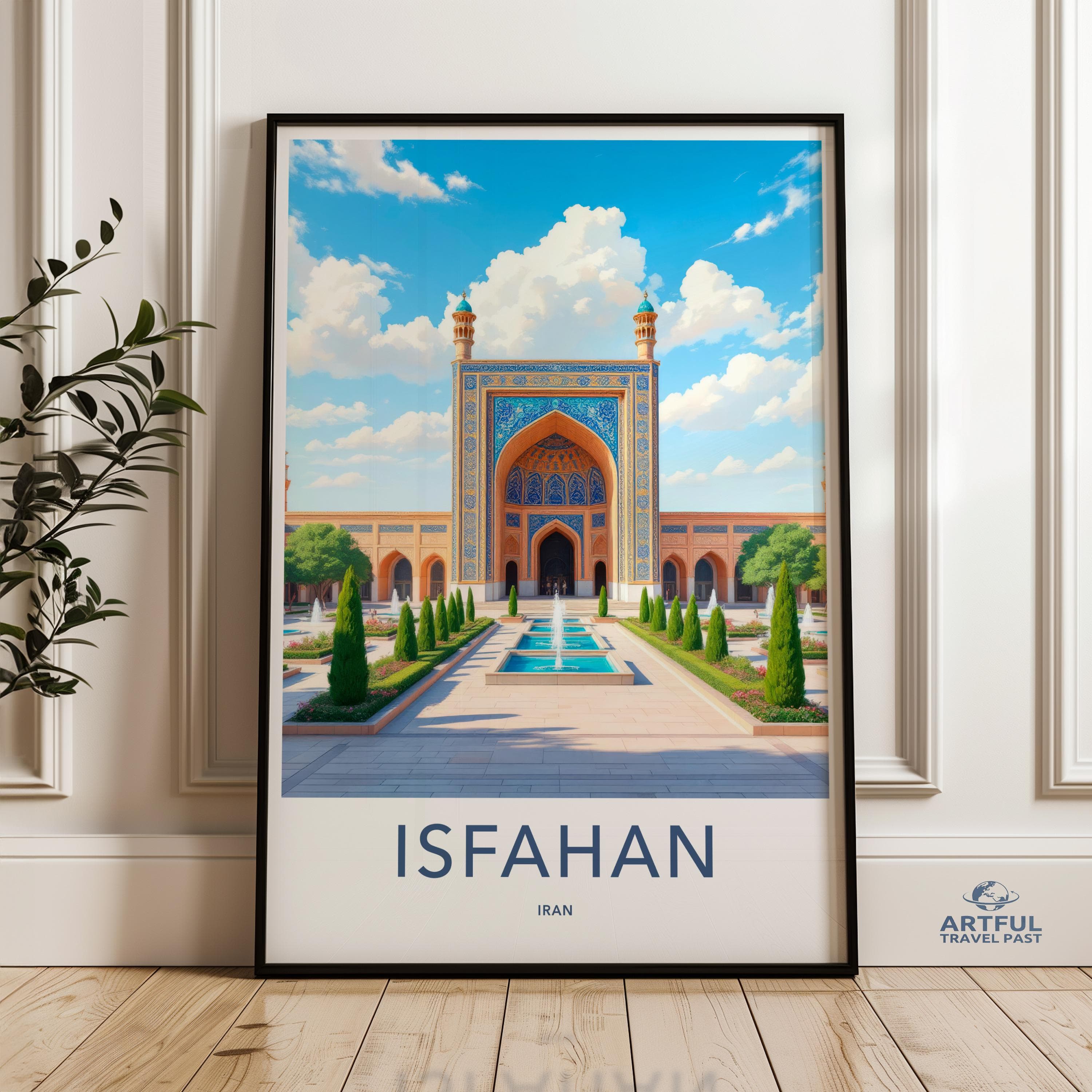 This stunning wall art captures the breathtaking beauty of Isfahan, Iran's historic city known for its stunning Persian architecture. Dominating the scene is the majestic mosque with its exquisite blue-tiled facade and grand courtyard, reflecting the rich cultural heritage of the Safavid era. Isfahan, often referred to as "Nesf-e-Jahan" or "Half of the World," enchants with its lush gardens, lively bazaars, and intricate craftsmanship, making it a true gem of the Middle East.