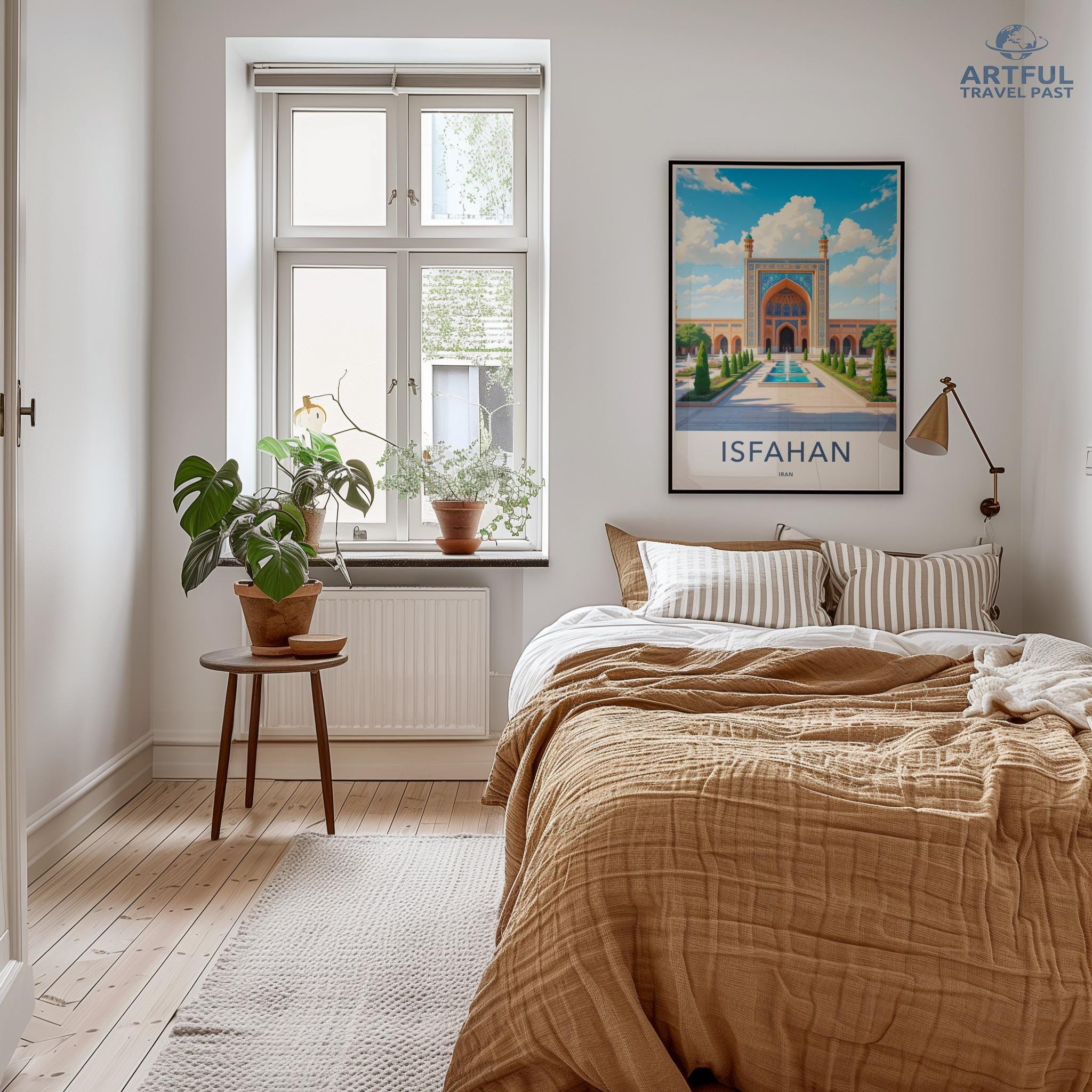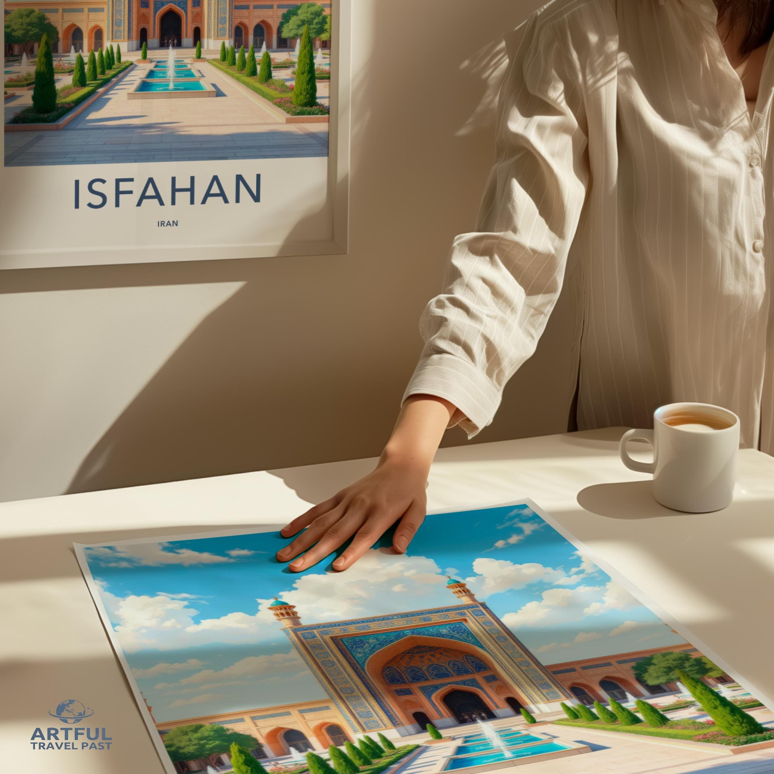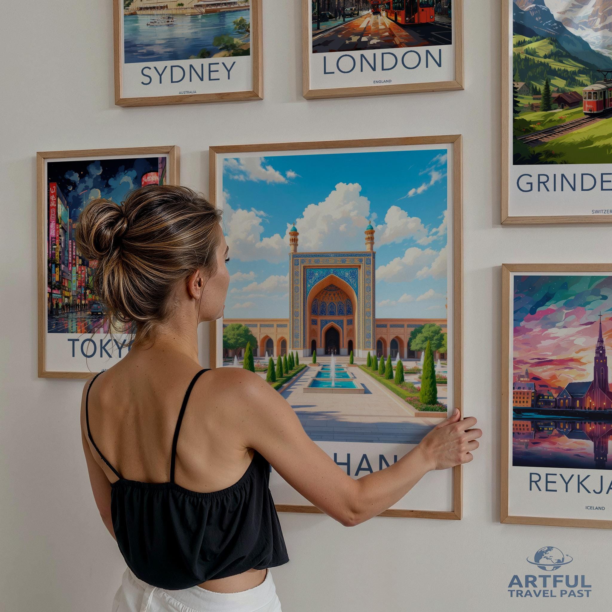 This stunning wall art captures the breathtaking beauty of Isfahan, Iran's historic city known for its stunning Persian architecture. Dominating the scene is the majestic mosque with its exquisite blue-tiled facade and grand courtyard, reflecting the rich cultural heritage of the Safavid era. Isfahan, often referred to as "Nesf-e-Jahan" or "Half of the World," enchants with its lush gardens, lively bazaars, and intricate craftsmanship, making it a true gem of the Middle East.