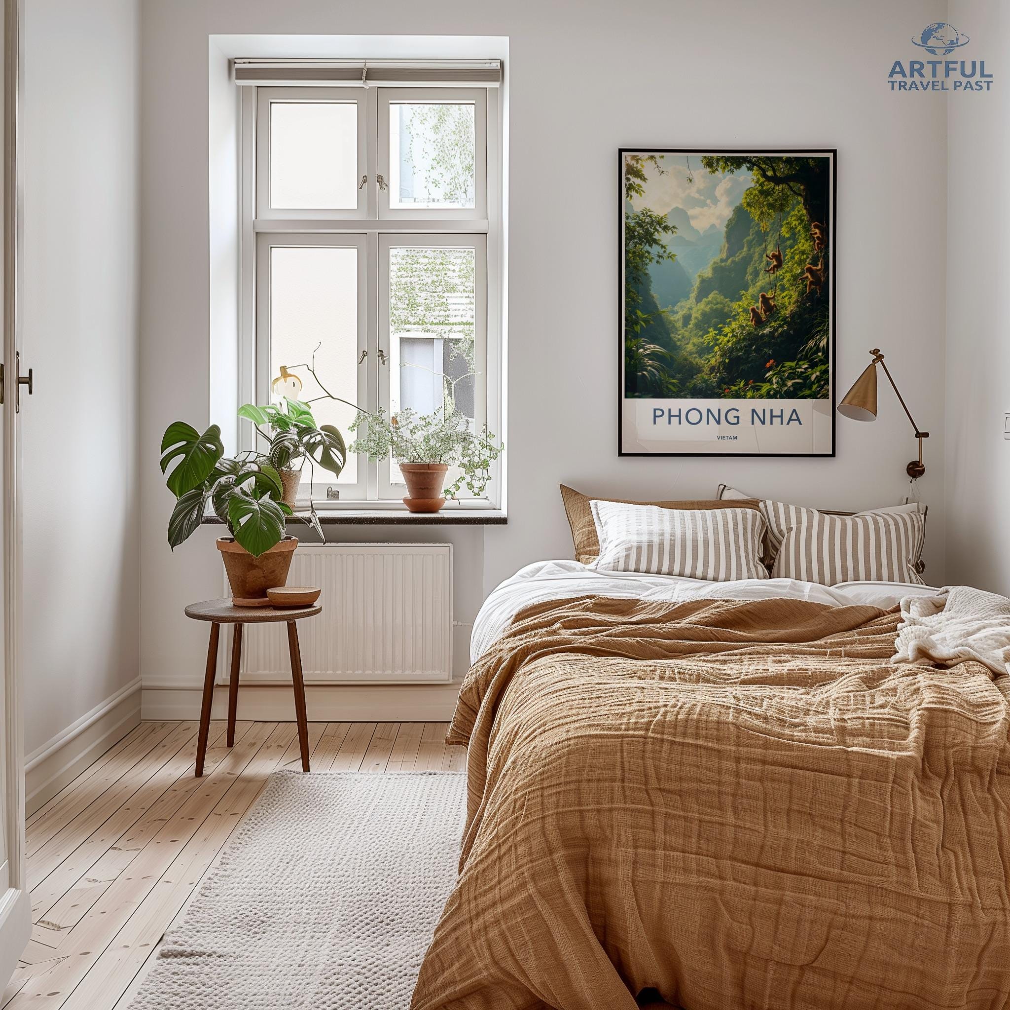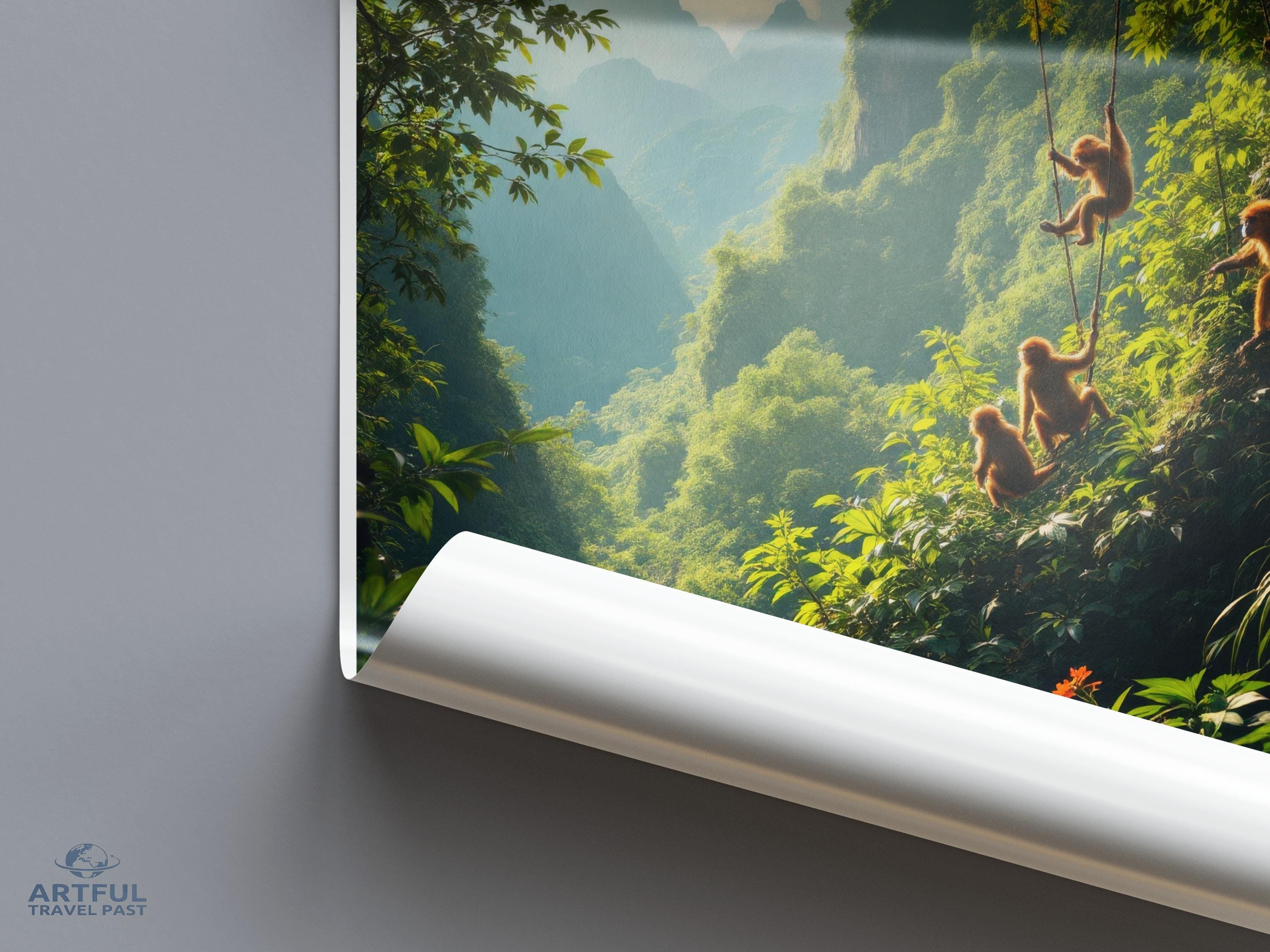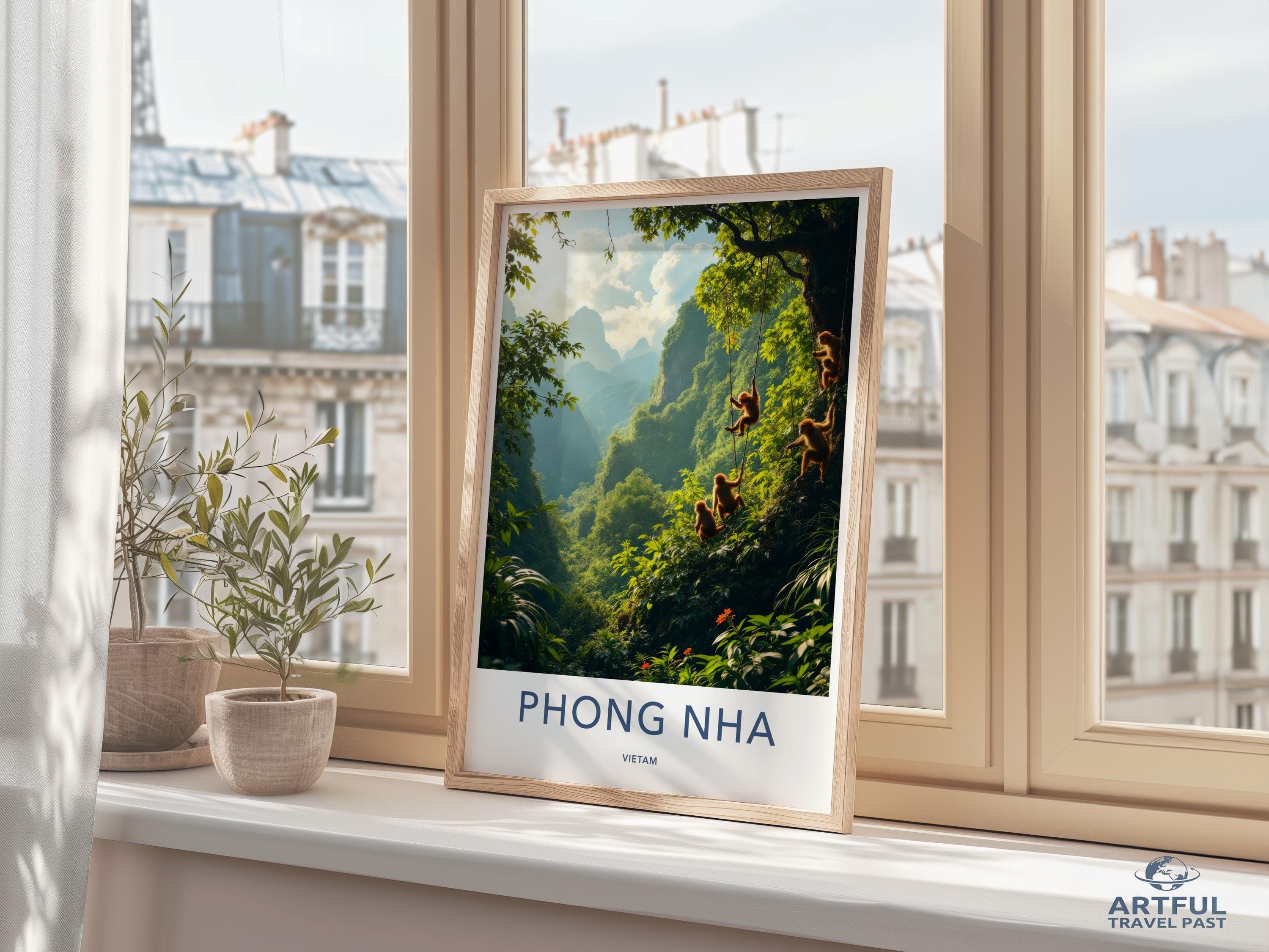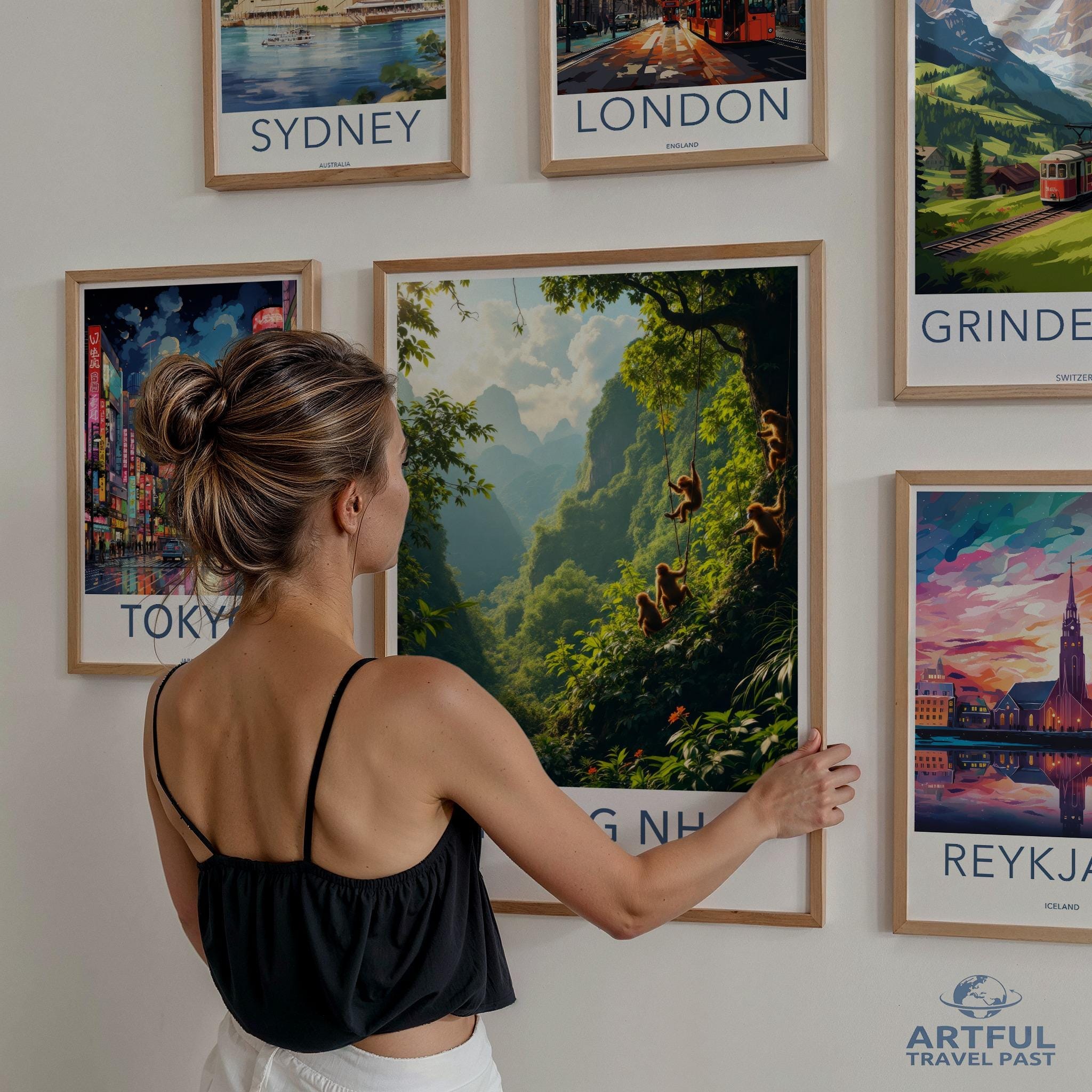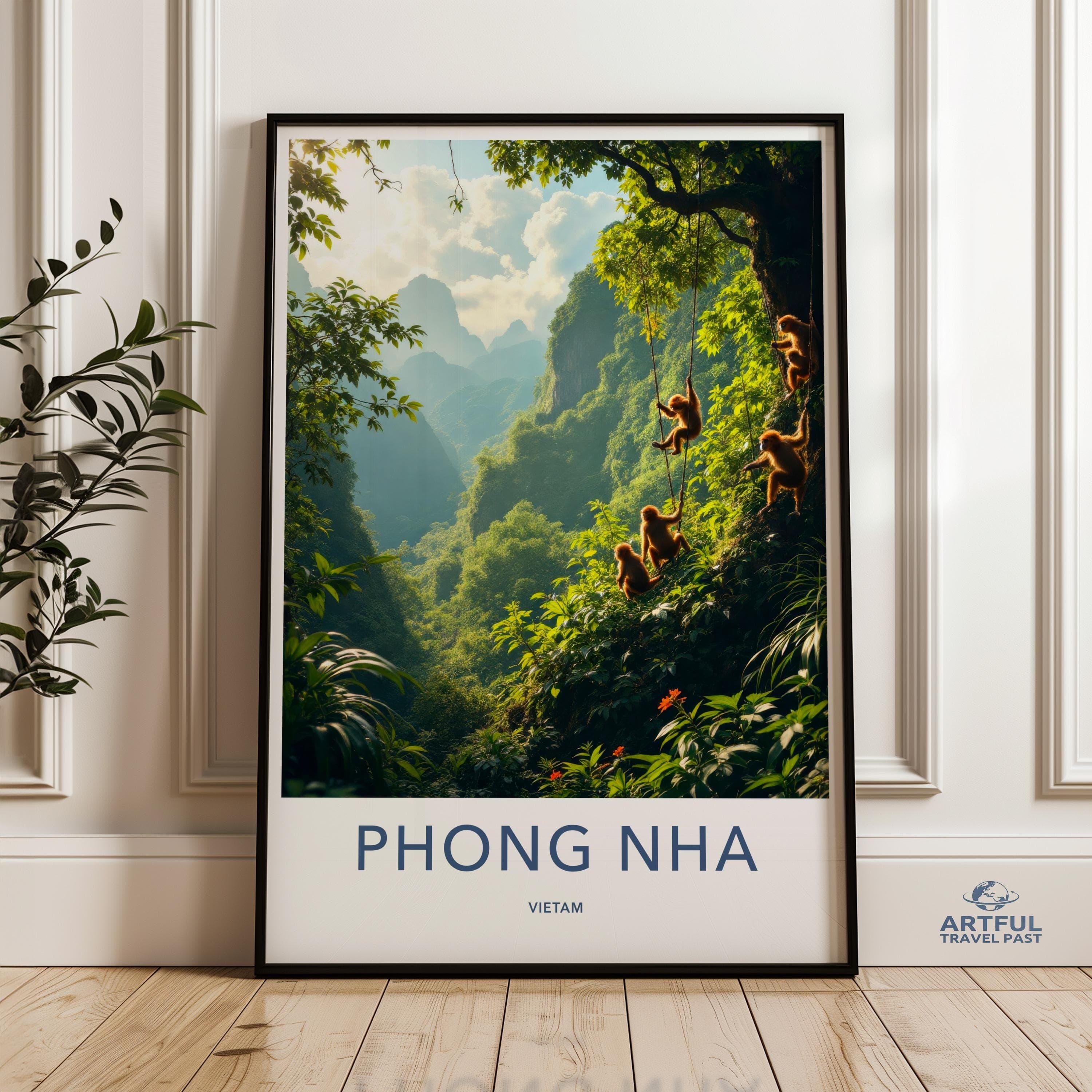 This stunning wall art captures the breathtaking beauty of Phong Nha, Vietnam, renowned for its lush jungles and remarkable limestone karsts. Phong Nha-Ke Bang National Park, a UNESCO World Heritage site, is home to vast networks of caves and pristine river systems. The local wildlife, including playful monkeys, adds to the enchanting atmosphere. Perfect for nature enthusiasts and adventure seekers, this piece brings a slice of Vietnamese paradise to your home.