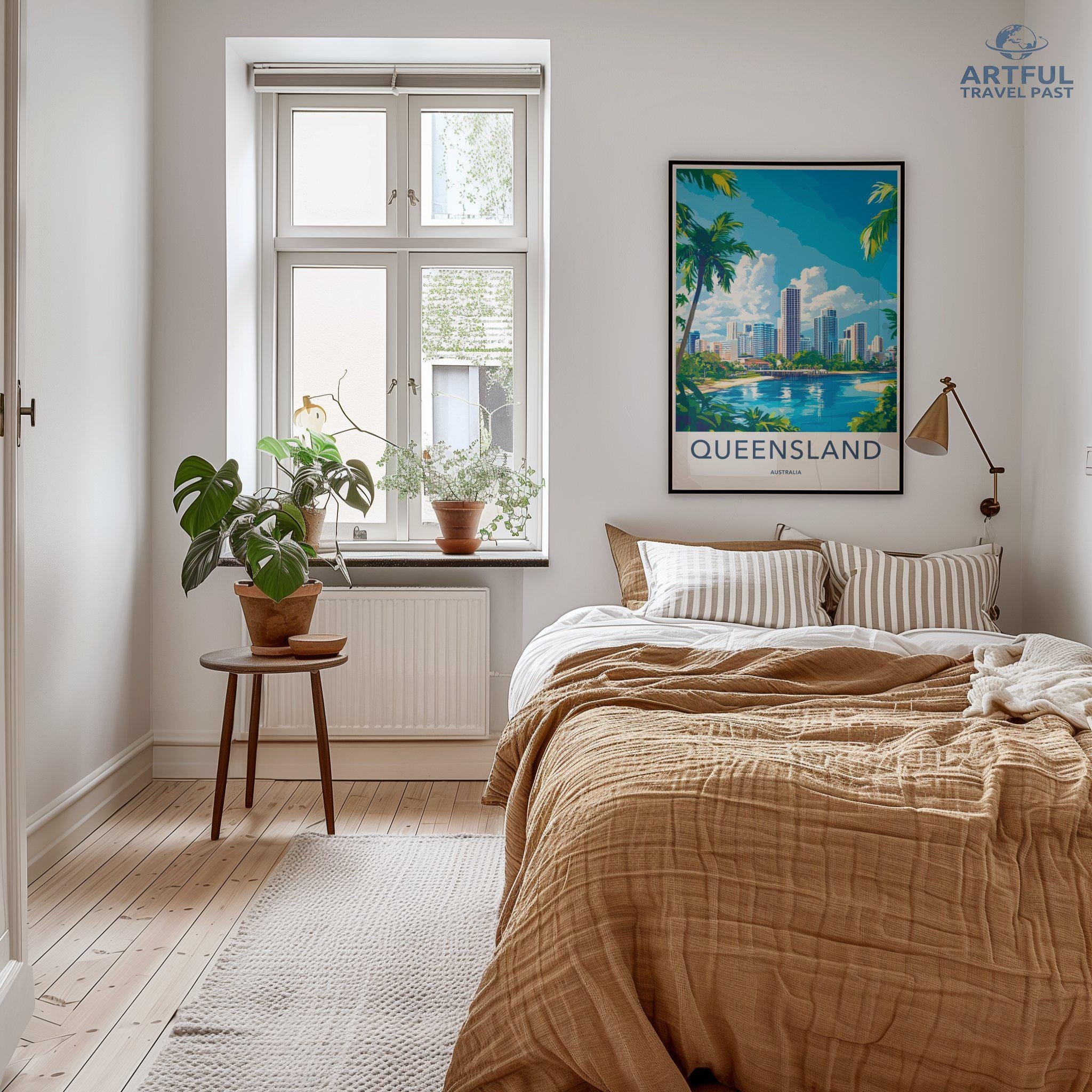 Discover Queensland, Australia through this vibrant wall art. Marvel at the striking skyline, lush greenery, and tranquil waters. Queensland's blend of modern architecture, pristine beaches, and rich cultural landmarks make it an unforgettable destination. This piece captures the essence of its diverse landscapes and lively urban spaces, offering a glimpse into the natural beauty and historical depth of this unique region. Perfect addition to any decor, bringing the spirit of Queensland to your home.