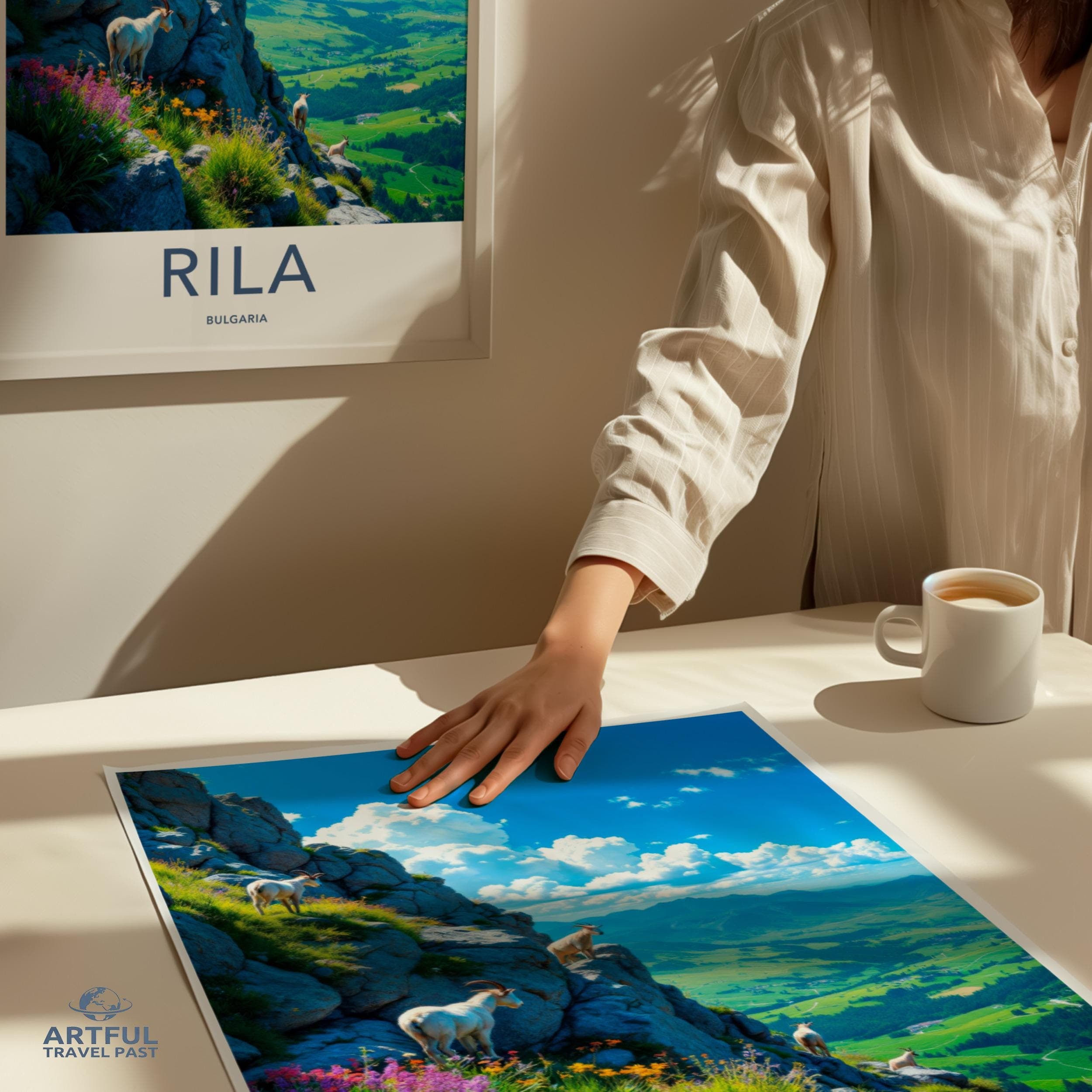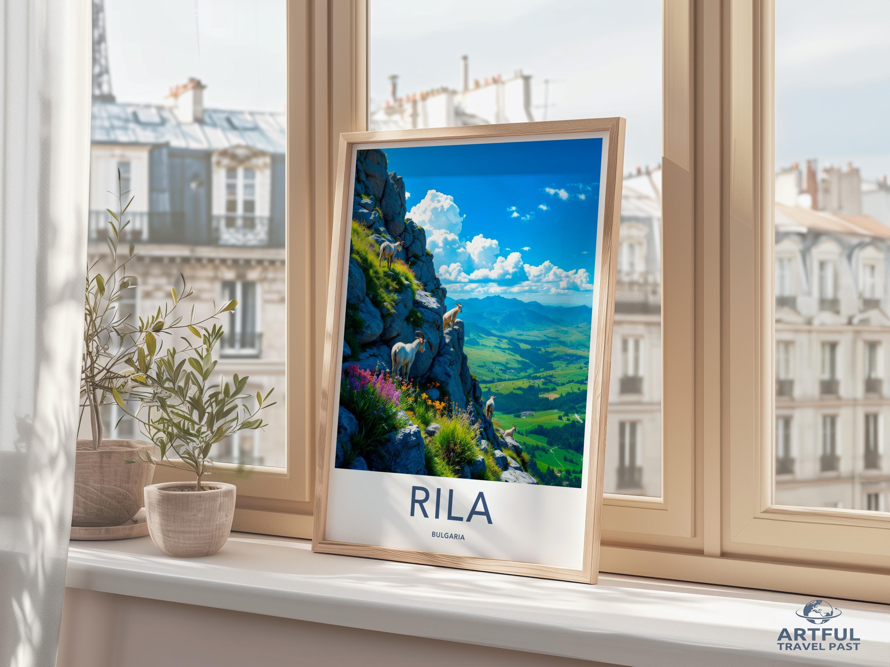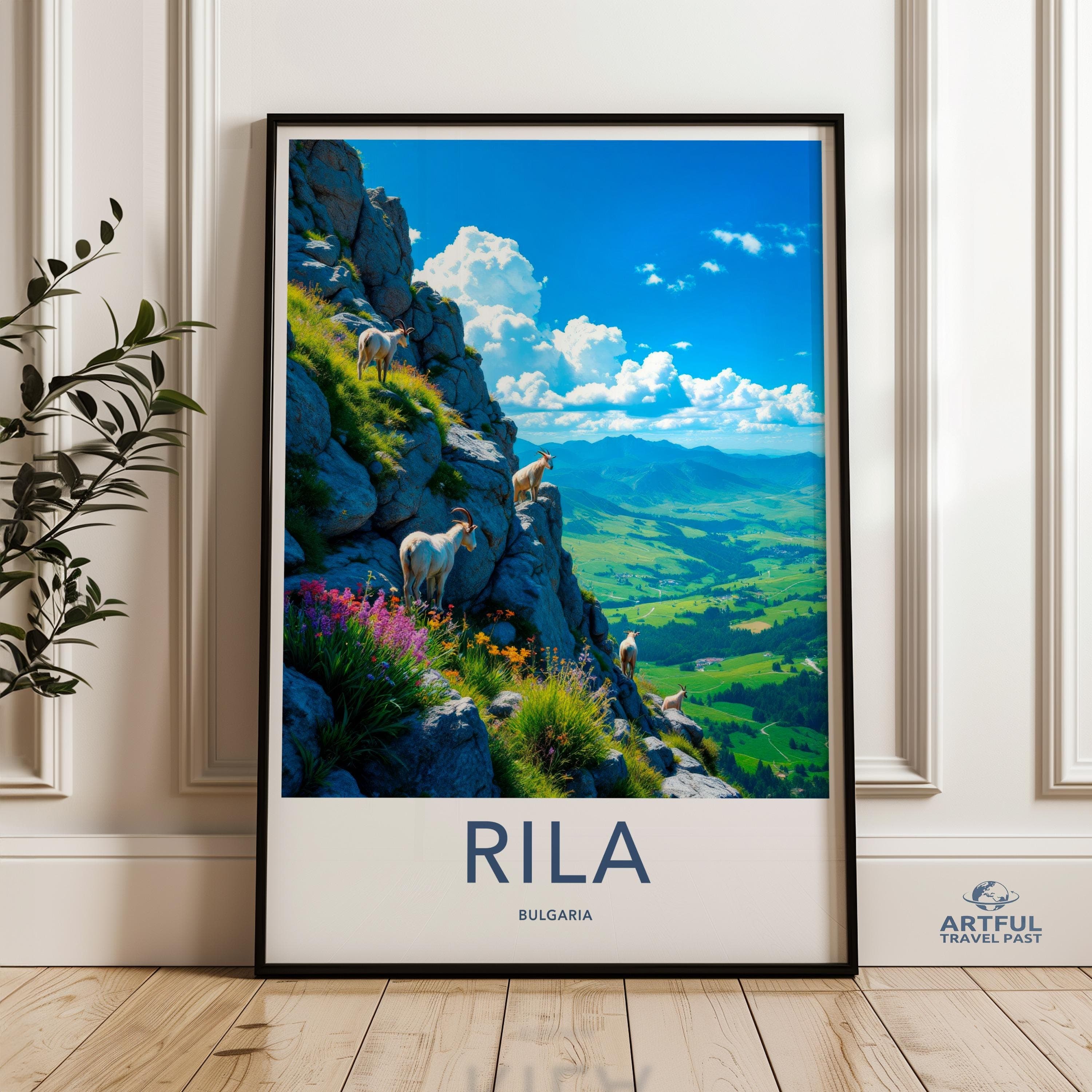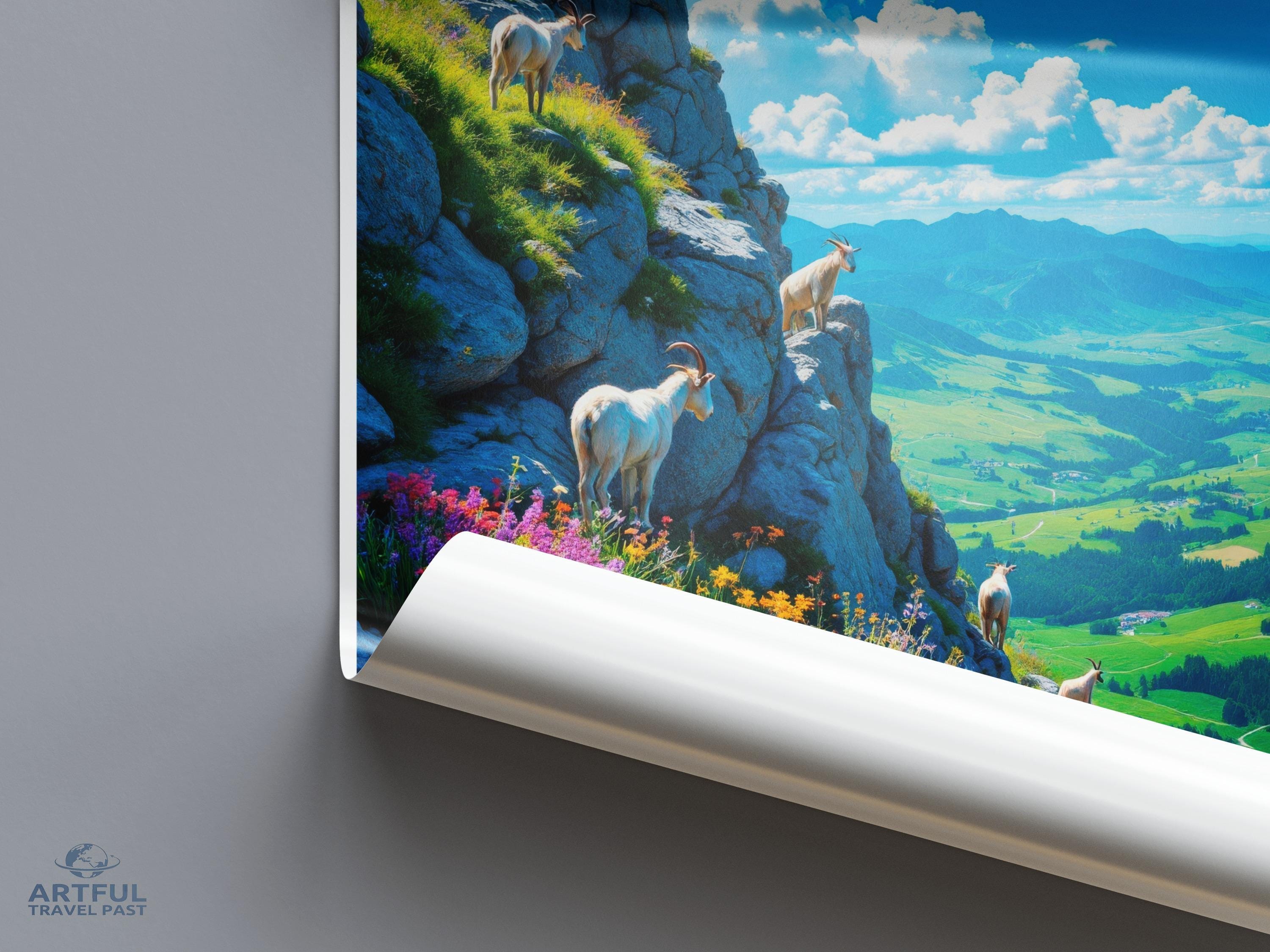 Immerse yourself in the stunning beauty of Rila, Bulgaria, captured in this breathtaking wall art. Rila, known for its scenic mountains and lush landscapes, is home to the famous Rila Monastery, a UNESCO World Heritage site. This image portrays roaming goats amidst vibrant wildflowers and rugged rocks, set against a backdrop of expansive valleys and rolling hills. Perfect for nature lovers and adventurers alike, this piece brings a touch of Bulgarian charm and natural splendor to your space.