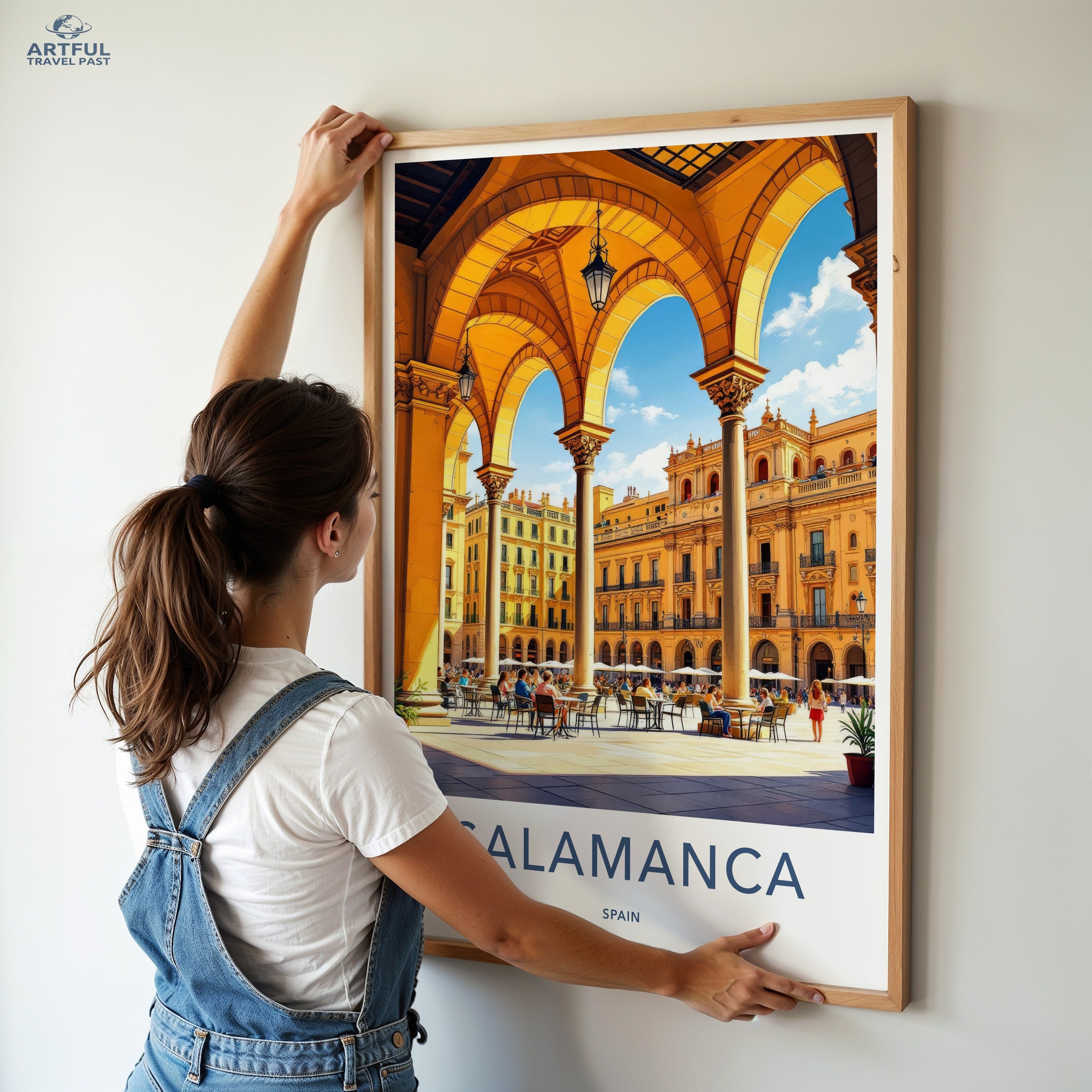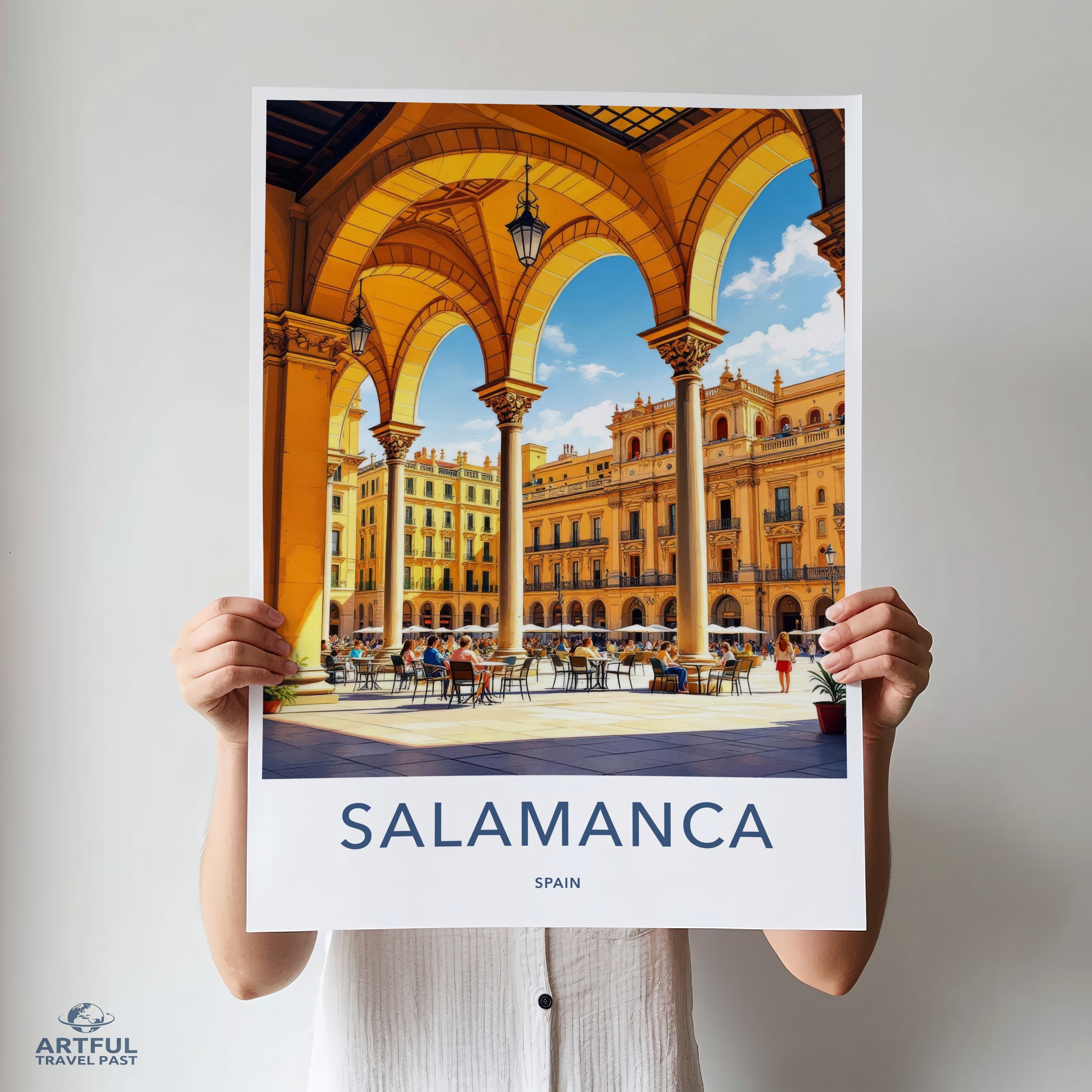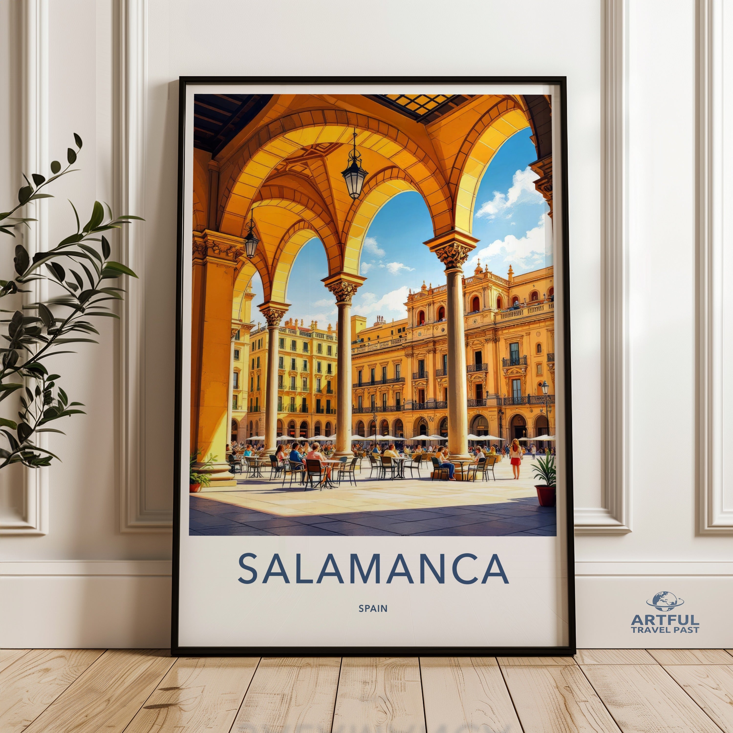 Discover the enchanting city of Salamanca, Spain, captured in this stunning wall art piece. Known for its golden sandstone architecture, Salamanca is home to one of the oldest universities in Europe, the Universidad de Salamanca, founded in 1218. The majestic Plaza Mayor, an 18th-century Baroque square, serves as the heart of the city, bustling with lively cafés and rich cultural heritage. This artwork beautifully portrays the city's vibrant atmosphere and historical significance.