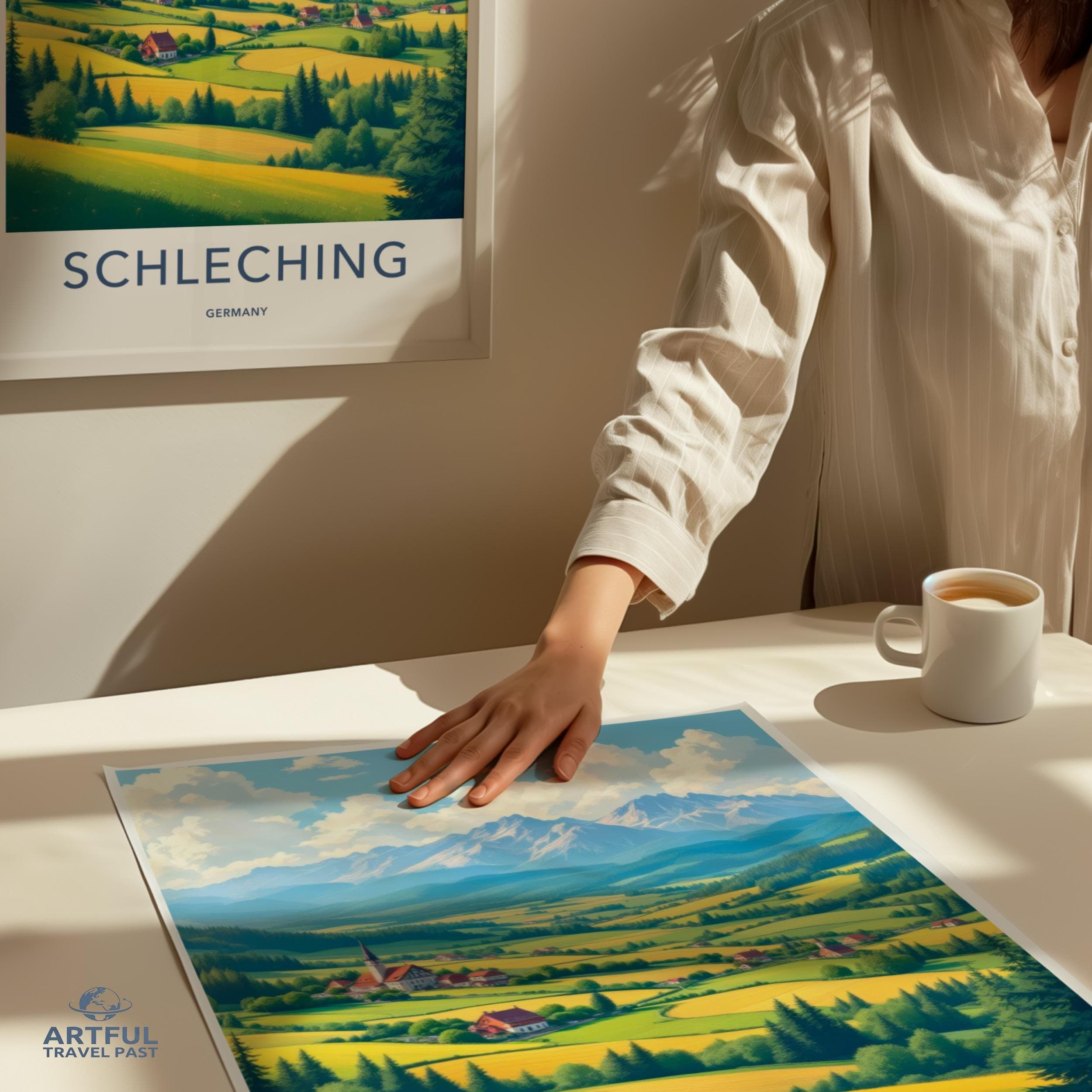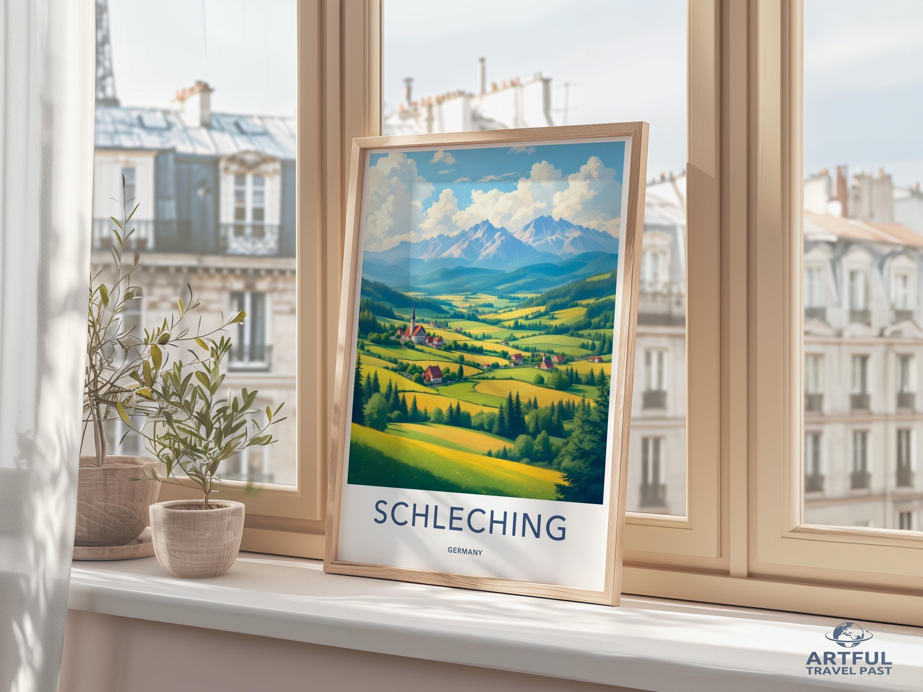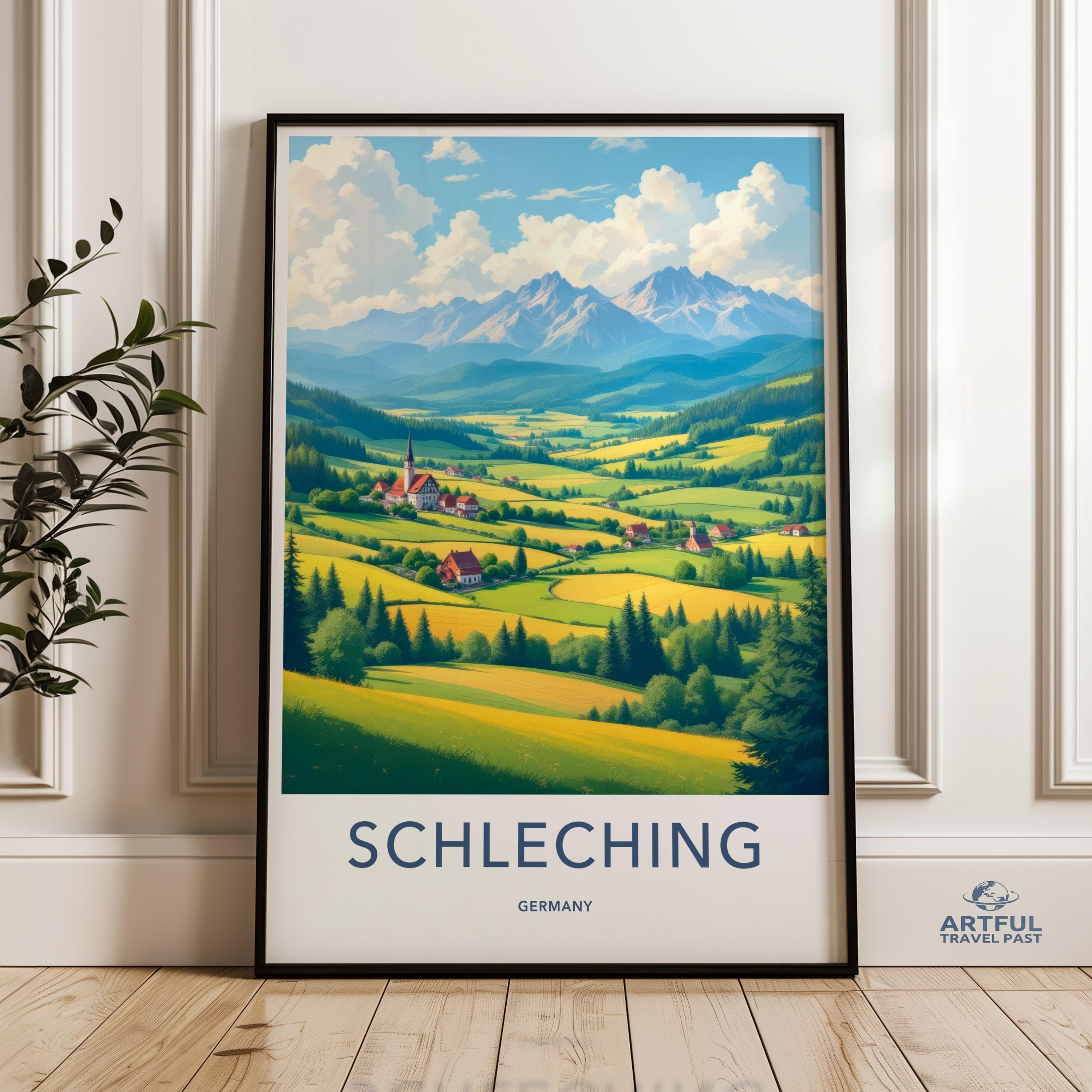 Immerse yourself in the serene beauty of Schleching, Germany with this stunning wall art. This charming village, nestled in the picturesque Bavarian Alps, is renowned for its verdant valleys, traditional architecture, and breathtaking mountain views. Rich in history and culture, Schleching offers a glimpse into timeless rural life. Perfect for adding a touch of tranquil, scenic elegance to any space.