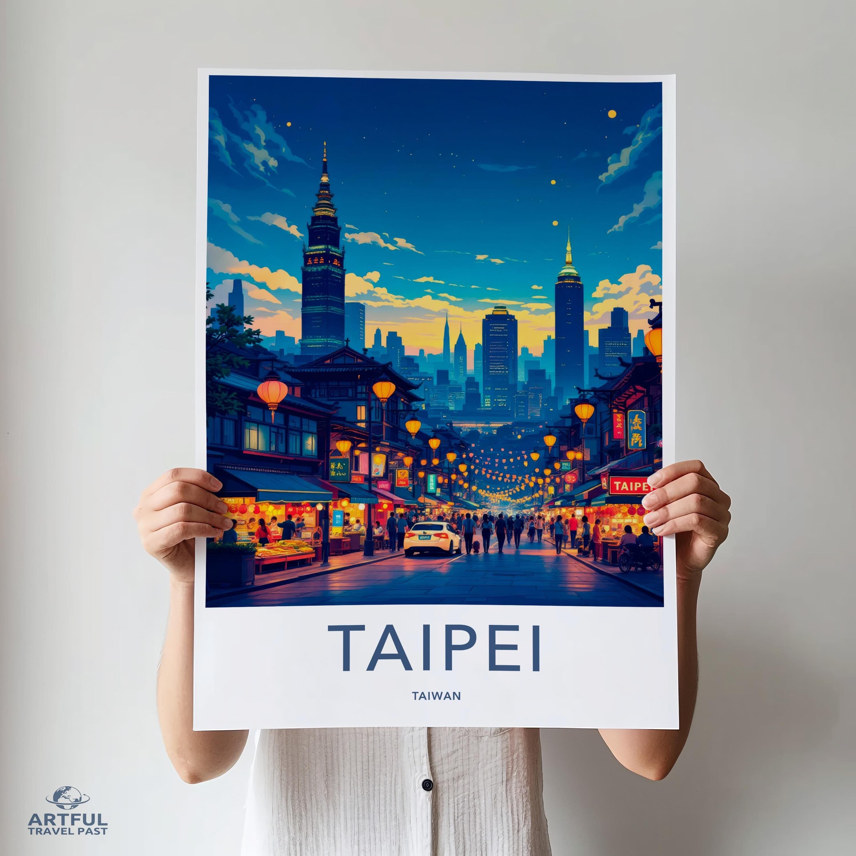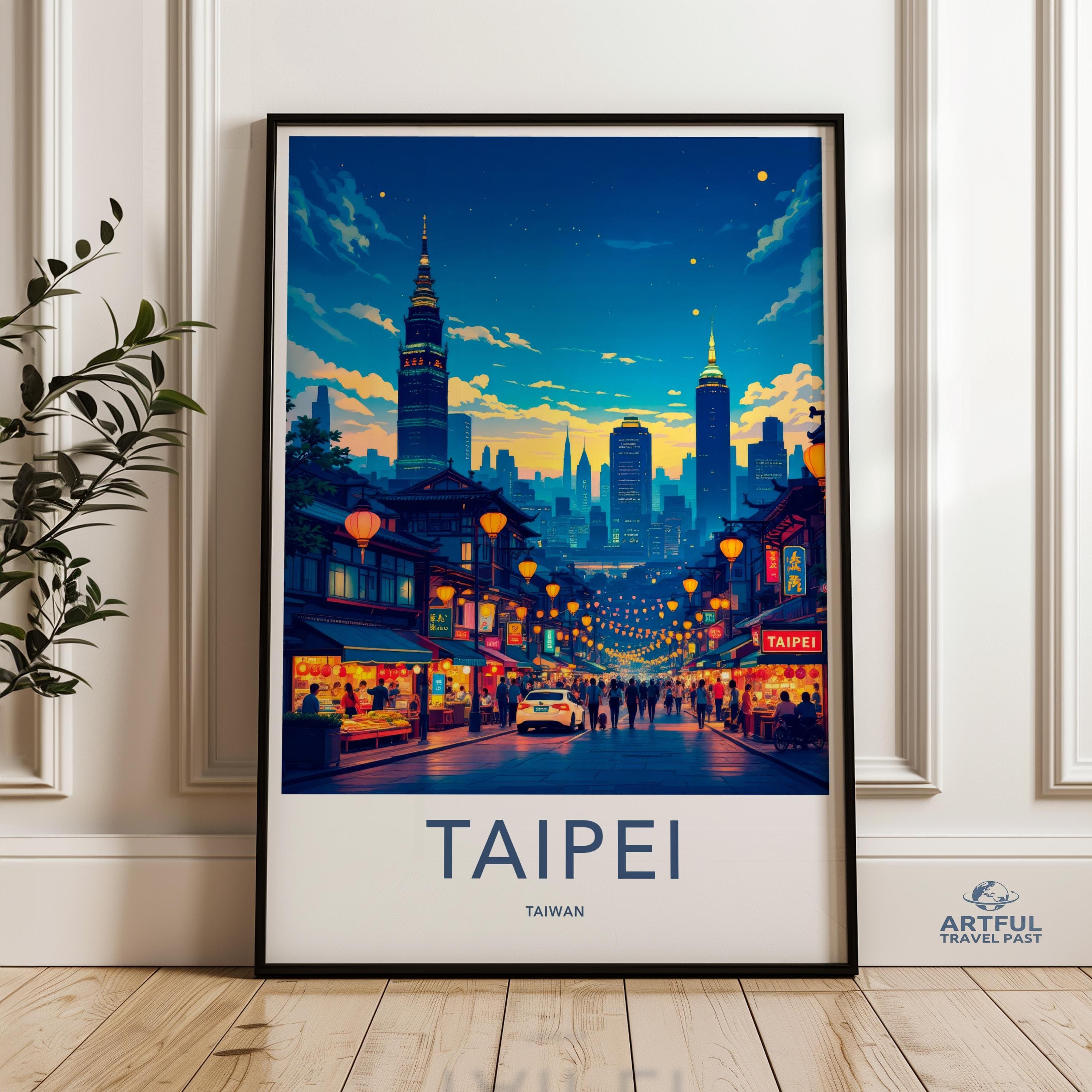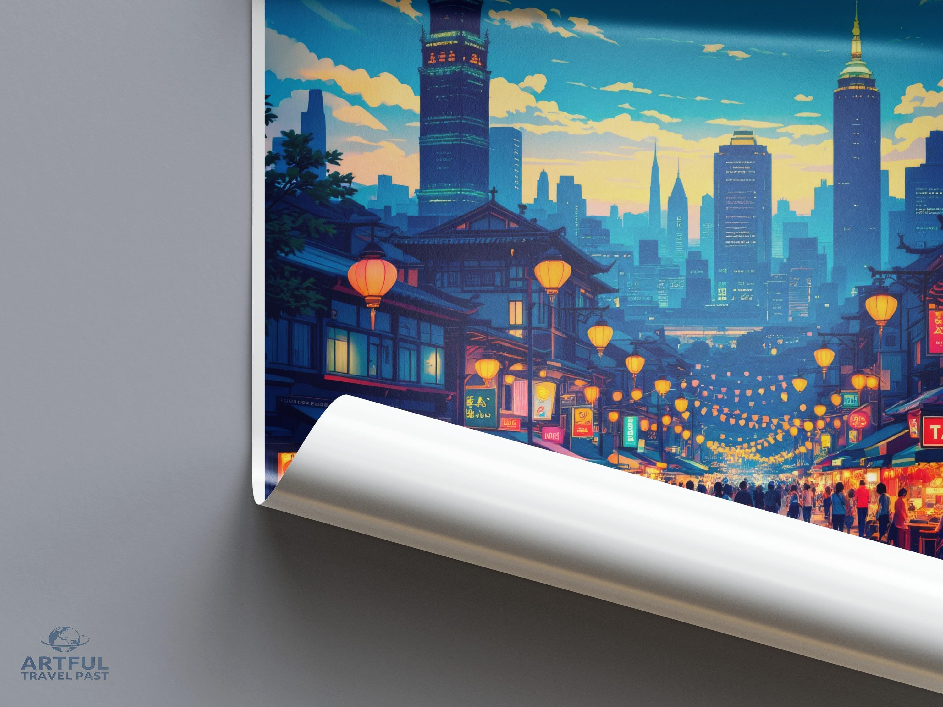 Immerse yourself in the vibrant streets of Taipei, Taiwan, with this stunning wall art piece. Captured at dusk, the city comes alive under the twinkle of lanterns, blending traditional markets with modern skyscrapers in the backdrop. Taipei, known for its rich cultural heritage and bustling night markets, offers a harmonious mix of history and contemporary charm. Let this artwork transport you to a city where every corner tells a story of vibrant life and tradition.