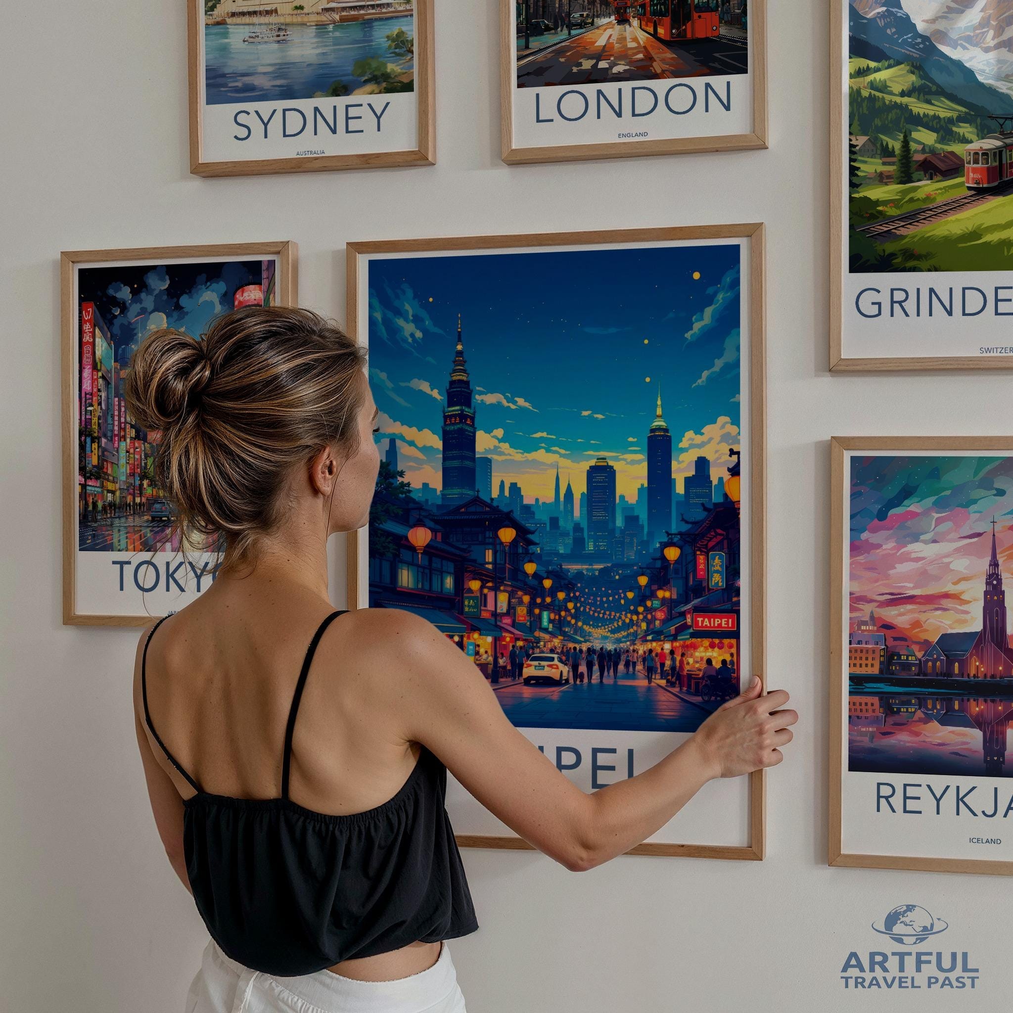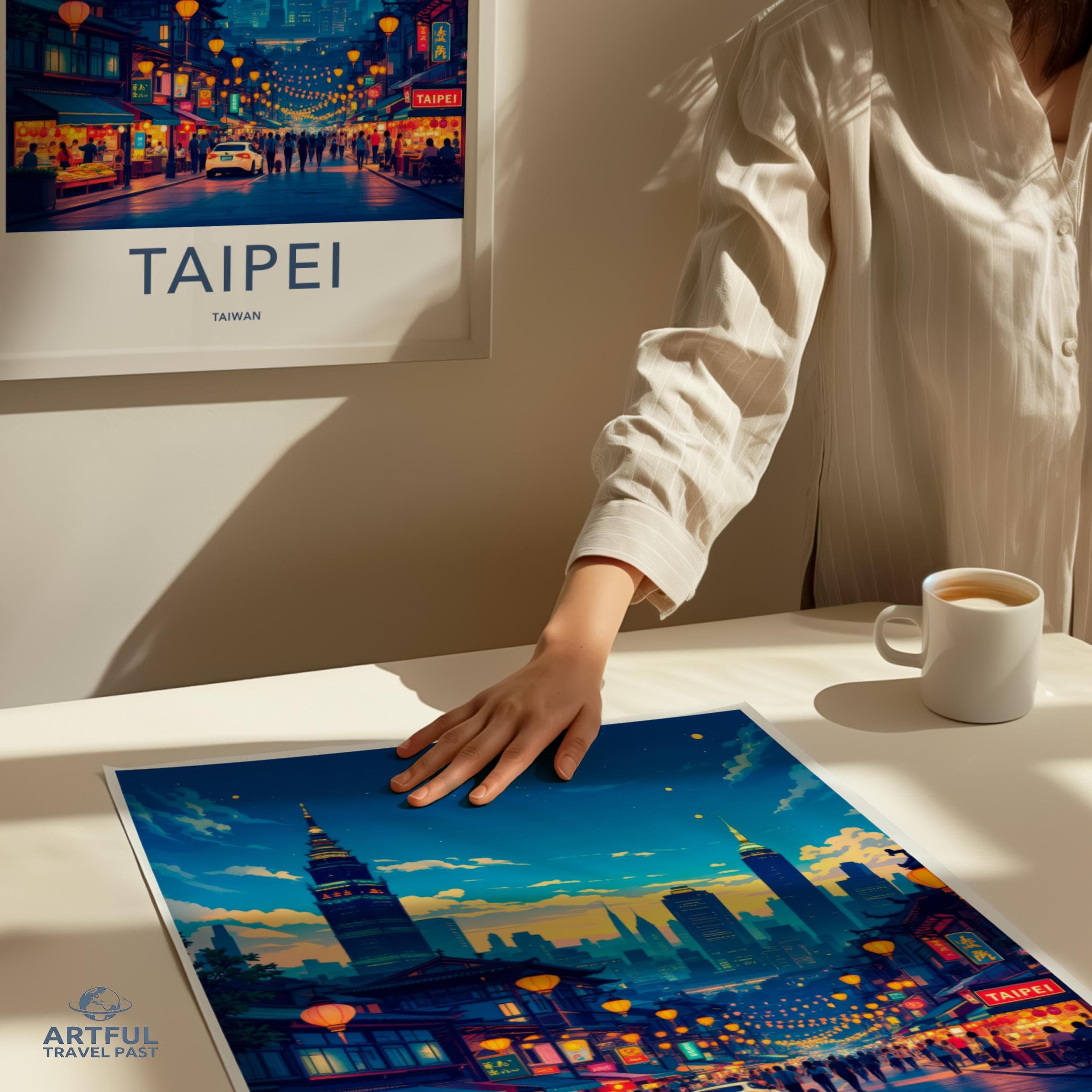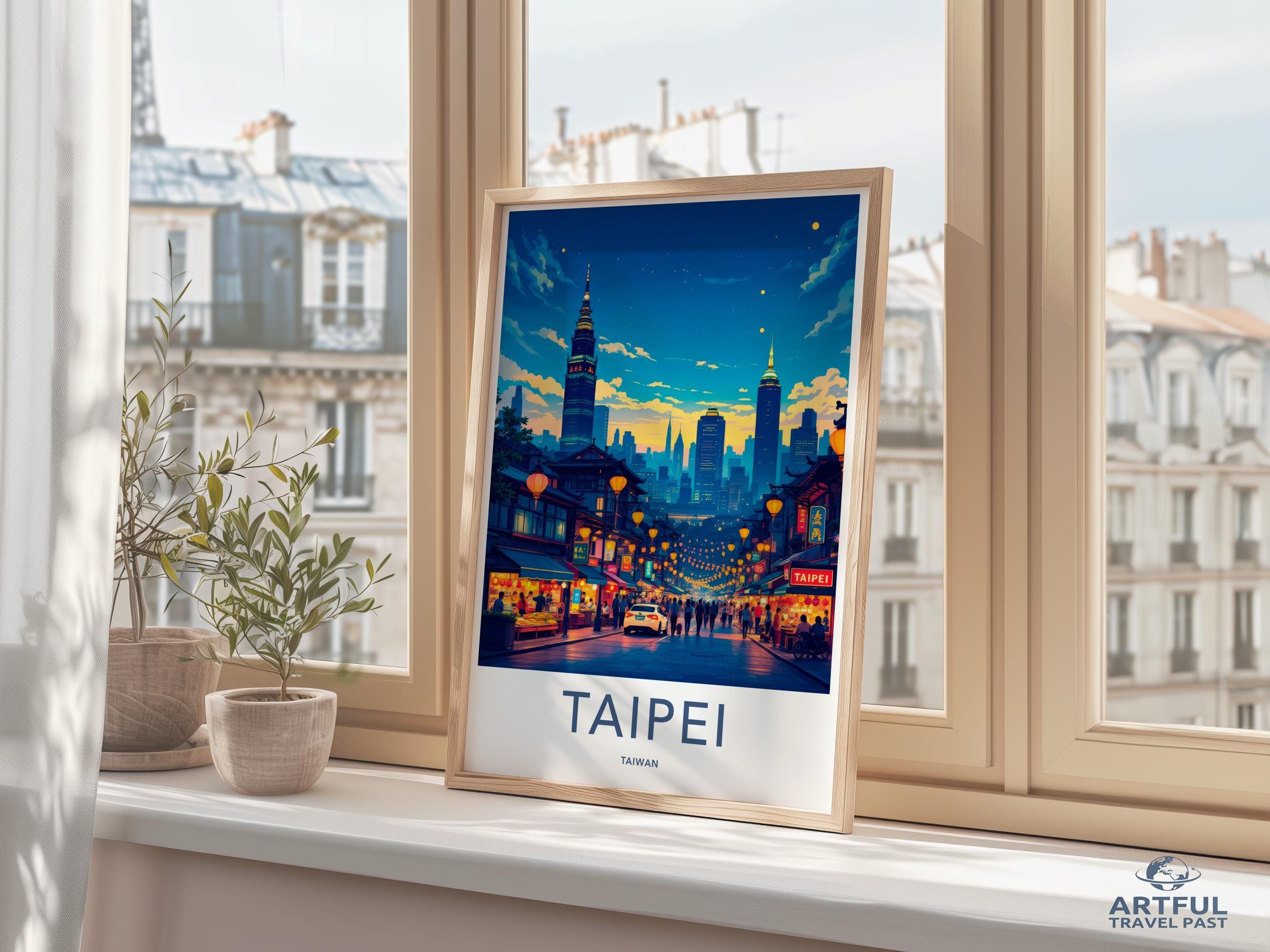 Immerse yourself in the vibrant streets of Taipei, Taiwan, with this stunning wall art piece. Captured at dusk, the city comes alive under the twinkle of lanterns, blending traditional markets with modern skyscrapers in the backdrop. Taipei, known for its rich cultural heritage and bustling night markets, offers a harmonious mix of history and contemporary charm. Let this artwork transport you to a city where every corner tells a story of vibrant life and tradition.