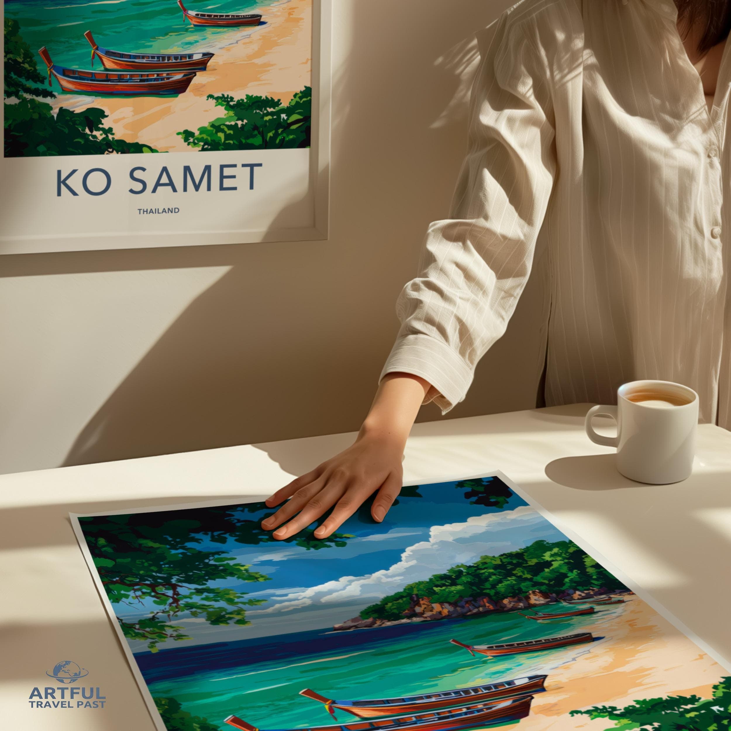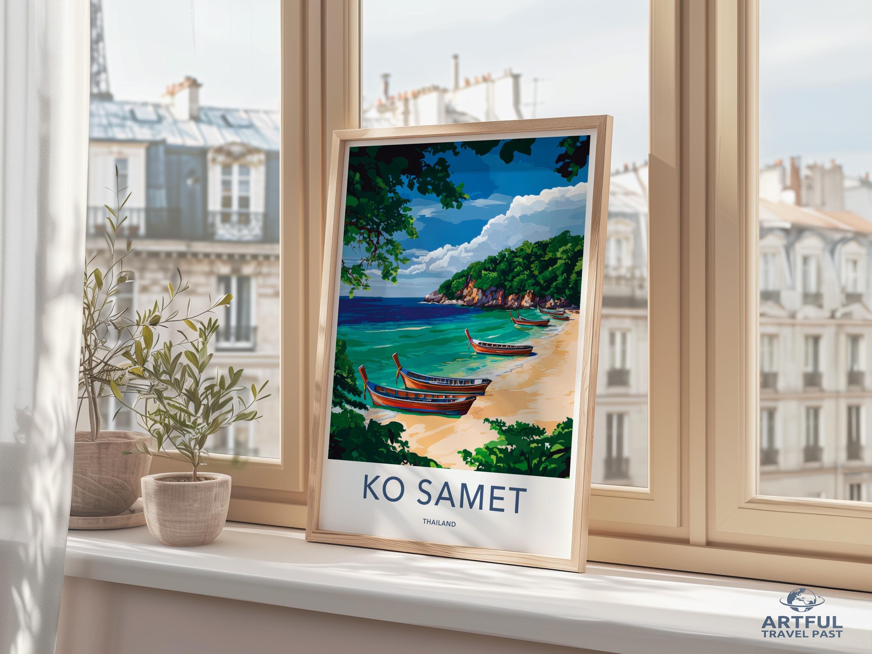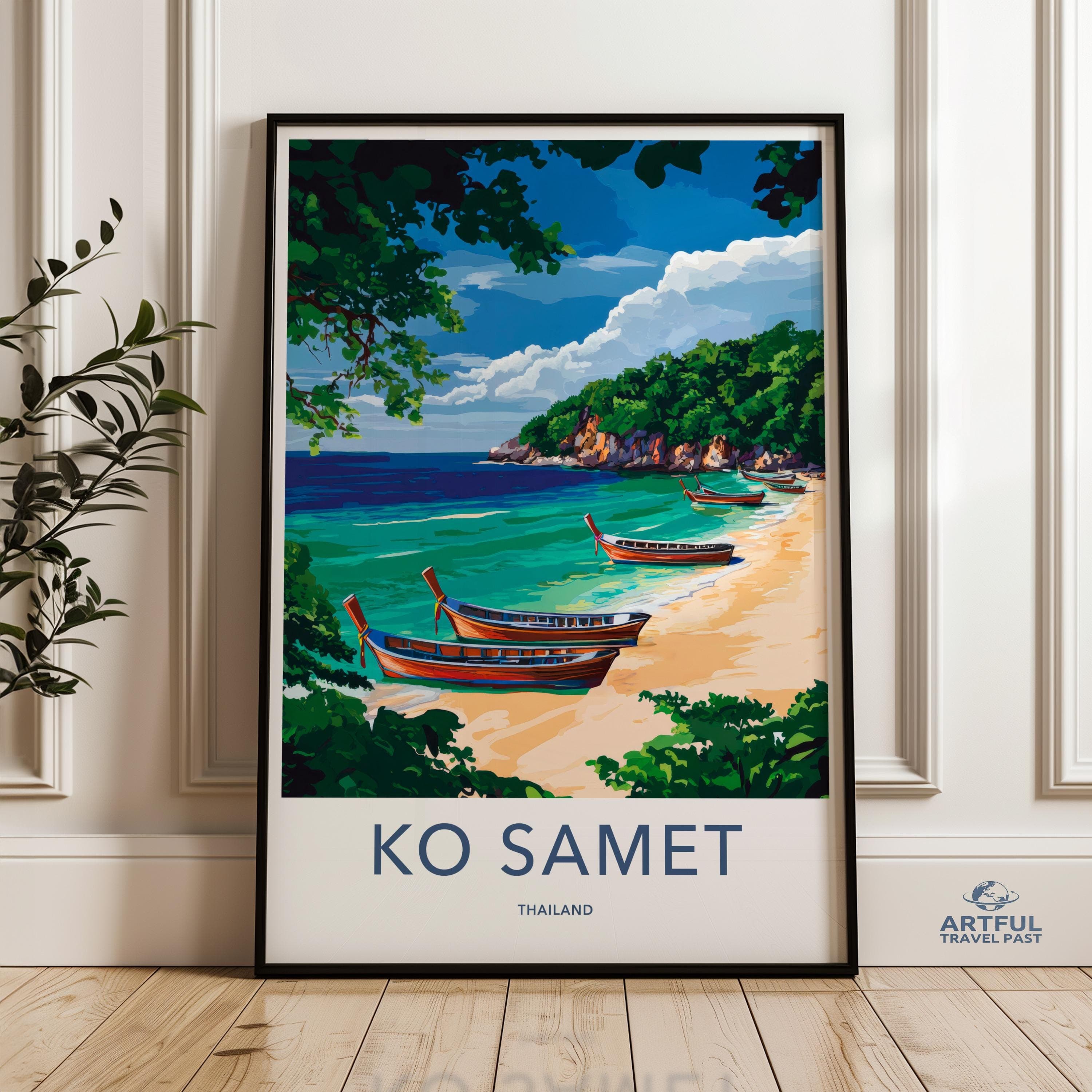 Add a touch of tropical paradise to your space with this vibrant wall art of Ko Samet, Thailand. Located in the Rayong Province, Ko Samet is renowned for its pristine beaches, crystal-clear waters, and lush greenery. This island is steeped in folklore and has long been a refuge for both locals and travelers seeking tranquility and natural beauty. Enjoy the picturesque views and serene ambiance from the comfort of your home.
