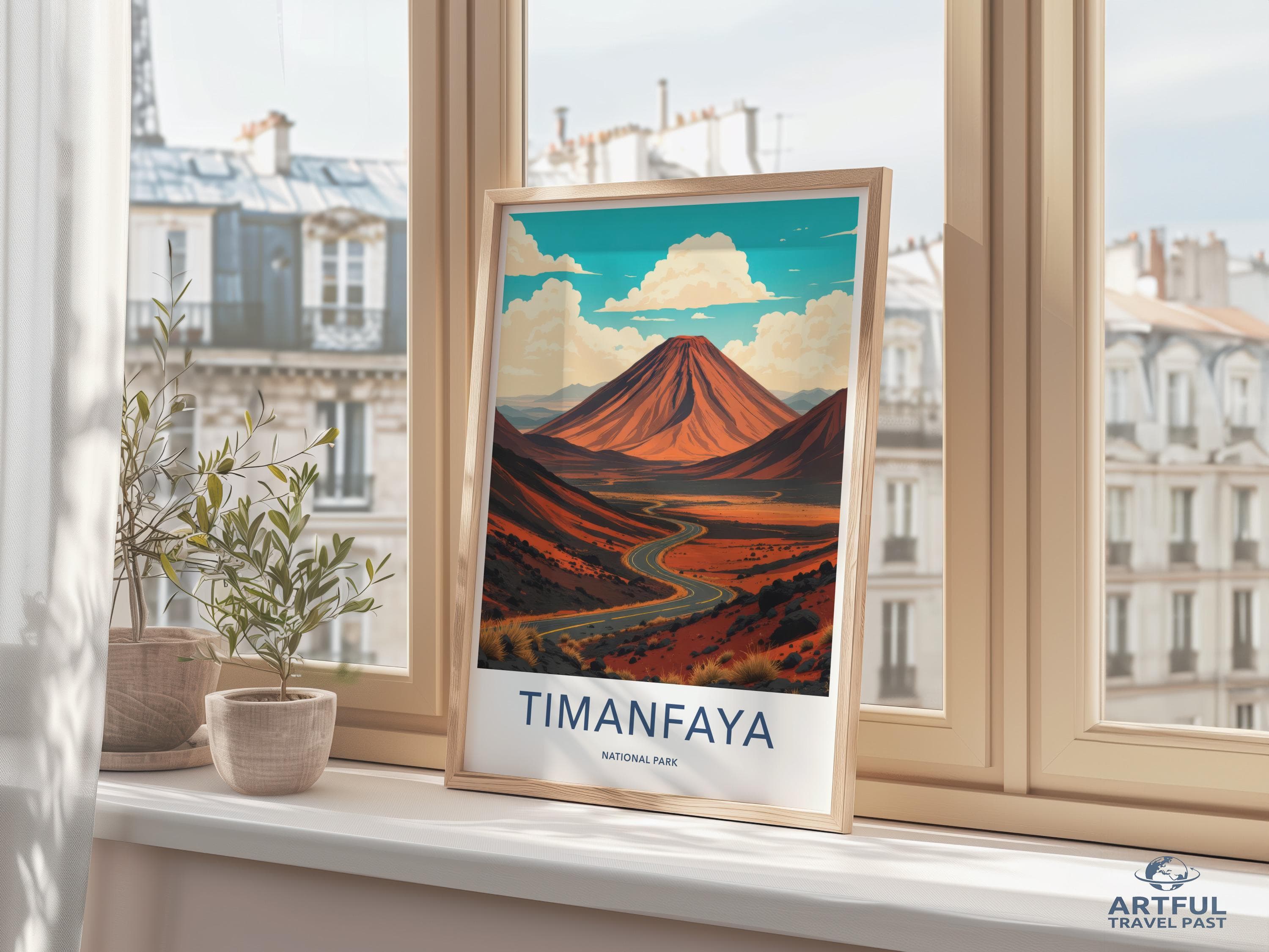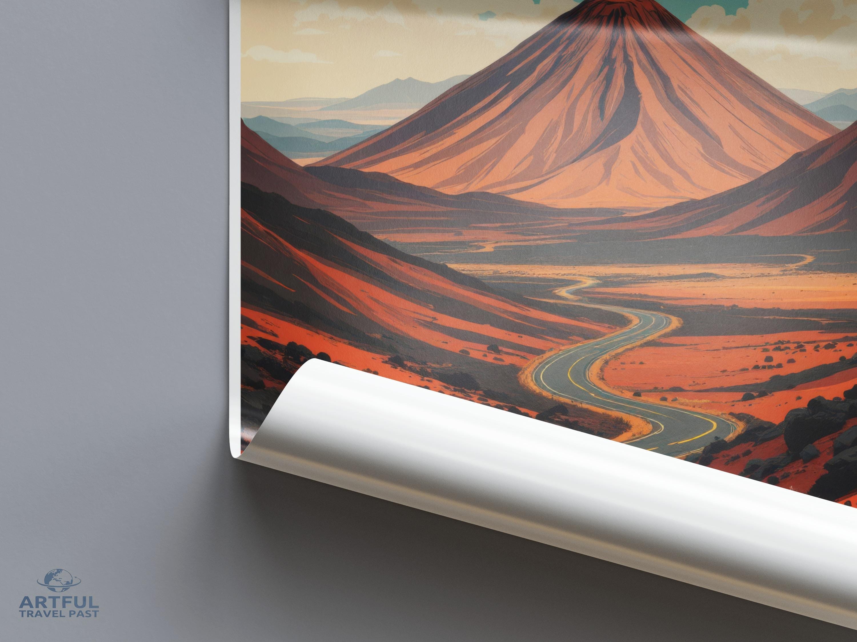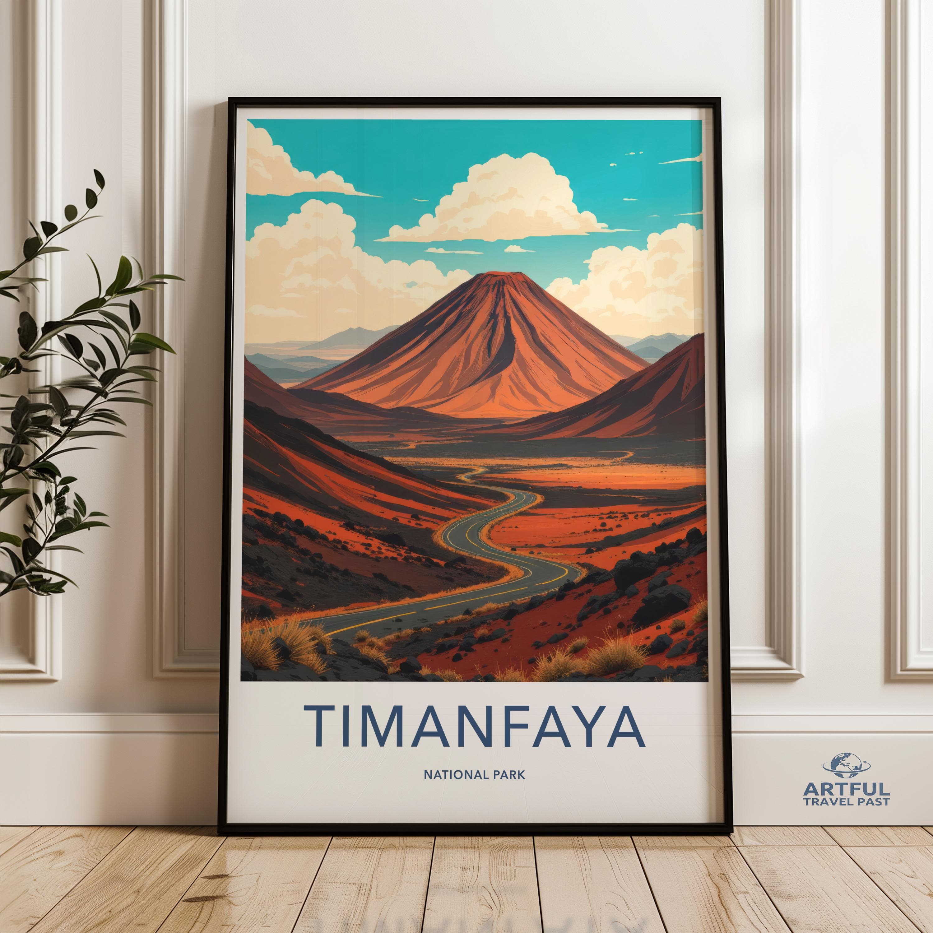 This stunning wall art captures the breathtaking beauty of Timanfaya National Park in Lanzarote, Spain. Known for its volcanic landscape, the park features dramatic, otherworldly terrain formed by eruptions in the 18th century. The contrasting hues of red and black lava fields beneath vibrant blue skies make this landscape a visual marvel. The winding roads invite adventure and exploration, showcasing the unique charm of this UNESCO Biosphere Reserve.