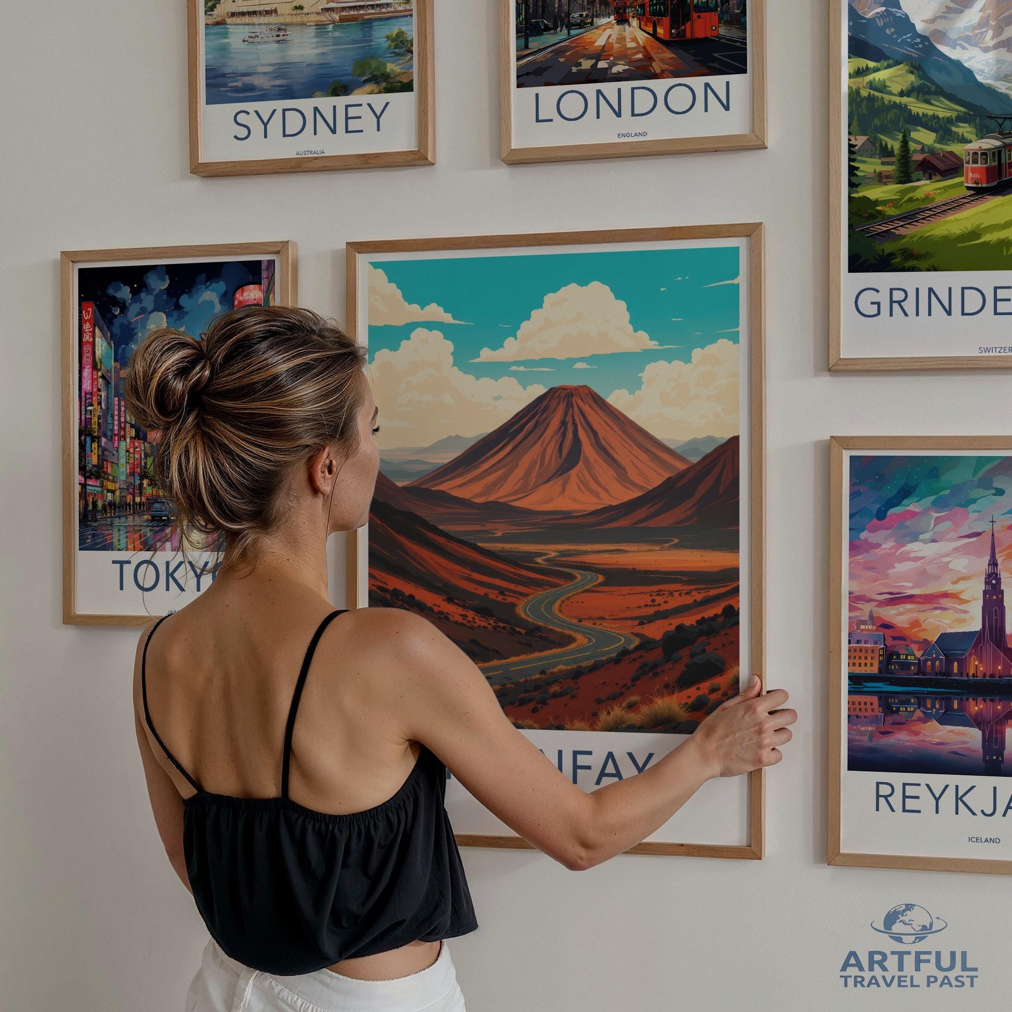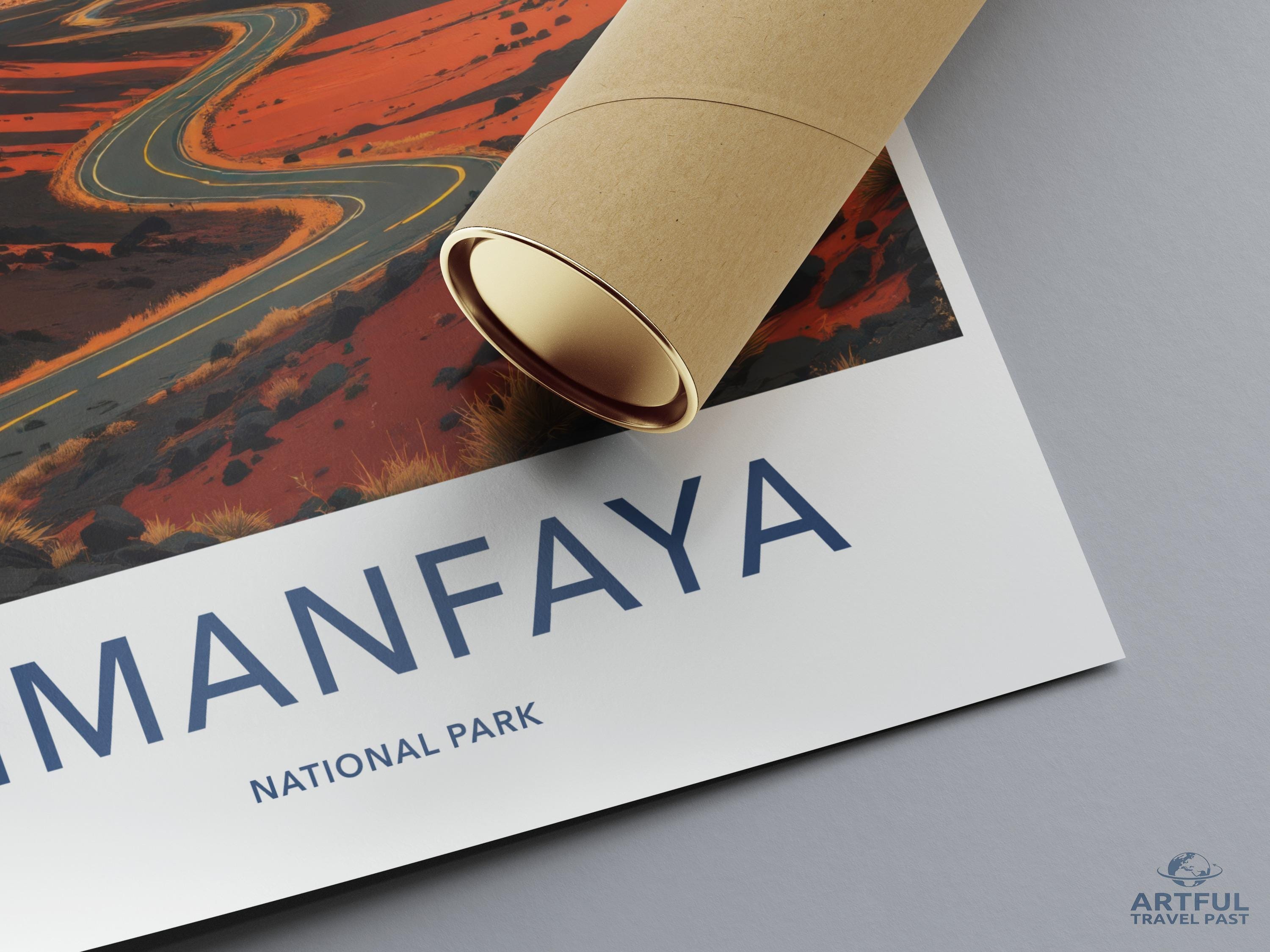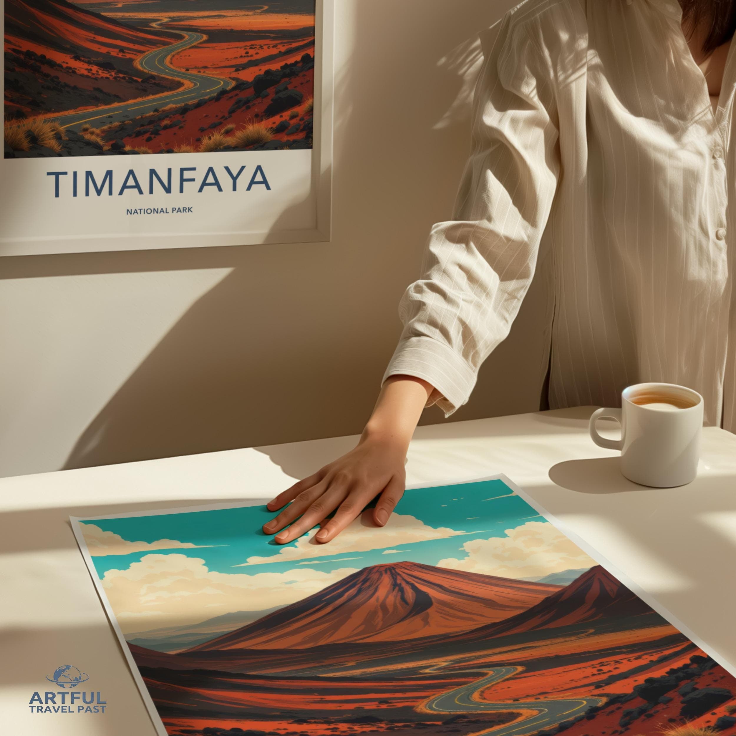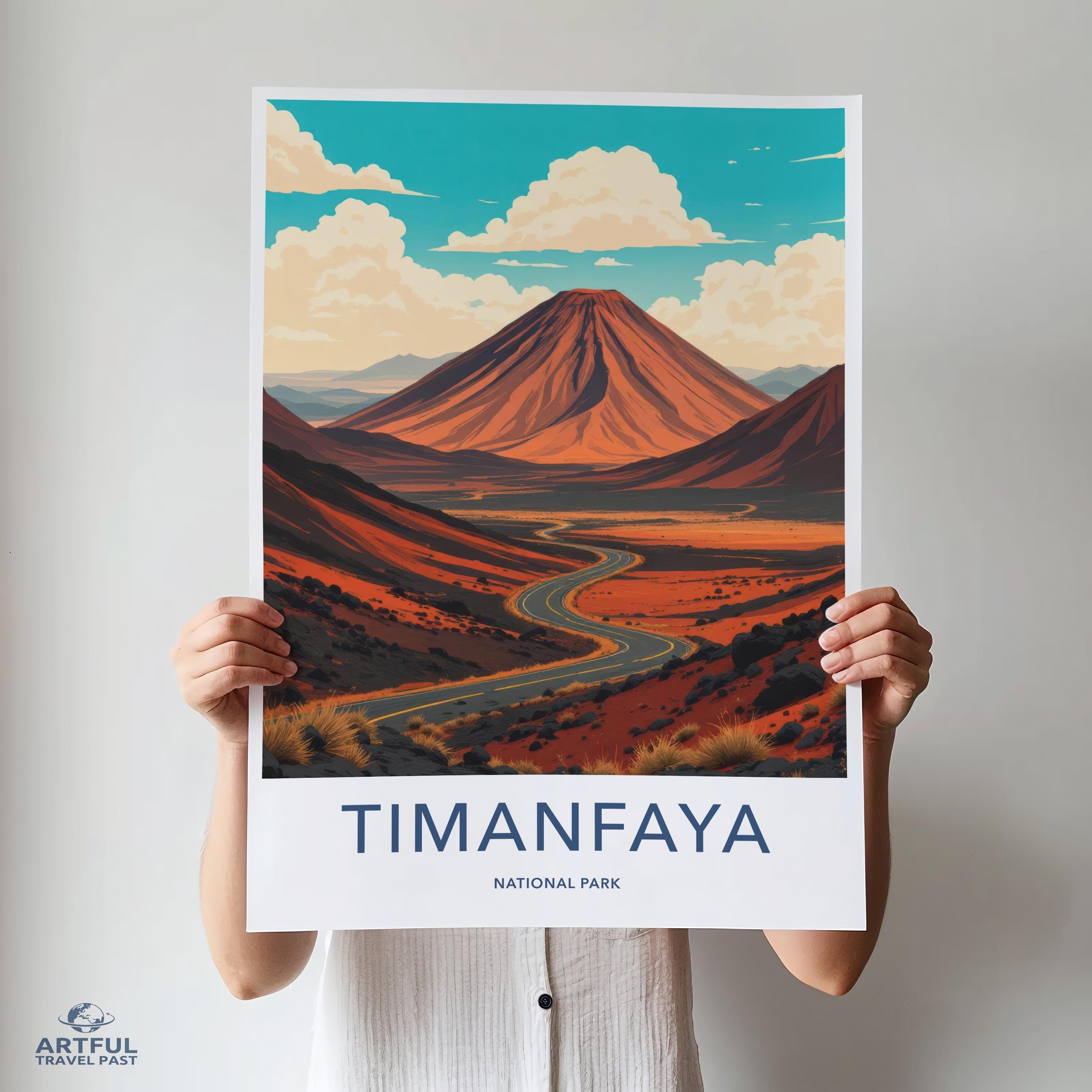 This stunning wall art captures the breathtaking beauty of Timanfaya National Park in Lanzarote, Spain. Known for its volcanic landscape, the park features dramatic, otherworldly terrain formed by eruptions in the 18th century. The contrasting hues of red and black lava fields beneath vibrant blue skies make this landscape a visual marvel. The winding roads invite adventure and exploration, showcasing the unique charm of this UNESCO Biosphere Reserve.