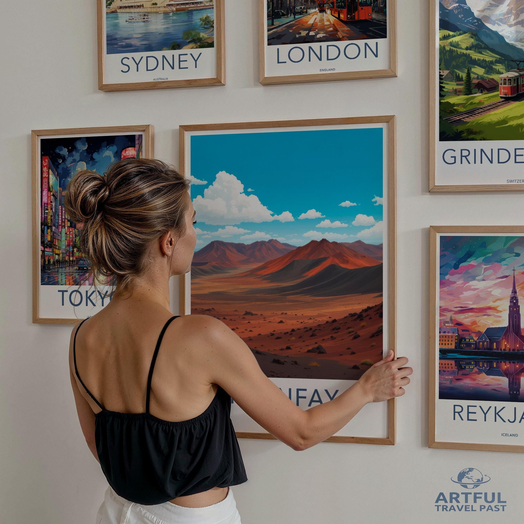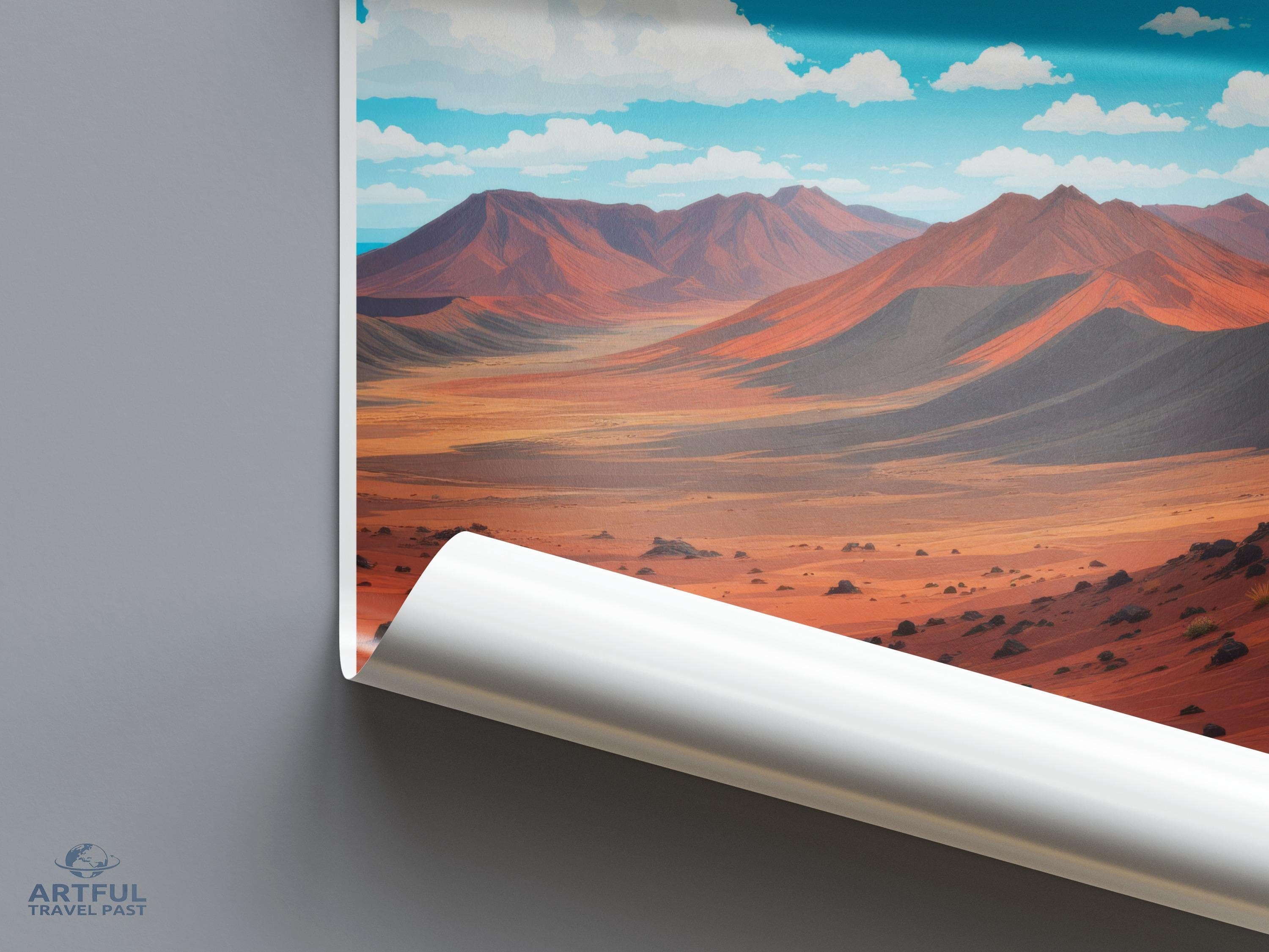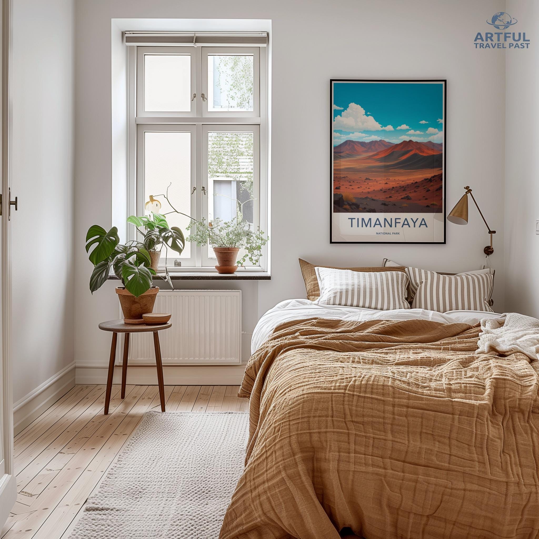 This stunning wall art captures the vibrant beauty of Timanfaya National Park, located on the volcanic island of Lanzarote in the Canary Islands. Known for its otherworldly landscape, created by volcanic eruptions in the 18th century, Timanfaya boasts striking red and black lava fields, geothermal geysers, and rugged terrain. The park’s unique geological formations and dramatic scenery make it a mesmerizing and unforgettable destination.