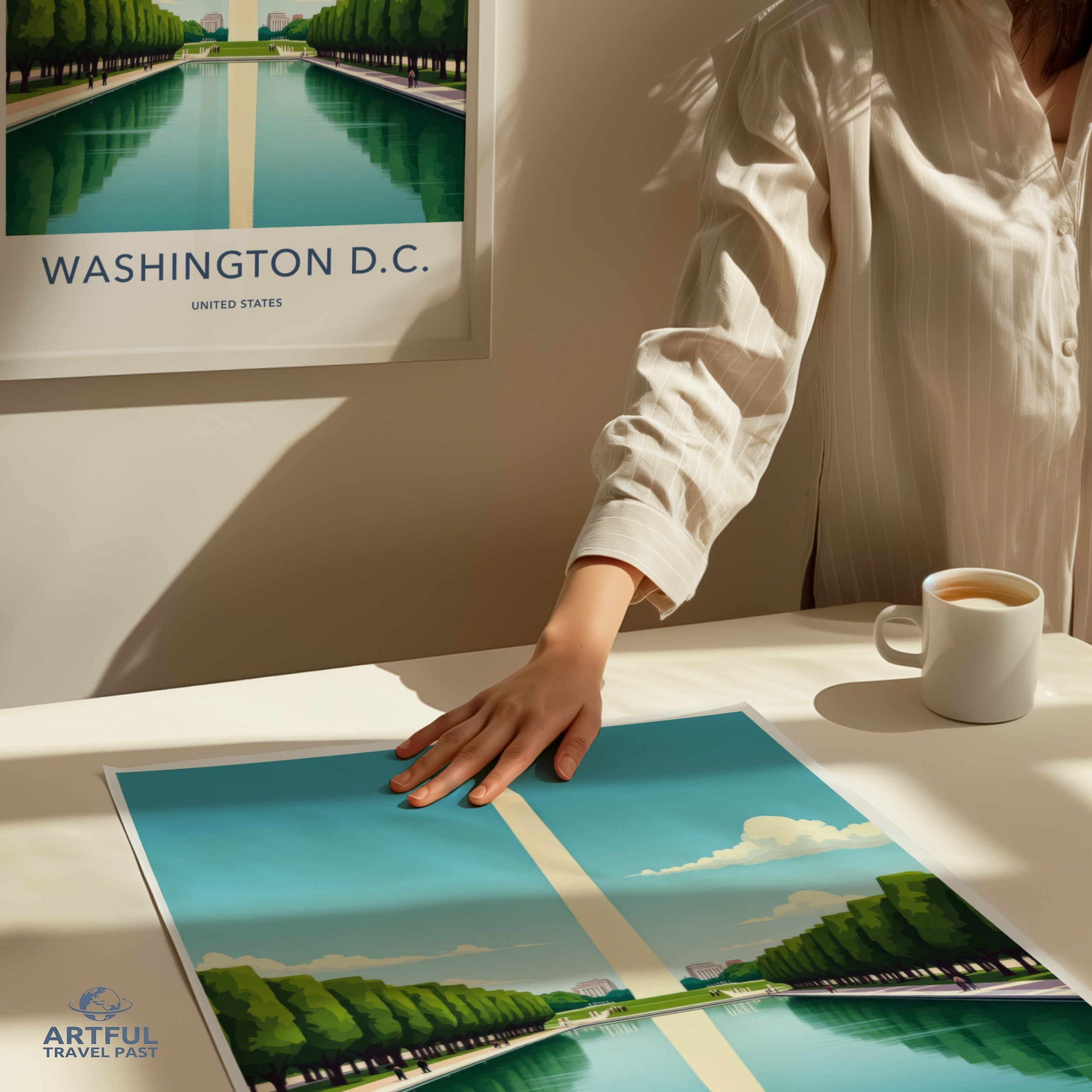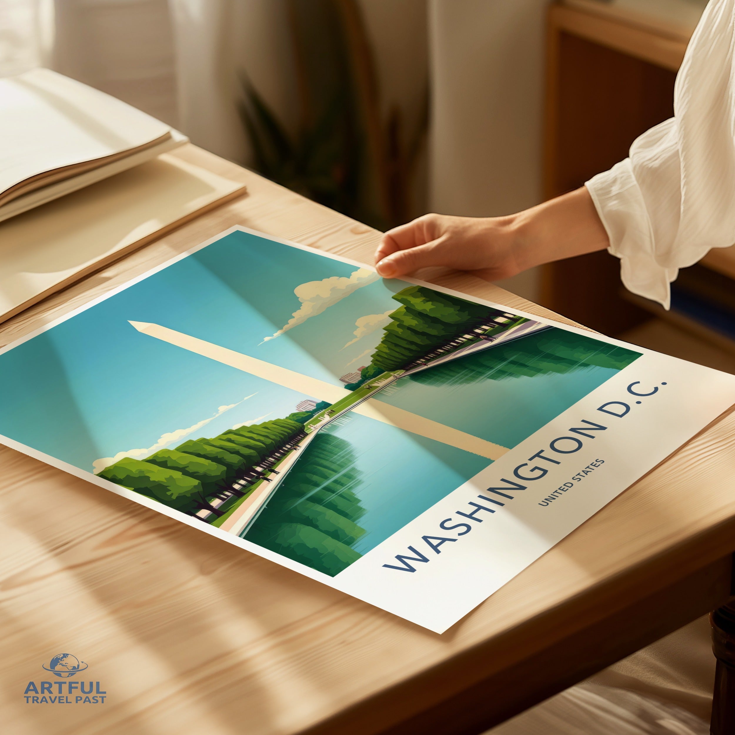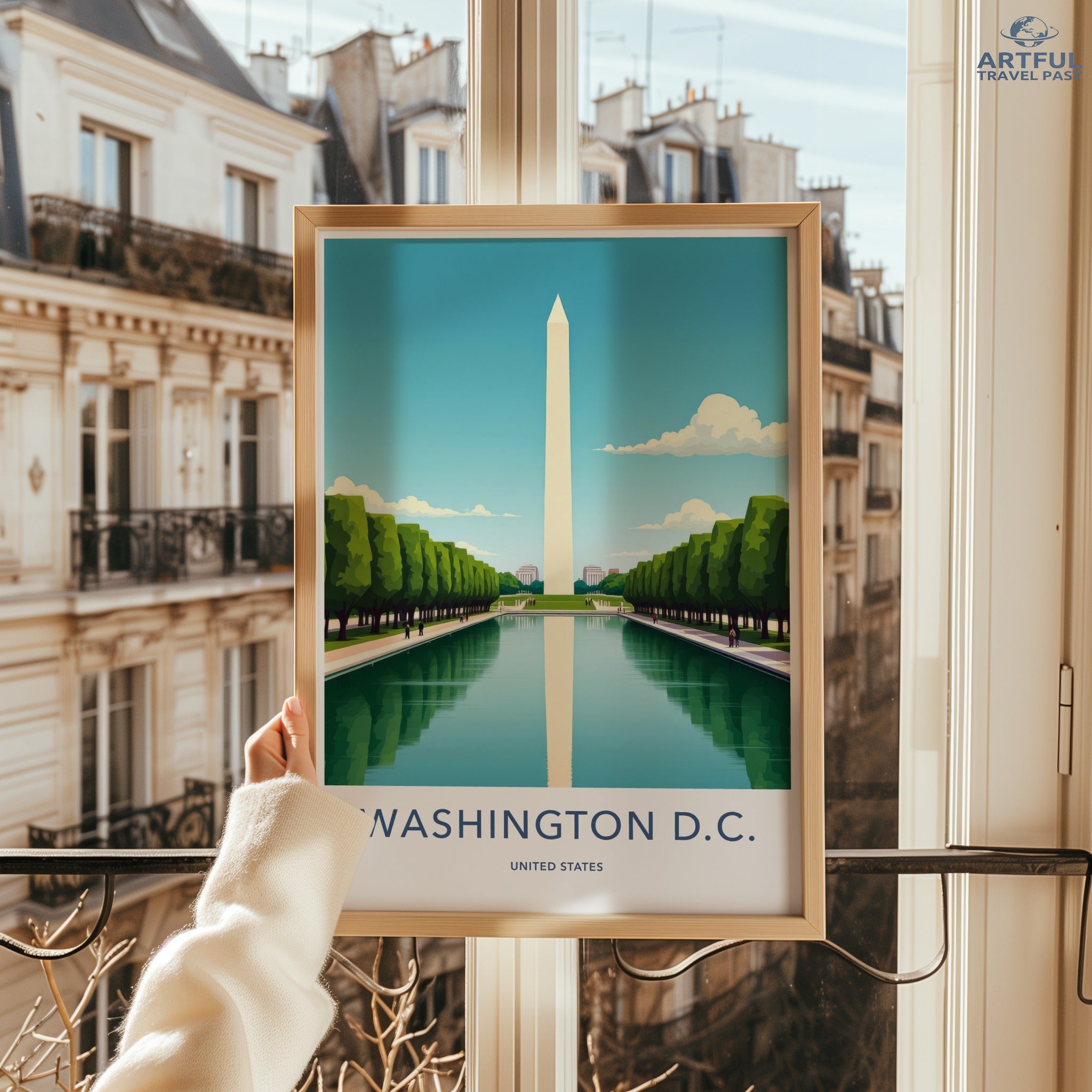 Capture the iconic essence of Washington D.C. with this stunning wall art, featuring the majestic Washington Monument. Standing tall and proud, the monument overlooks the serene Reflecting Pool, framed by lush trees and clear blue skies. Established in 1885, this historic landmark symbolizes the nation's capital's rich heritage and significance. Perfect for adding a touch of architectural grandeur and patriotic spirit to any space.