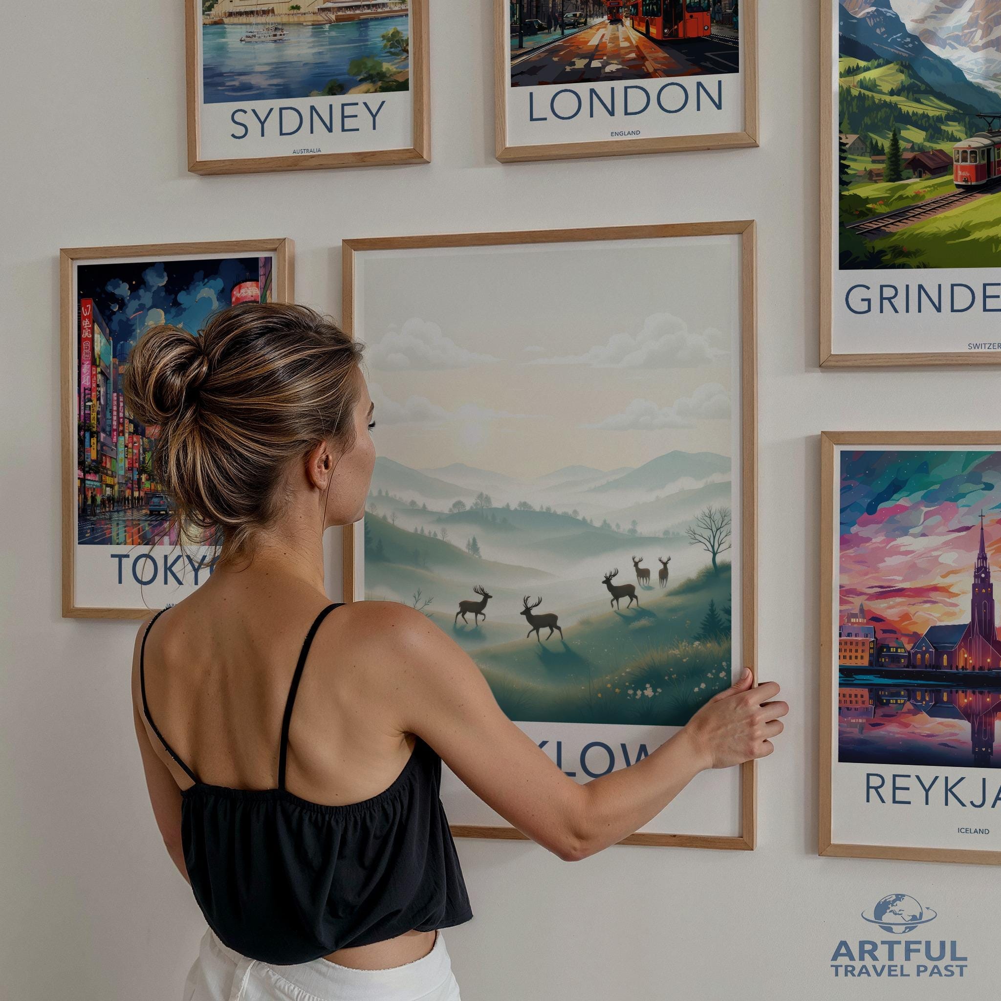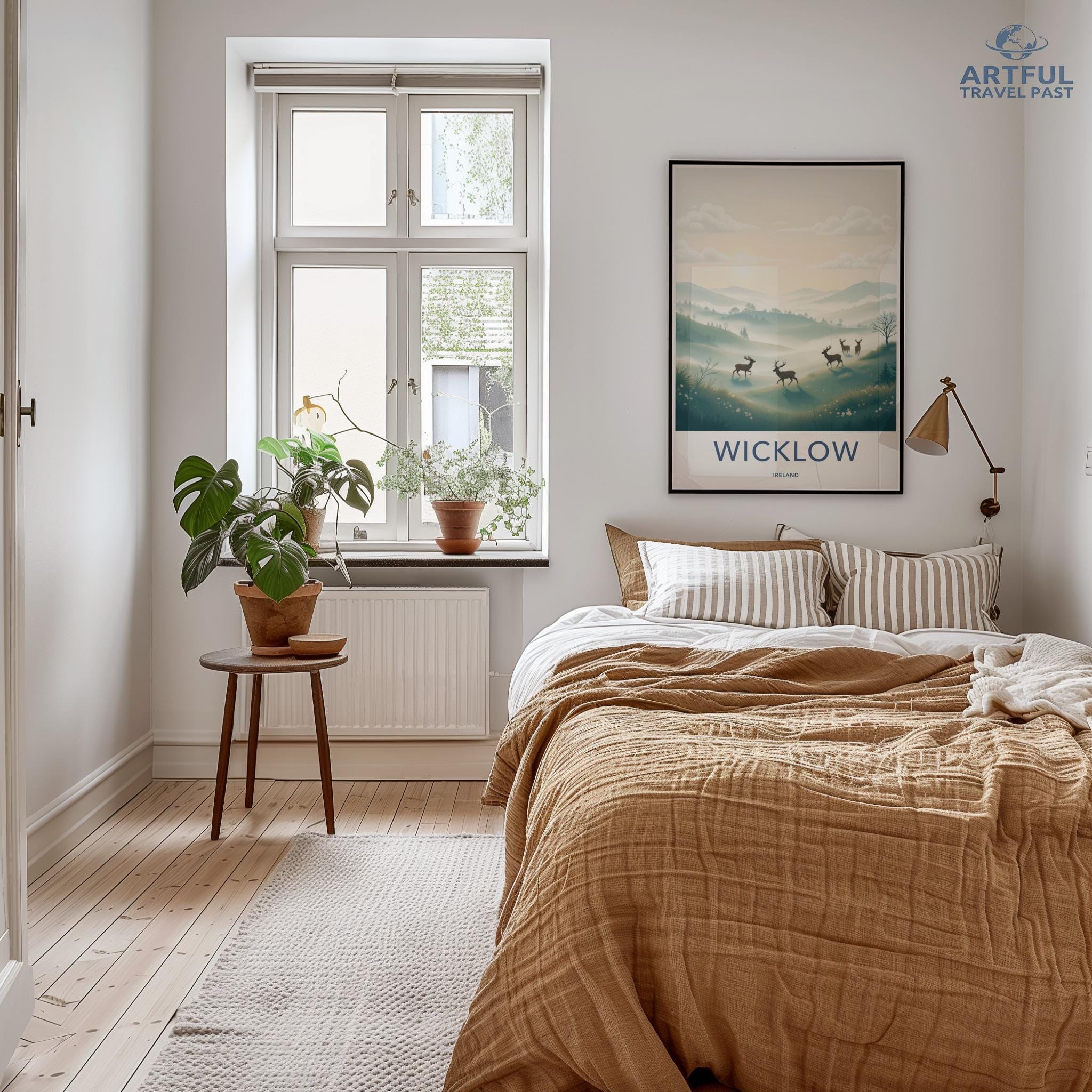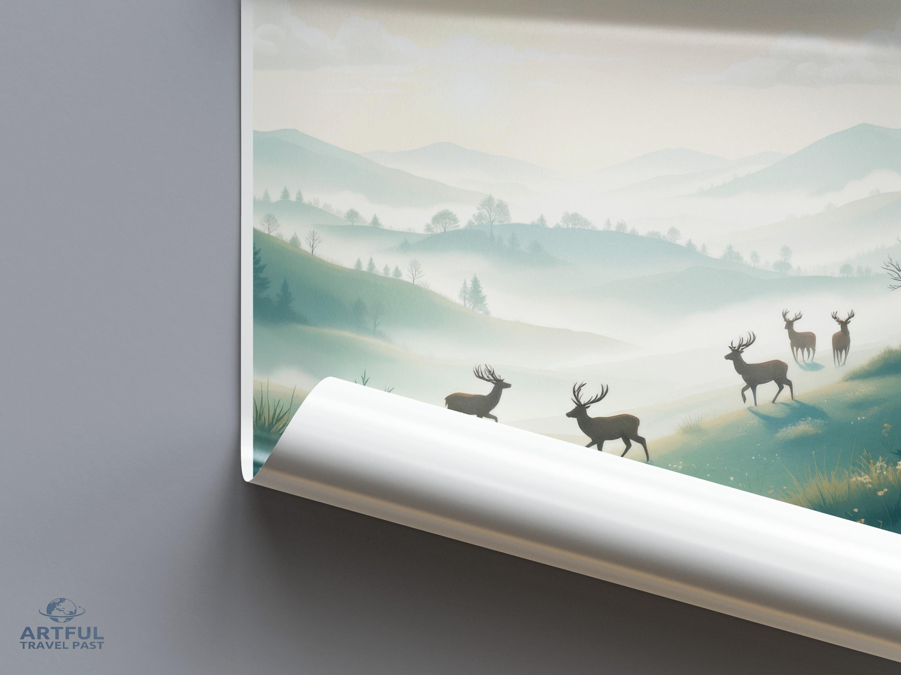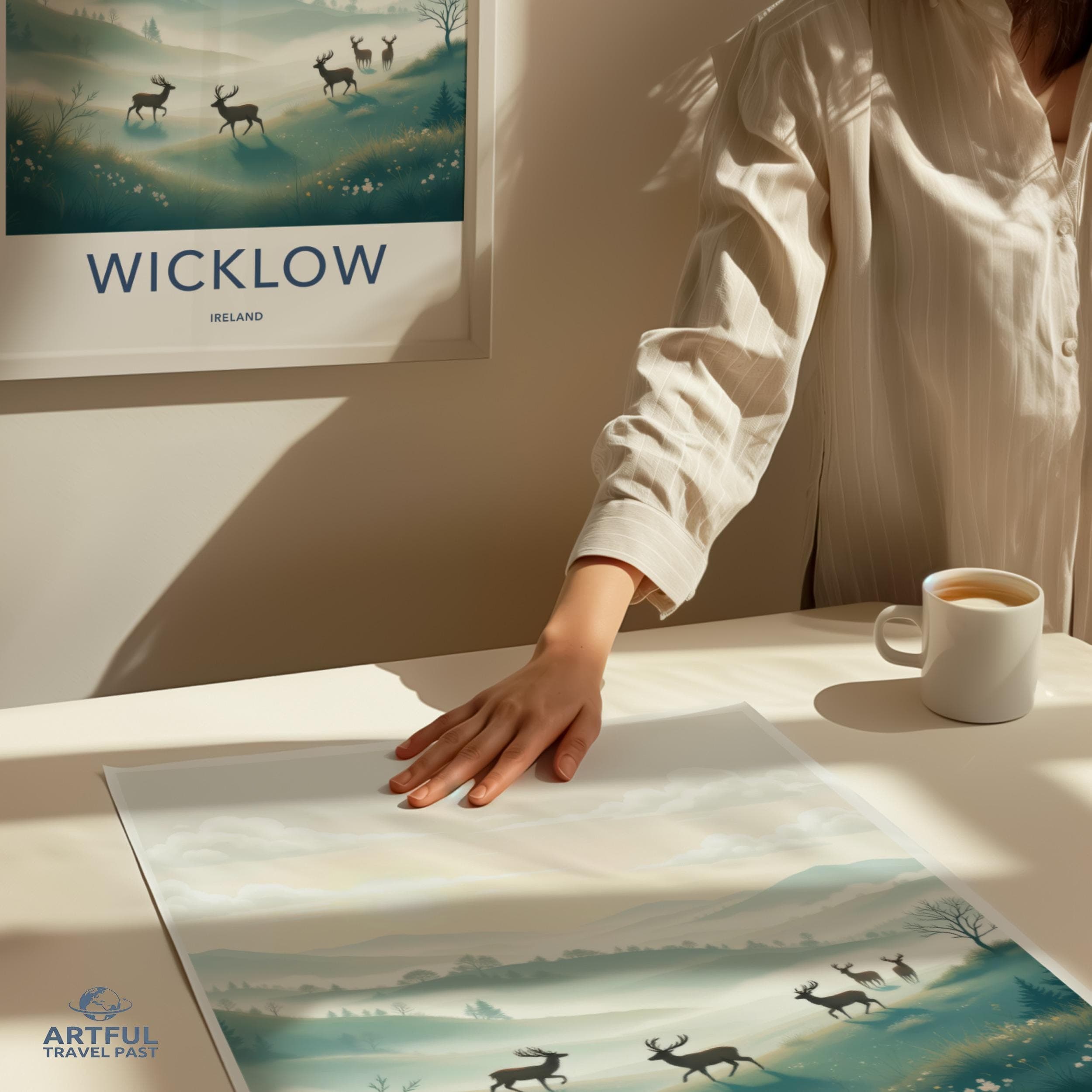Transform your space with this stunning depiction of Wicklow, Ireland. Nestled in rolling hills and picturesque valleys, Wicklow is renowned for its lush landscapes and tranquil ambiance. Known as the "Garden of Ireland," it boasts an array of historical landmarks like Glendalough's ancient monastic site. This artwork beautifully captures Wicklow’s serene beauty with a misty morning scene, complete with majestic deer roaming freely.