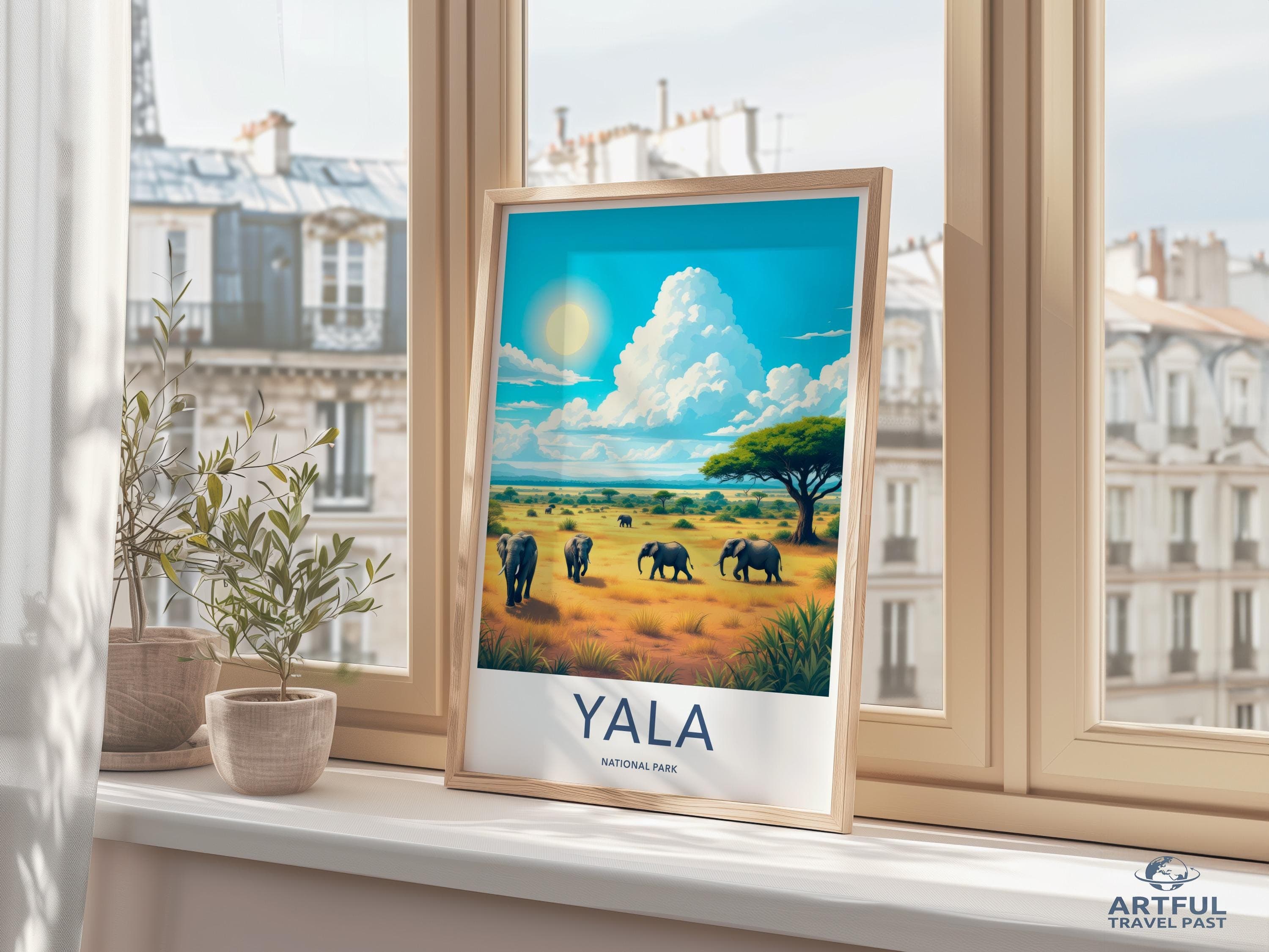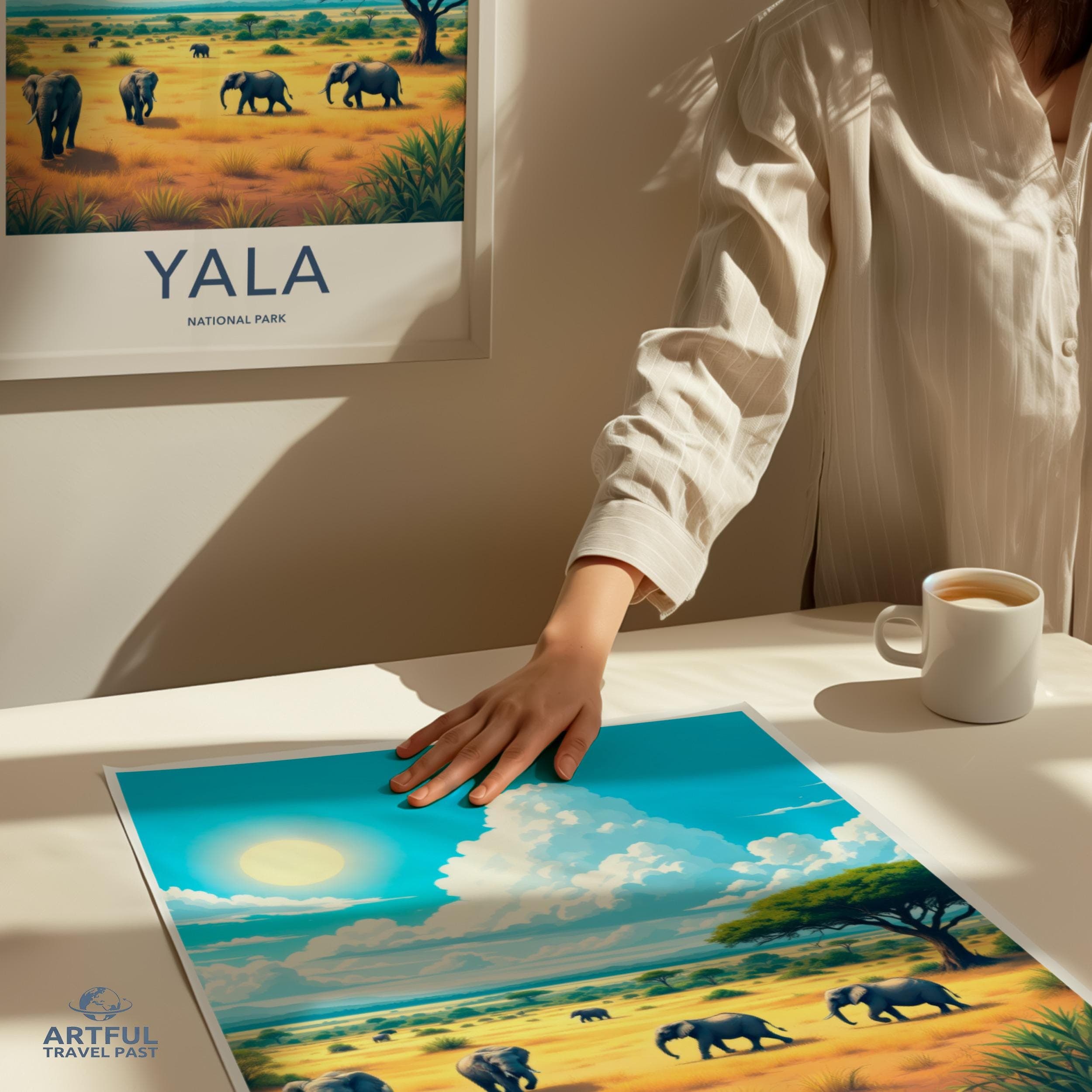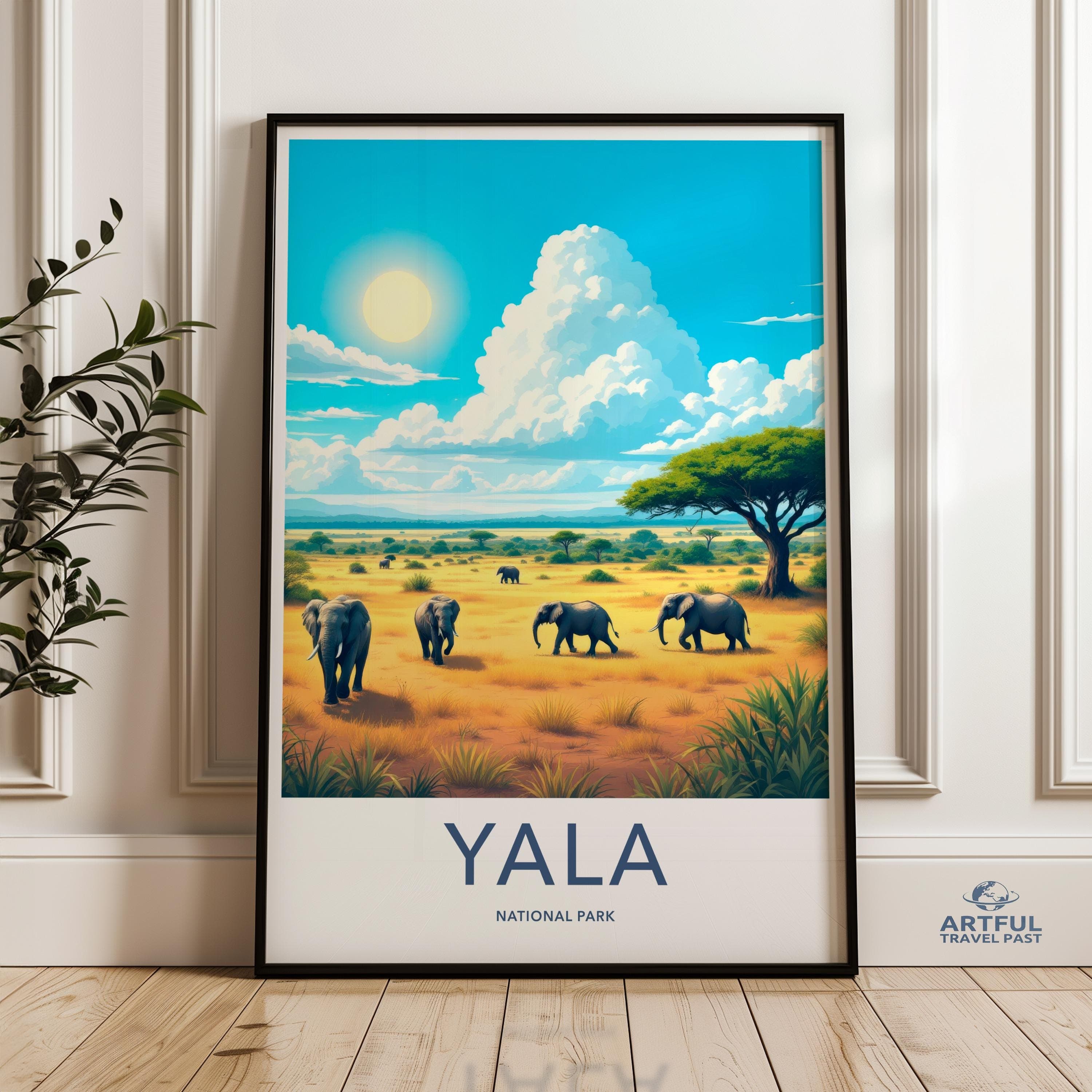 Immerse yourself in the vibrant landscape of Yala National Park with this stunning wall art. Nestled in Sri Lanka, Yala is renowned for its rich biodiversity and ancient history. Experience the majesty of wild elephants roaming against a backdrop of lush forests and open plains. The clear blue sky, punctuated by towering clouds, adds to the enchanting beauty of this natural paradise. Perfect for nature lovers and wildlife enthusiasts!