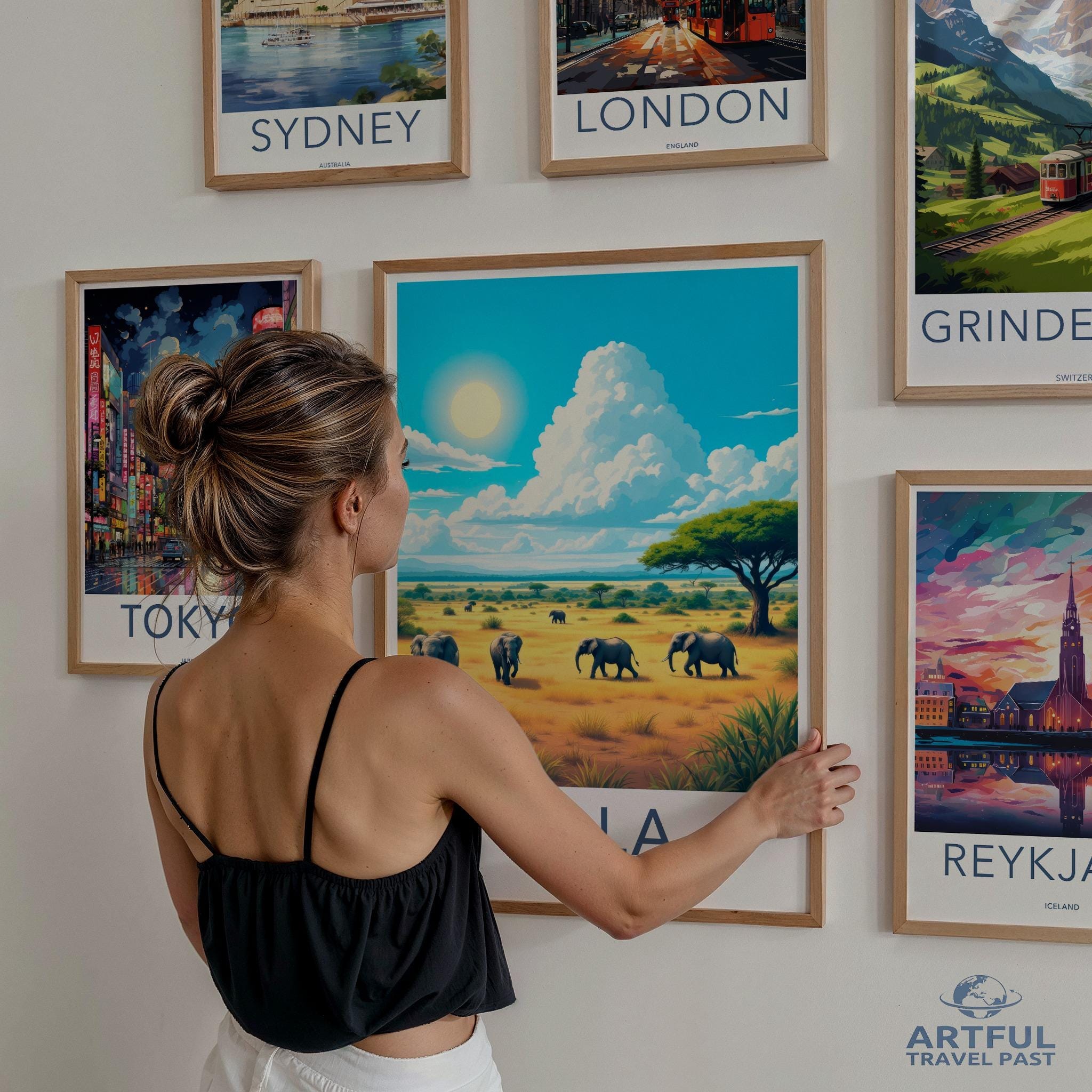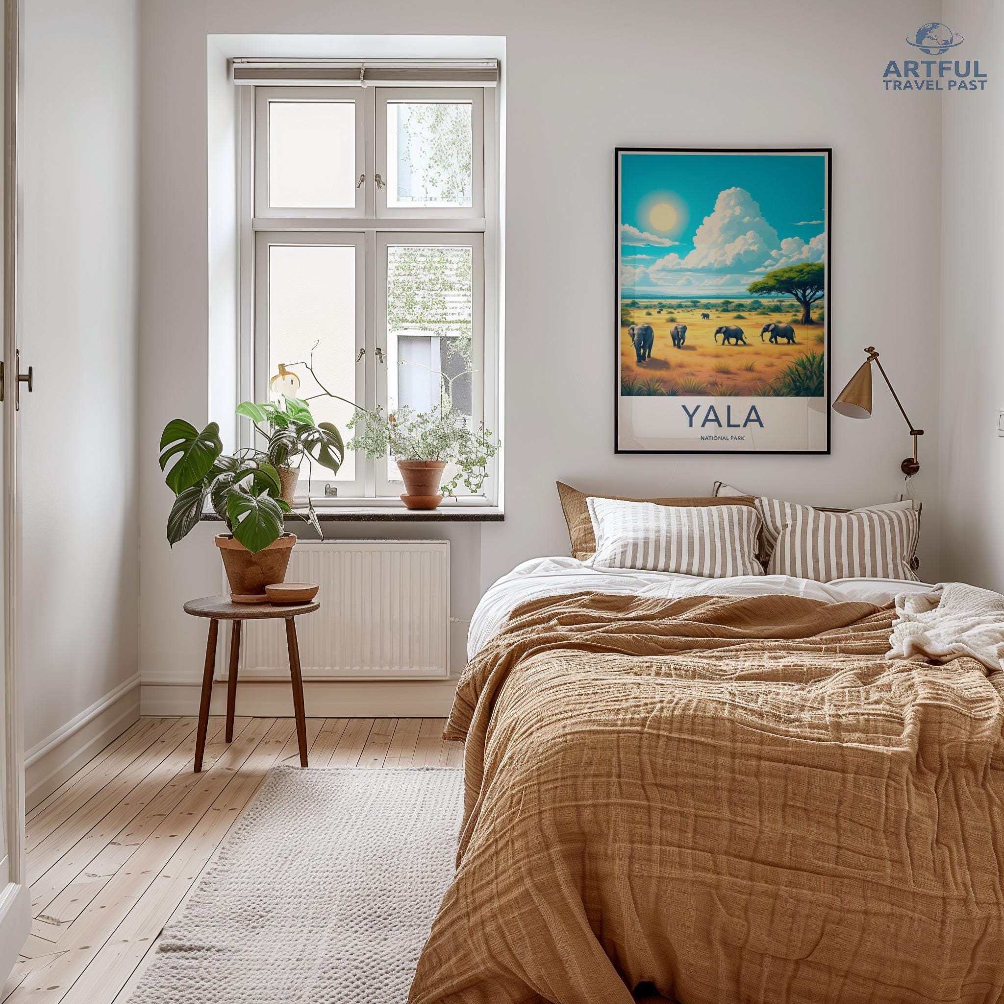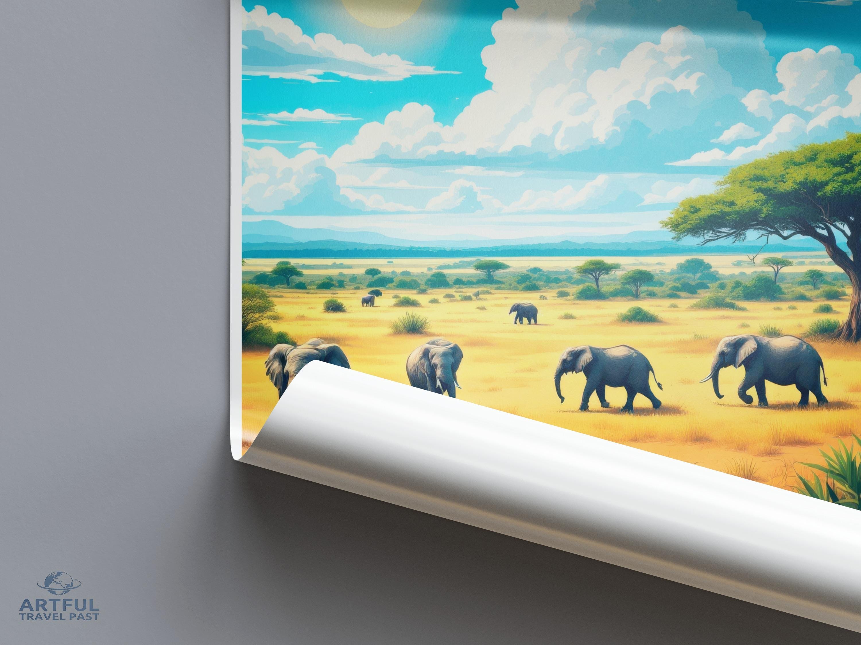 Immerse yourself in the vibrant landscape of Yala National Park with this stunning wall art. Nestled in Sri Lanka, Yala is renowned for its rich biodiversity and ancient history. Experience the majesty of wild elephants roaming against a backdrop of lush forests and open plains. The clear blue sky, punctuated by towering clouds, adds to the enchanting beauty of this natural paradise. Perfect for nature lovers and wildlife enthusiasts!