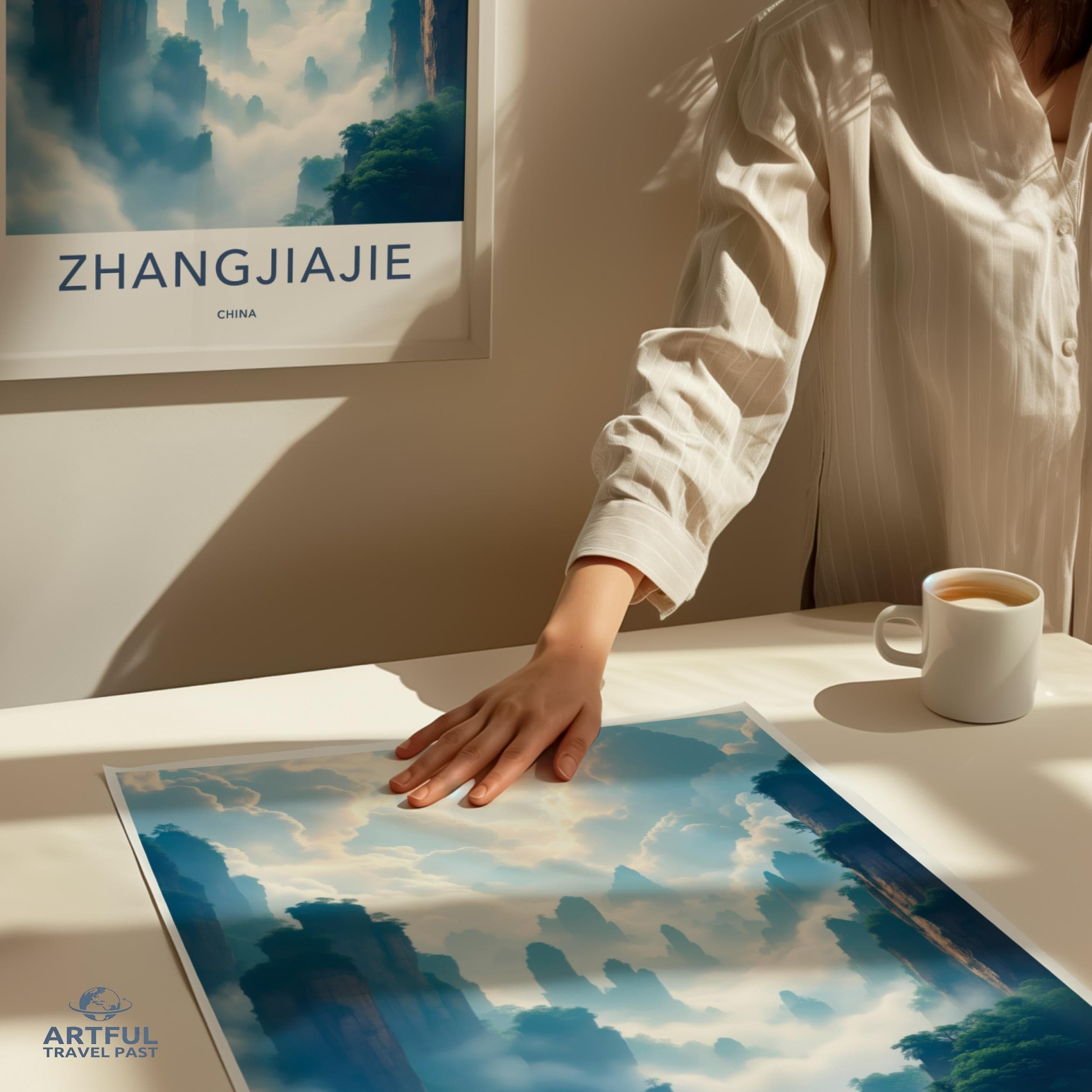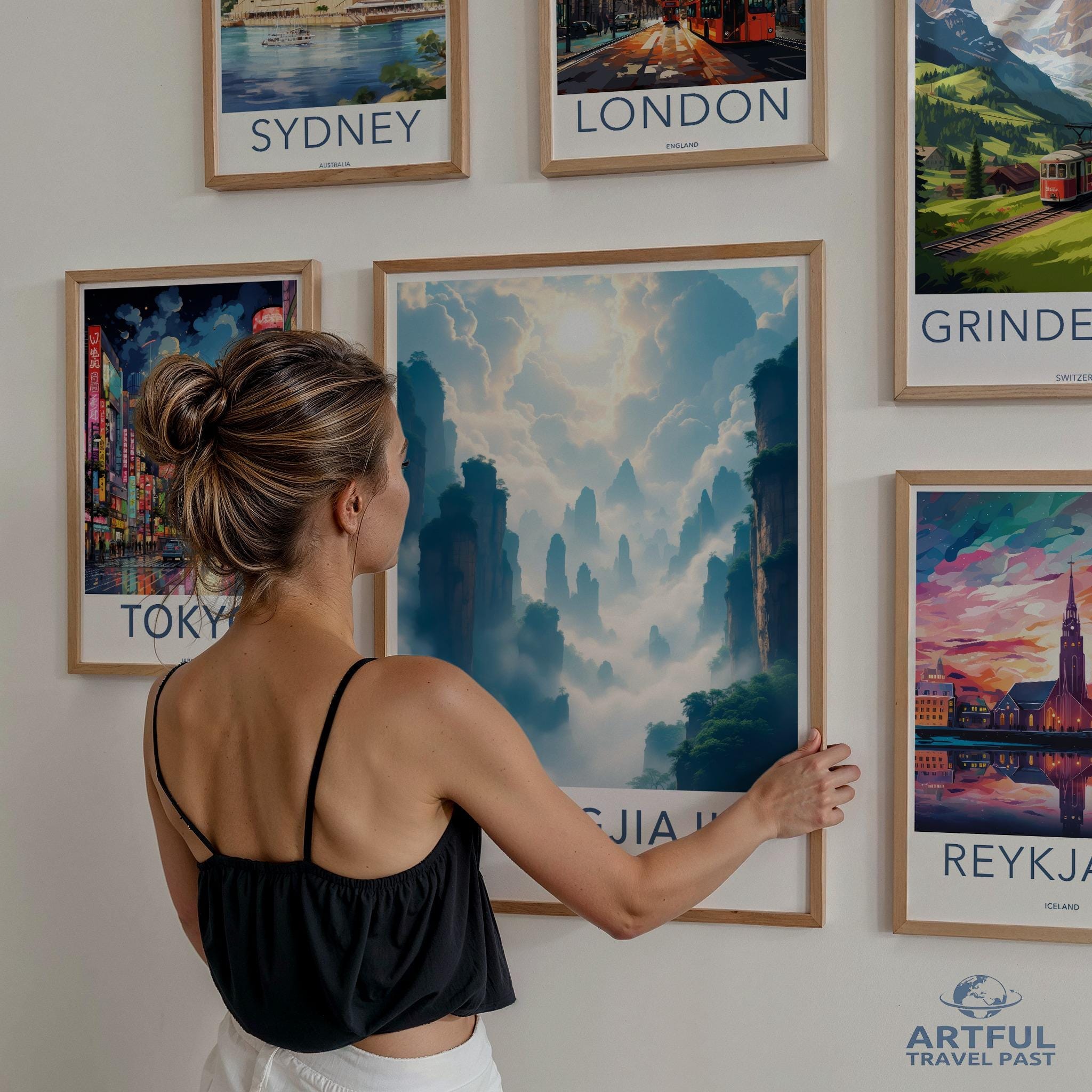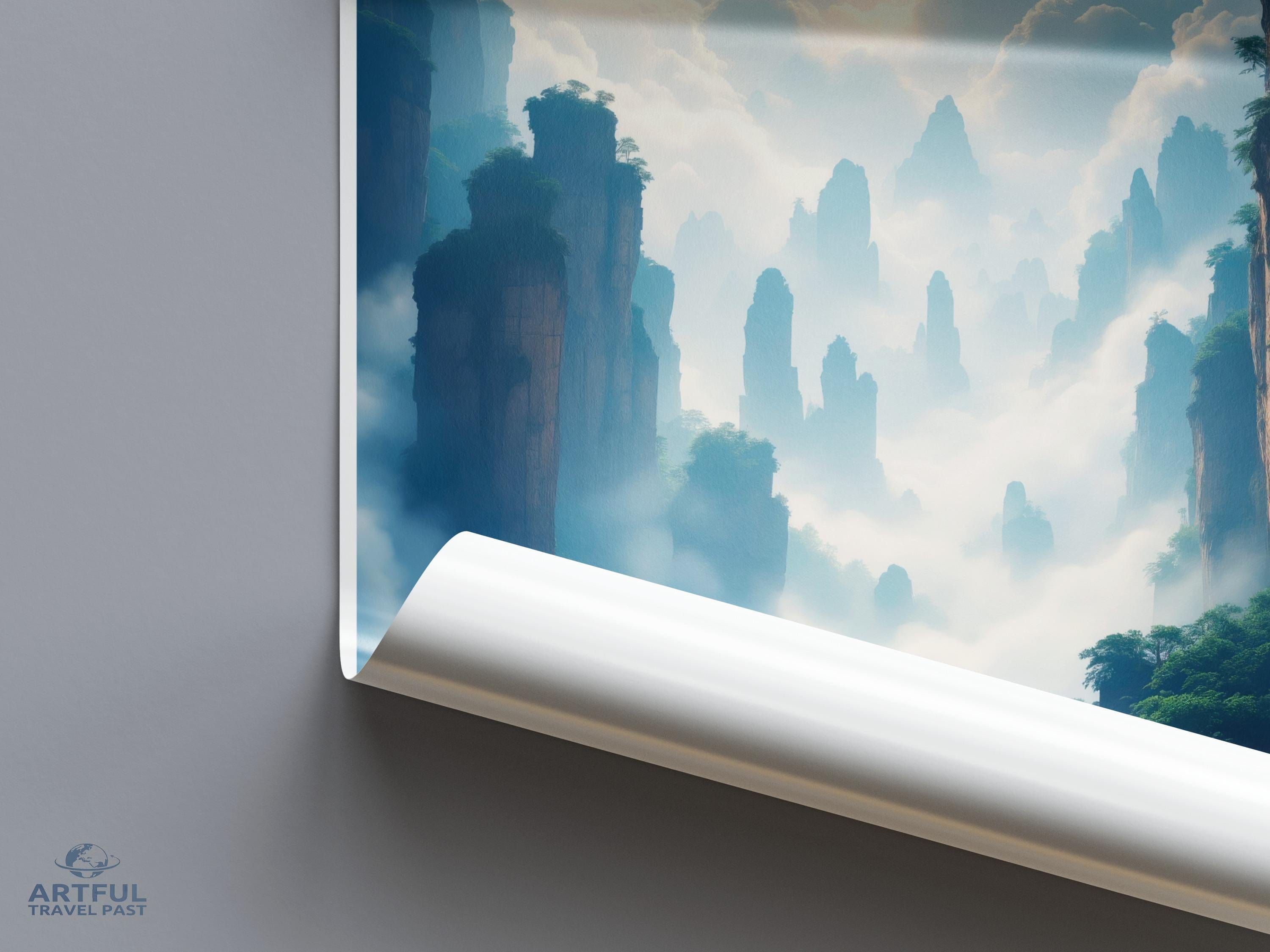 Transform your space with this breathtaking wall art featuring Zhangjiajie, China. Famous for its majestic mountains and mist-shrouded vistas, Zhangjiajie inspired the floating Hallelujah Mountains in the movie Avatar. These towering sandstone pillars, lush greenery, and ethereal clouds create a dreamlike landscape. Steeped in history and folklore, this UNESCO World Heritage site is renowned for its natural beauty and dramatic scenery. Bring a touch of this mystical, awe-inspiring place into your home!