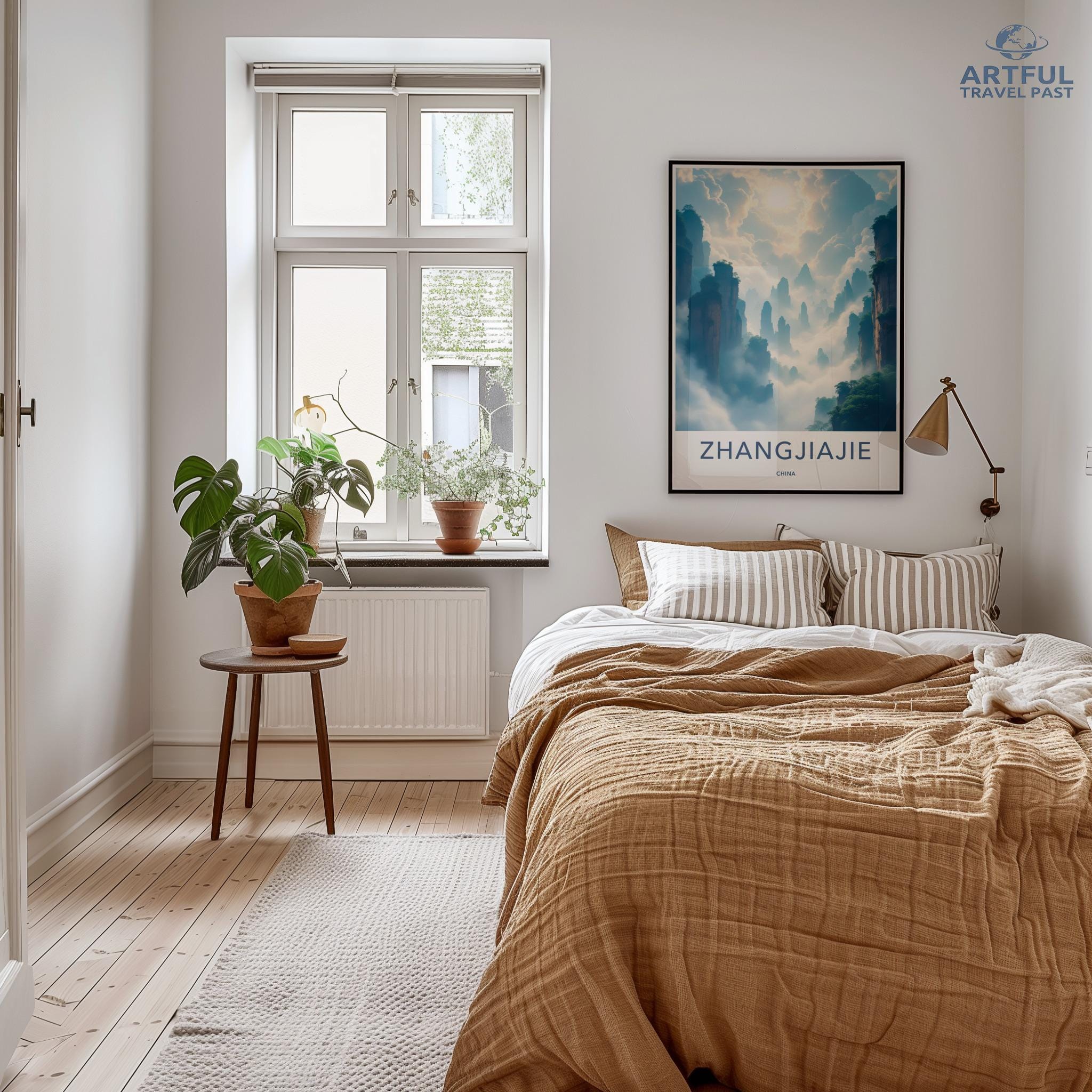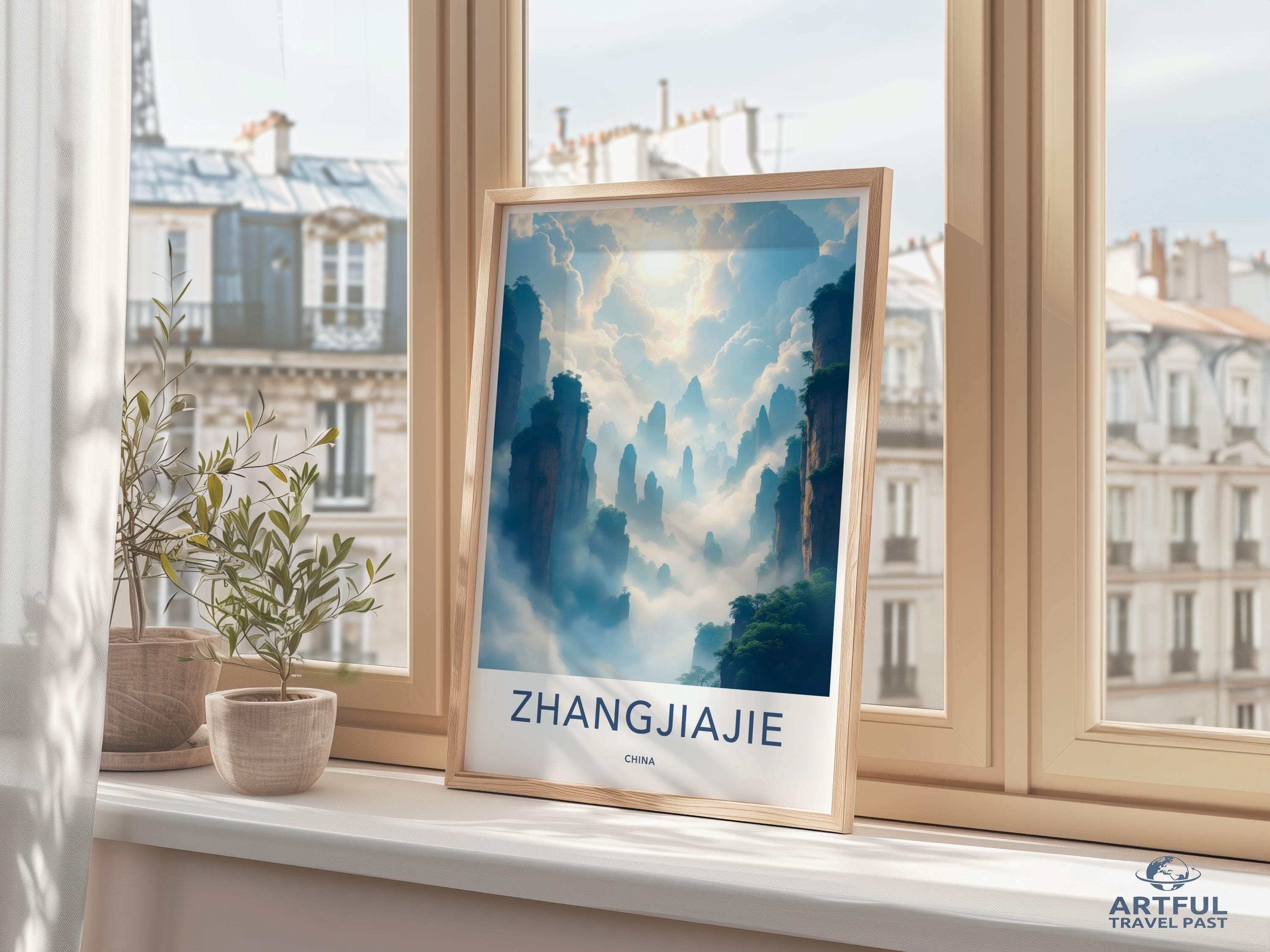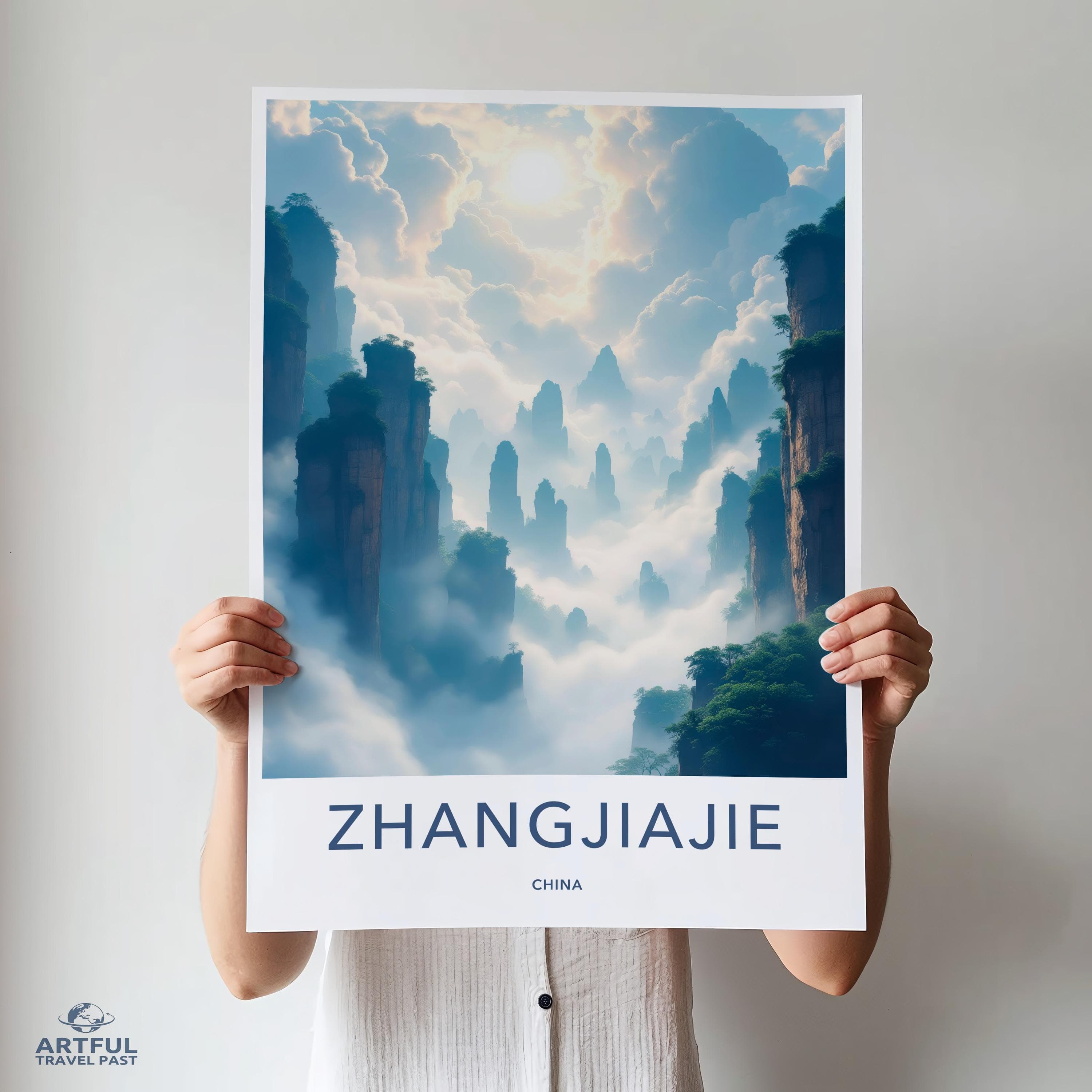 Transform your space with this breathtaking wall art featuring Zhangjiajie, China. Famous for its majestic mountains and mist-shrouded vistas, Zhangjiajie inspired the floating Hallelujah Mountains in the movie Avatar. These towering sandstone pillars, lush greenery, and ethereal clouds create a dreamlike landscape. Steeped in history and folklore, this UNESCO World Heritage site is renowned for its natural beauty and dramatic scenery. Bring a touch of this mystical, awe-inspiring place into your home!